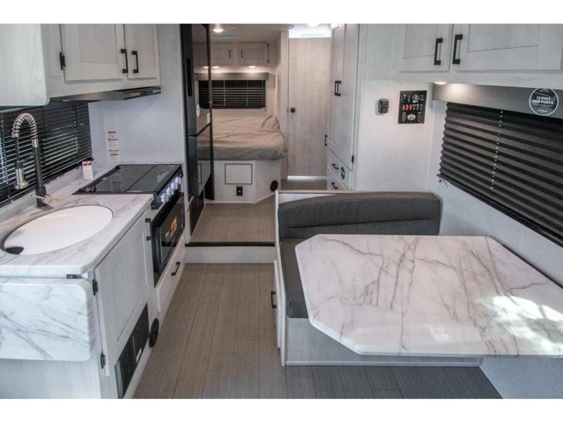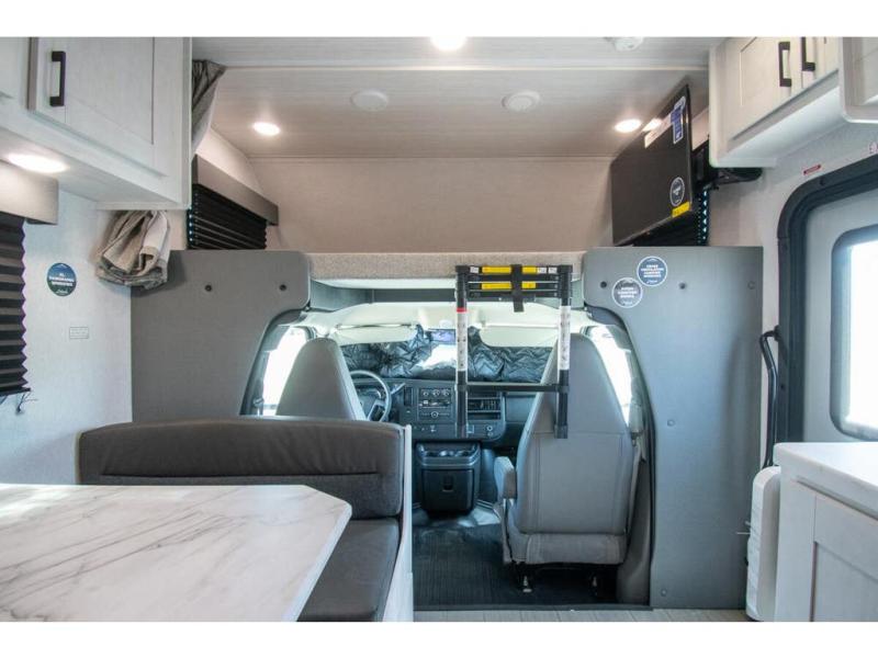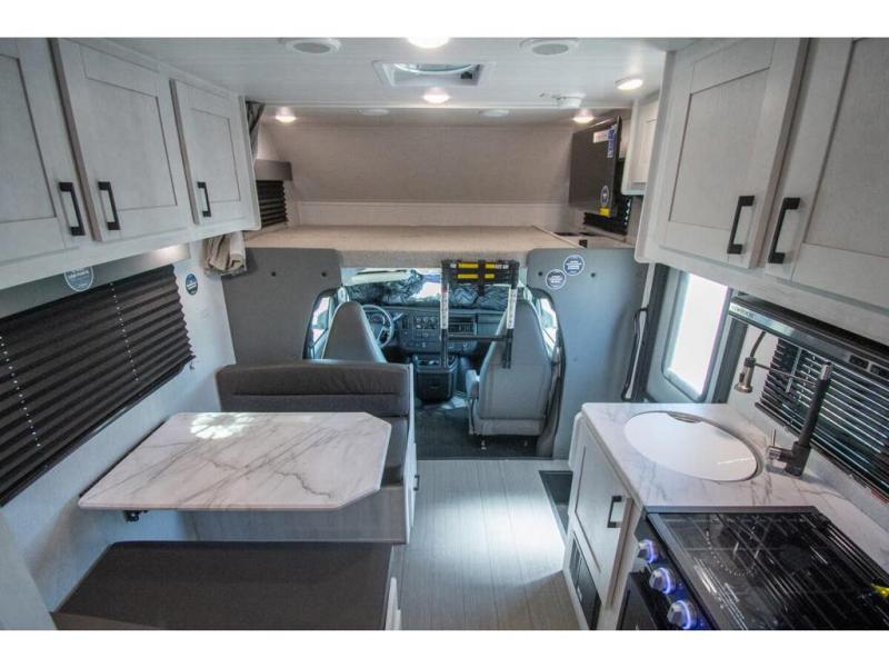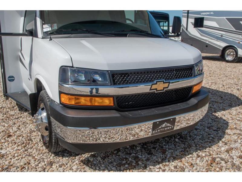 With any Entrada Class C gas motorhome from EAST TO WEST, the construction consists of a one-piece painted fiberglass front cap, a TPO roof membrane, and 2" Azdel composite sidewalls for added durability. There are rotocast exterior storage compartments with slam latch doors, along with an exterior LP Quick Connect, and a power awning with an LED light strip. You will also find rear and sideview cameras to help make maneuvering and parking your RV easier than ever. Inside, you'll feel right at home with soft close hardwood cabinet doors and drawers, a high-altitude tankless water heater, plus a 12V smart TV and USB ports to keep your electronics charged up!