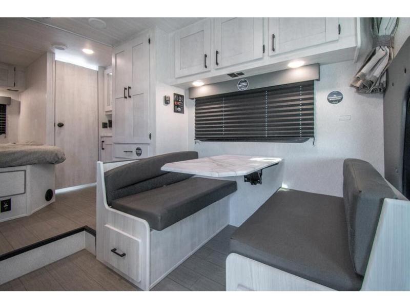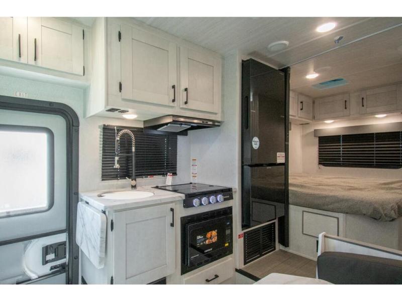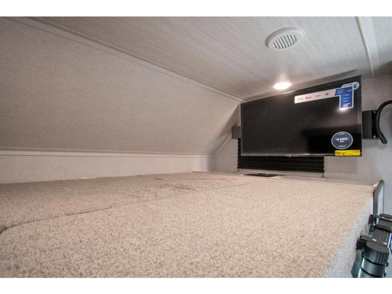 You're going to love traveling and camping in this coach that can sleep five to six each night. The convection microwave and 10.7 cu. ft. 12V refrigerator will let you cook and store food, and the booth dinette provides a place to dine together. A private bath includes a shower and toilet, with the sink just outside this room so two people can freshen up at once. You will sleep soundly each night on the rear corner queen bed with overhead storage for your belongings, while the little ones take the 60" x 80" bunk over cab!