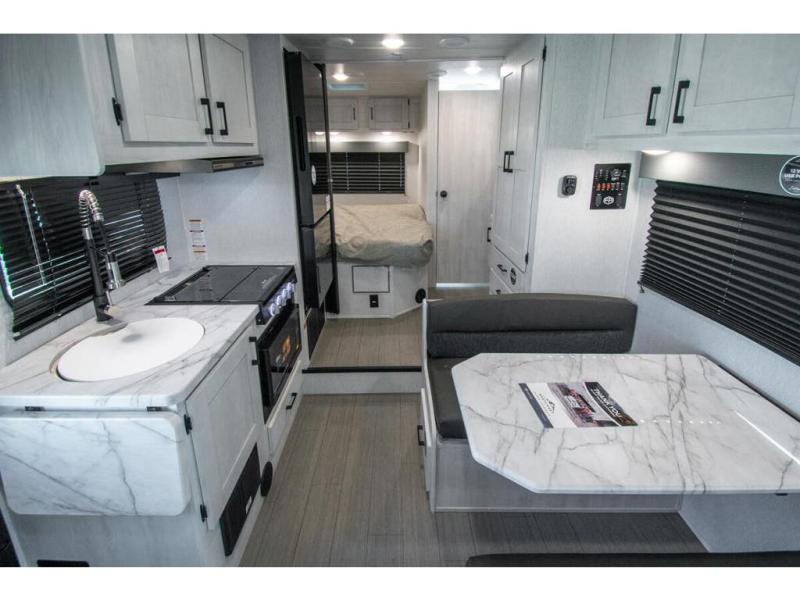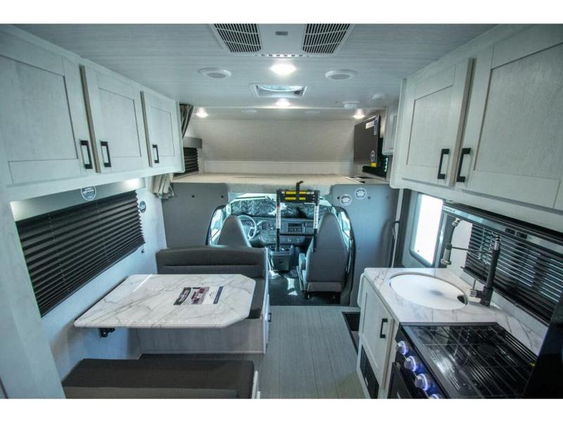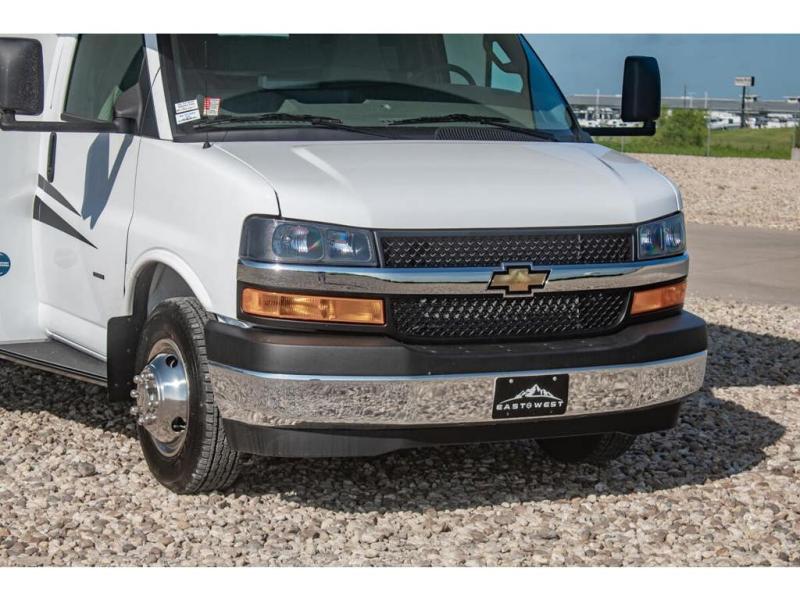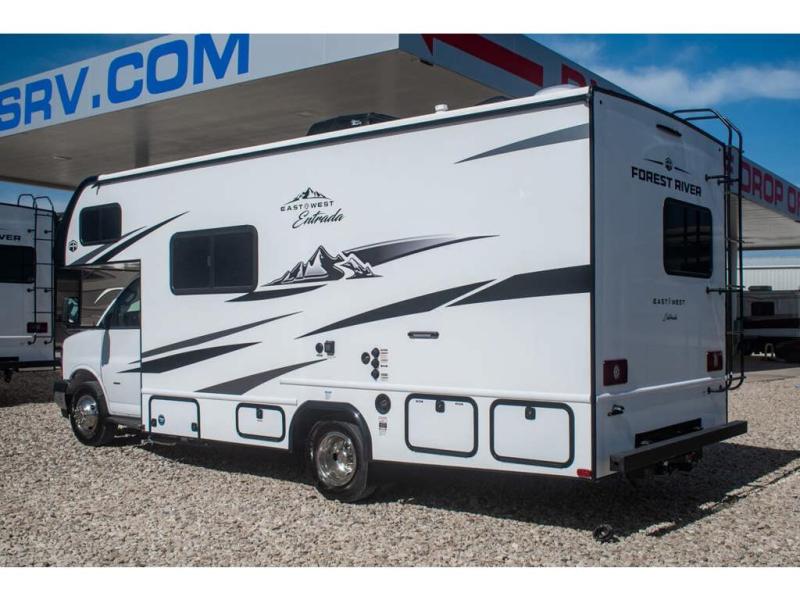 With any Entrada Class C gas motorhome from EAST TO WEST, the construction consists of a one-piece painted fiberglass front cap, a TPO roof membrane, and 2" Azdel composite sidewalls for added durability. There are rotocast exterior storage compartments with slam latch doors, along with an exterior LP Quick Connect, and a power awning with an LED light strip. You will also find rear and sideview cameras to help make maneuvering and parking your RV easier than ever. Inside, you'll feel right at home with soft close hardwood cabinet doors and drawers, a high-altitude tankless water heater, plus a 12V smart TV and USB ports to keep your electronics charged up!