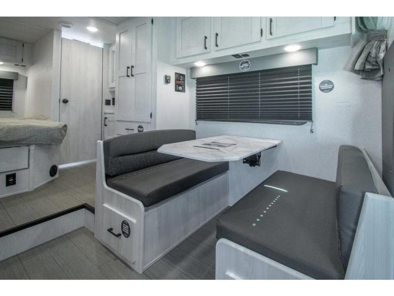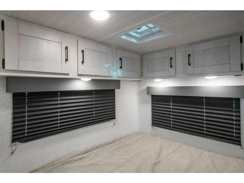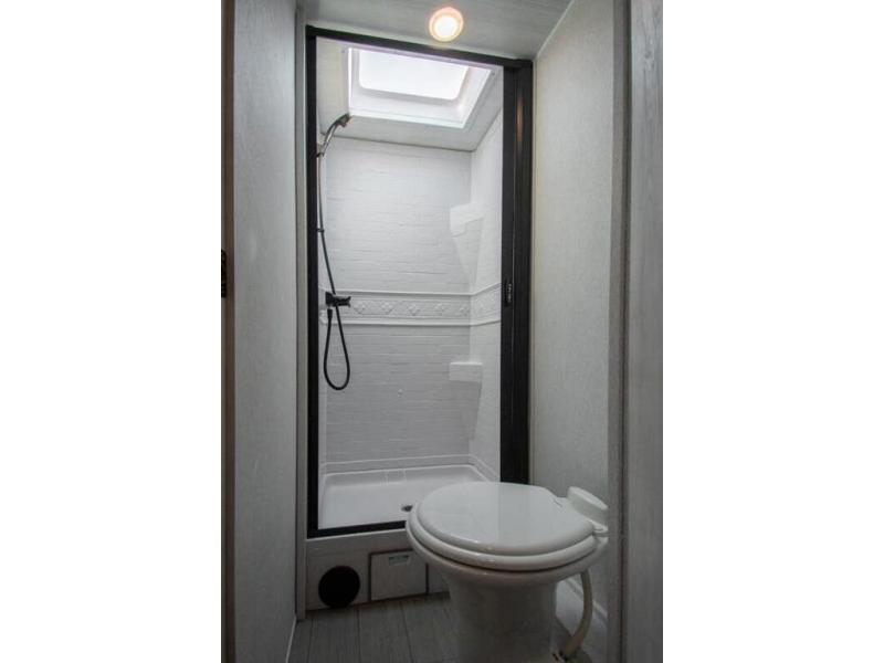 You're going to love traveling and camping in this coach that can sleep five to six each night. The convection microwave and 10.7 cu. ft. 12V refrigerator will let you cook and store food, and the booth dinette provides a place to dine together. A private bath includes a shower and toilet, with the sink just outside this room so two people can freshen up at once. You will sleep soundly each night on the rear corner queen bed with overhead storage for your belongings, while the little ones take the 60" x 80" bunk over cab!