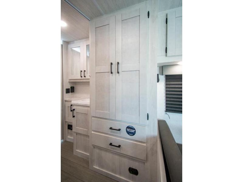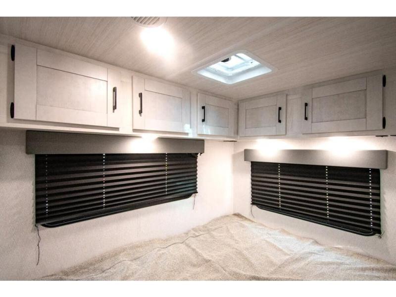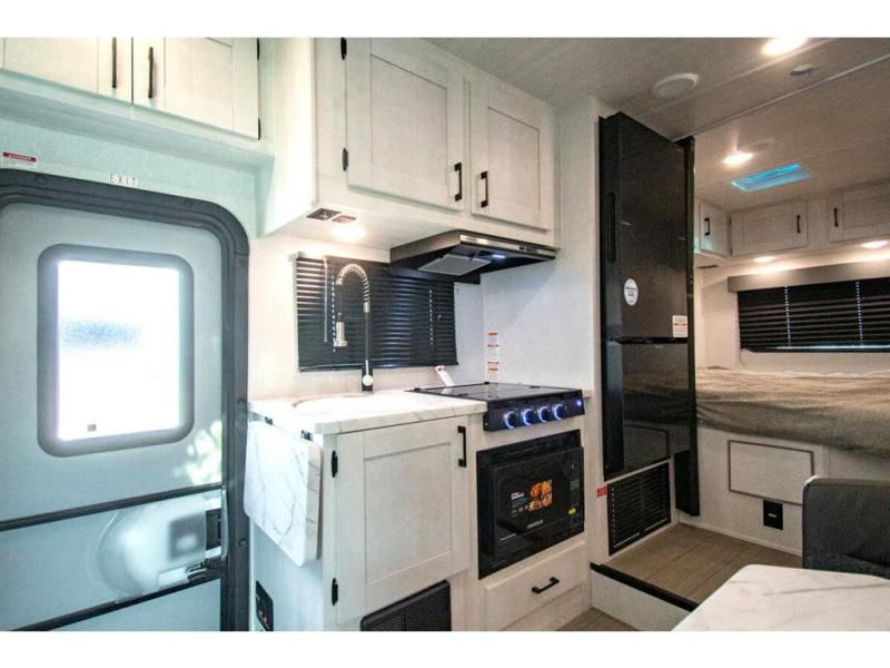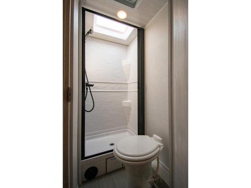 You're going to love traveling and camping in this coach that can sleep five to six each night. The convection microwave and 10.7 cu. ft. 12V refrigerator will let you cook and store food, and the booth dinette provides a place to dine together. A private bath includes a shower and toilet, with the sink just outside this room so two people can freshen up at once. You will sleep soundly each night on the rear corner queen bed with overhead storage for your belongings, while the little ones take the 60" x 80" bunk over cab!