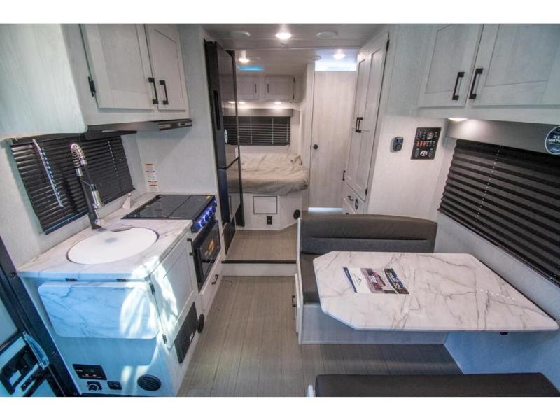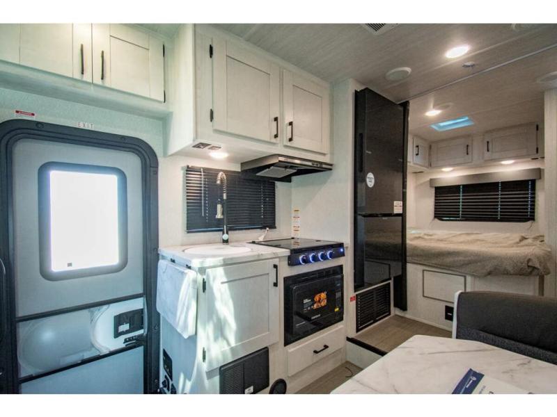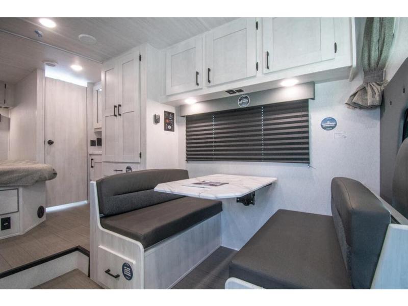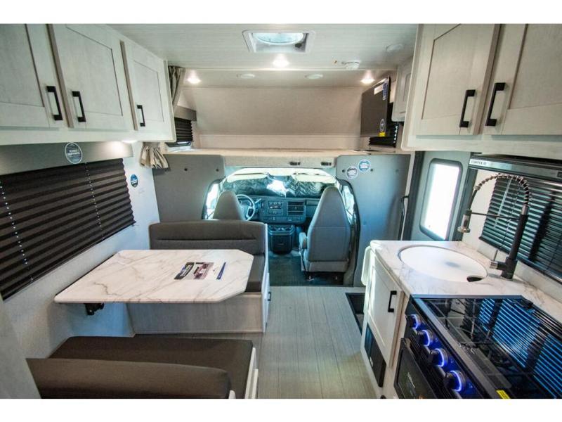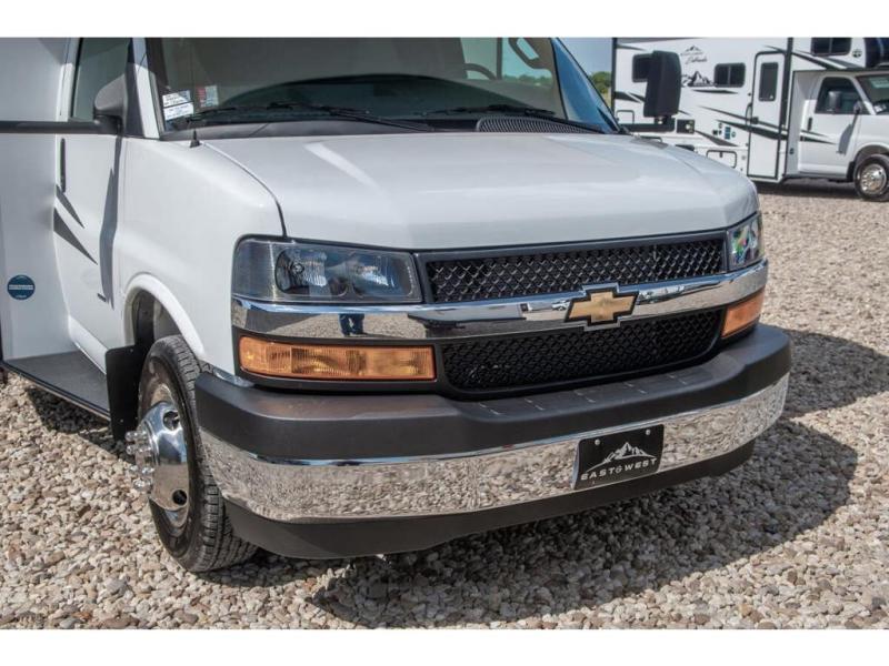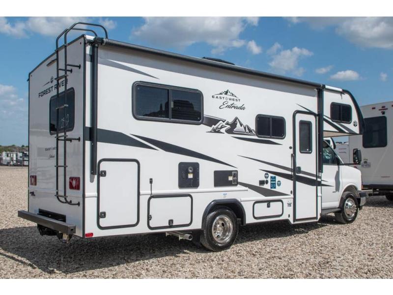 With any Entrada Class C gas motorhome from EAST TO WEST, the construction consists of a one-piece painted fiberglass front cap, a TPO roof membrane, and 2" Azdel composite sidewalls for added durability. There are rotocast exterior storage compartments with slam latch doors, along with an exterior LP Quick Connect, and a power awning with an LED light strip. You will also find rear and sideview cameras to help make maneuvering and parking your RV easier than ever. Inside, you'll feel right at home with soft close hardwood cabinet doors and drawers, a high-altitude tankless water heater, plus a 12V smart TV and USB ports to keep your electronics charged up!