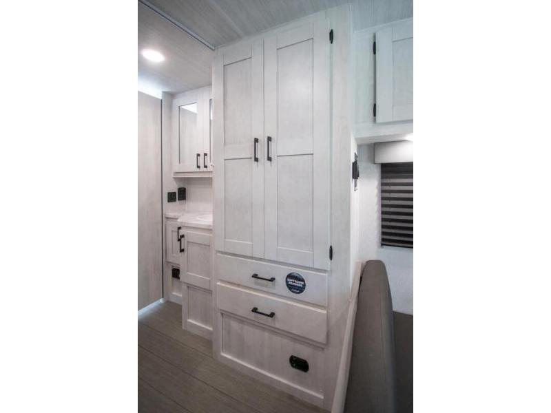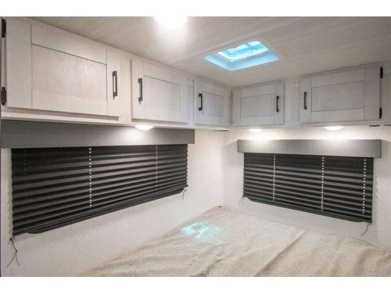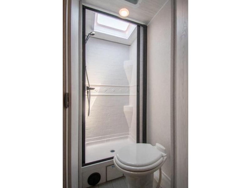 You're going to love traveling and camping in this coach that can sleep five to six each night. The convection microwave and 10.7 cu. ft. 12V refrigerator will let you cook and store food, and the booth dinette provides a place to dine together. A private bath includes a shower and toilet, with the sink just outside this room so two people can freshen up at once. You will sleep soundly each night on the rear corner queen bed with overhead storage for your belongings, while the little ones take the 60" x 80" bunk over cab!