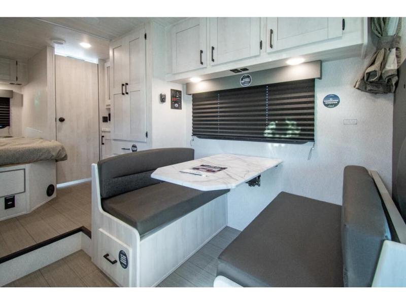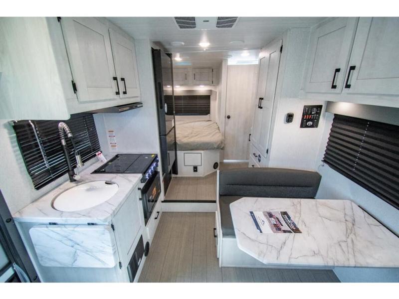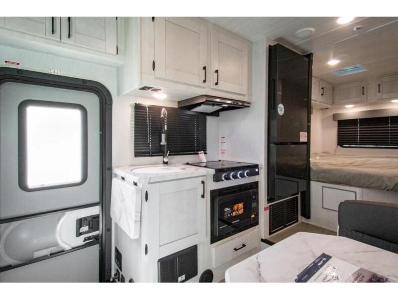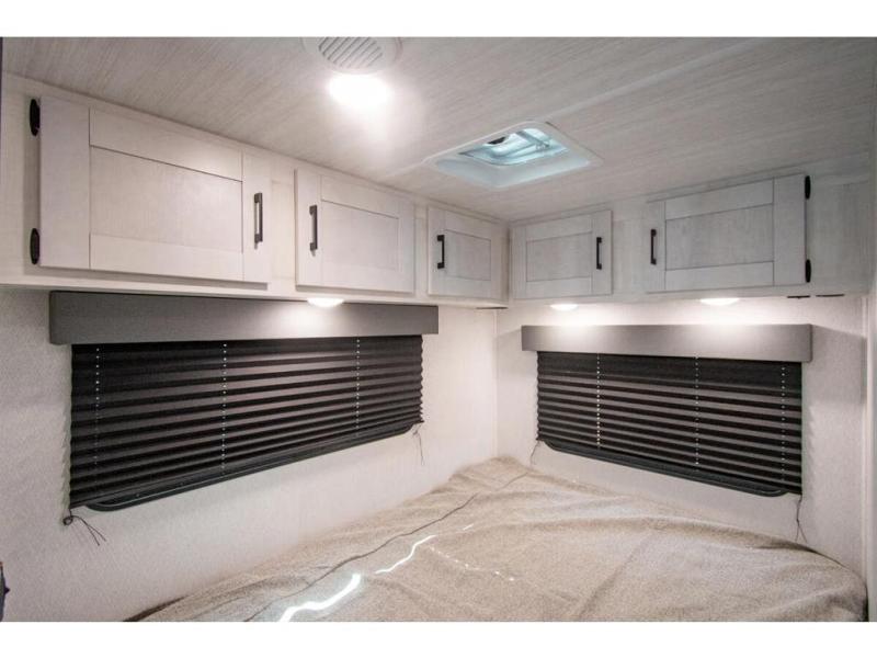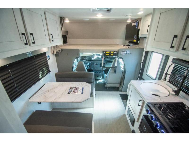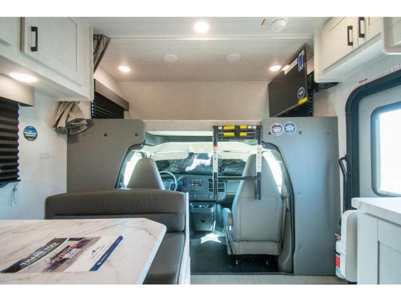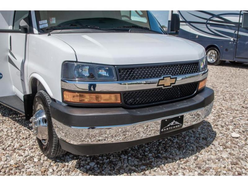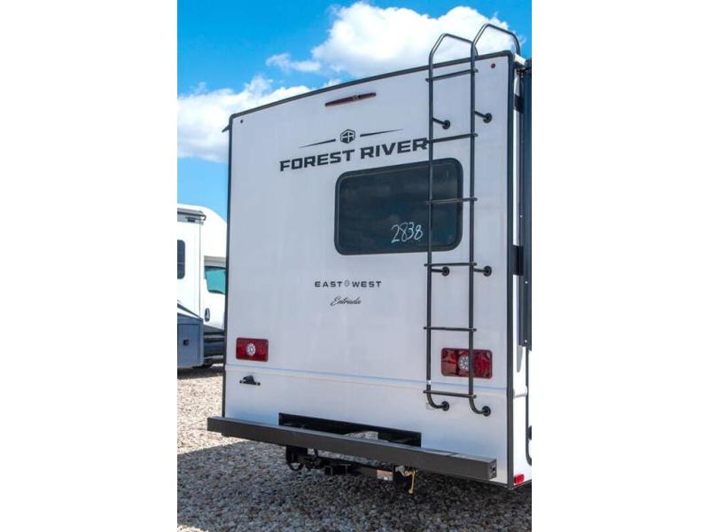 With any Entrada Class C gas motorhome from EAST TO WEST, the construction consists of a one-piece painted fiberglass front cap, a TPO roof membrane, and 2" Azdel composite sidewalls for added durability. There are rotocast exterior storage compartments with slam latch doors, along with an exterior LP Quick Connect, and a power awning with an LED light strip. You will also find rear and sideview cameras to help make maneuvering and parking your RV easier than ever. Inside, you'll feel right at home with soft close hardwood cabinet doors and drawers, a high-altitude tankless water heater, plus a 12V smart TV and USB ports to keep your electronics charged up!