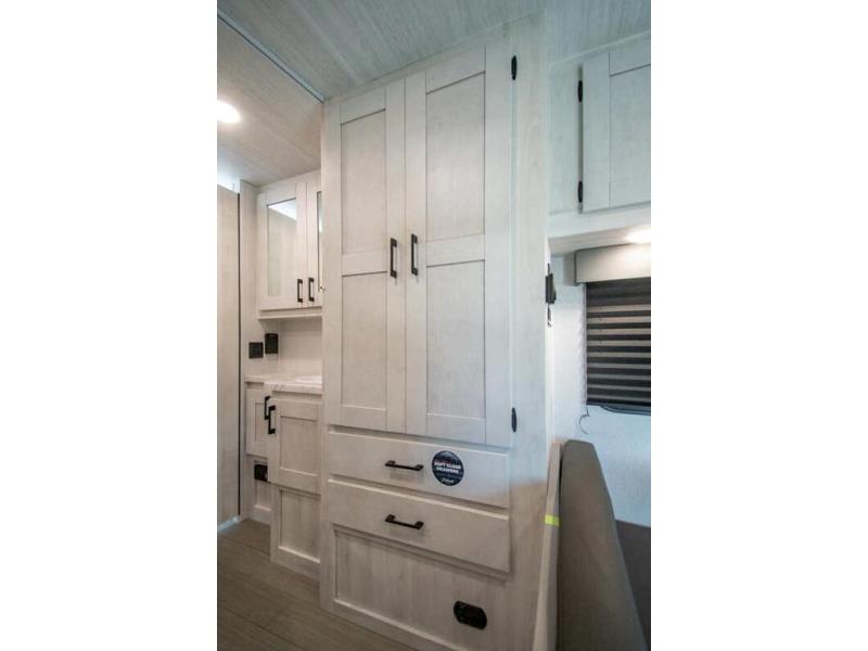 You're going to love traveling and camping in this coach that can sleep five to six each night. The convection microwave and 10.7 cu. ft. 12V refrigerator will let you cook and store food, and the booth dinette provides a place to dine together. A private bath includes a shower and toilet, with the sink just outside this room so two people can freshen up at once. You will sleep soundly each night on the rear corner queen bed with overhead storage for your belongings, while the little ones take the 60" x 80" bunk over cab!