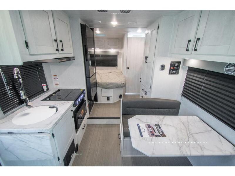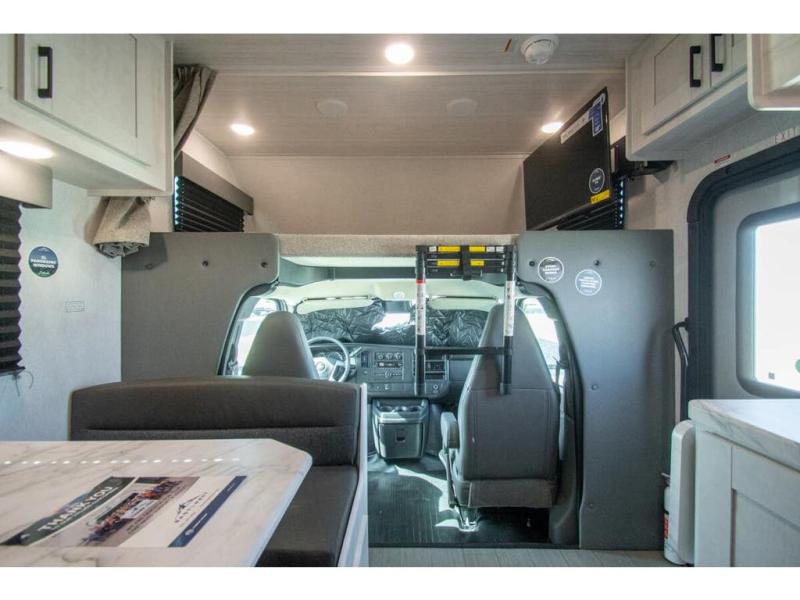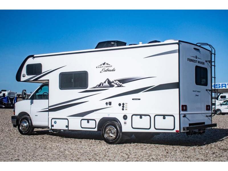 With any Entrada Class C gas motorhome from EAST TO WEST, the construction consists of a one-piece painted fiberglass front cap, a TPO roof membrane, and 2" Azdel composite sidewalls for added durability. There are rotocast exterior storage compartments with slam latch doors, along with an exterior LP Quick Connect, and a power awning with an LED light strip. You will also find rear and sideview cameras to help make maneuvering and parking your RV easier than ever. Inside, you'll feel right at home with soft close hardwood cabinet doors and drawers, a high-altitude tankless water heater, plus a 12V smart TV and USB ports to keep your electronics charged up!