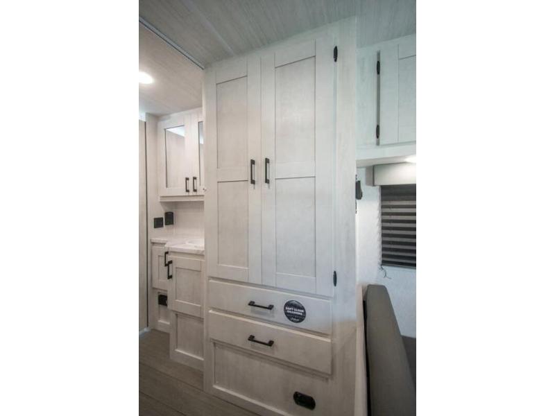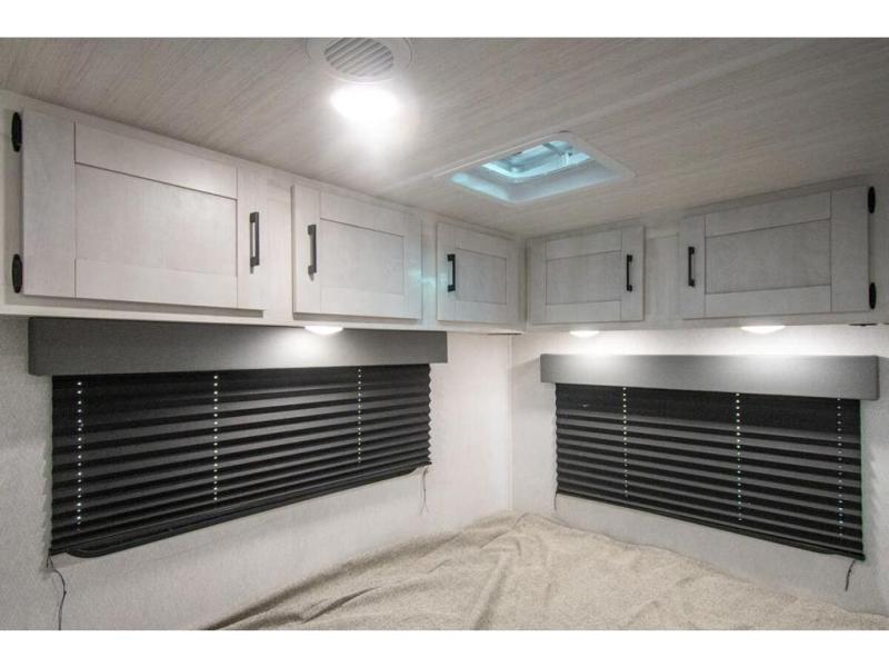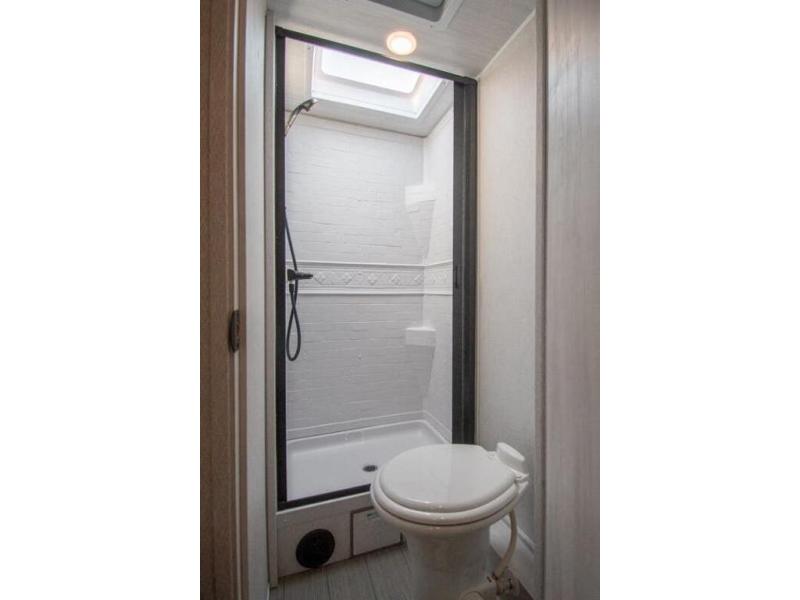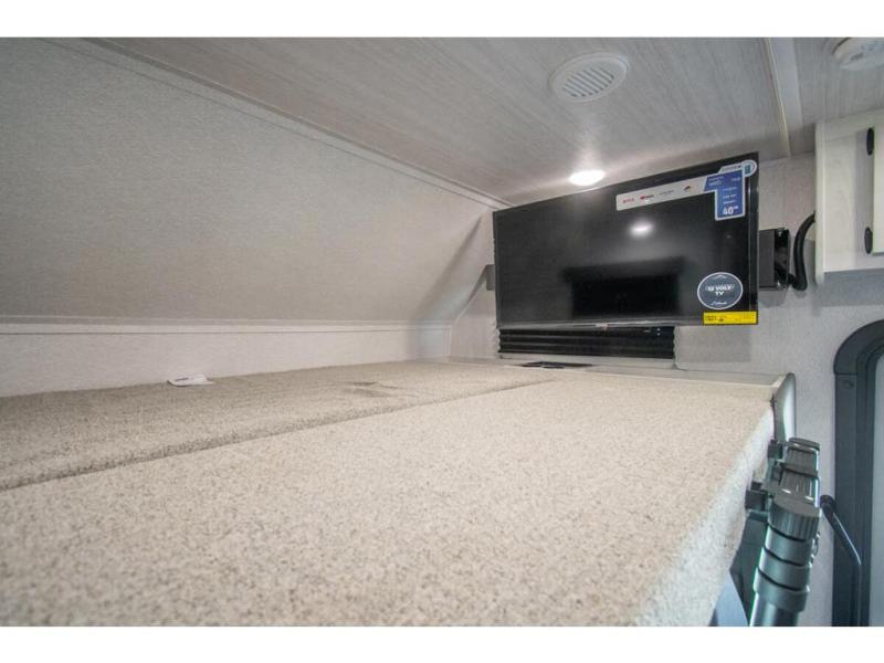 You're going to love traveling and camping in this coach that can sleep five to six each night. The convection microwave and 10.7 cu. ft. 12V refrigerator will let you cook and store food, and the booth dinette provides a place to dine together. A private bath includes a shower and toilet, with the sink just outside this room so two people can freshen up at once. You will sleep soundly each night on the rear corner queen bed with overhead storage for your belongings, while the little ones take the 60" x 80" bunk over cab!