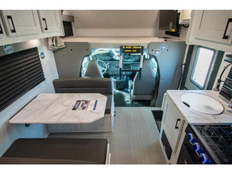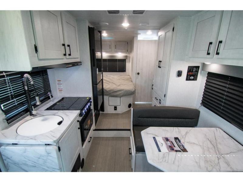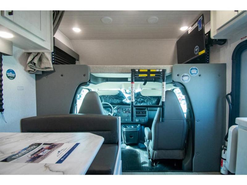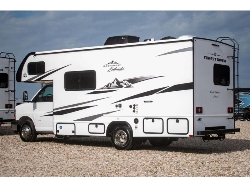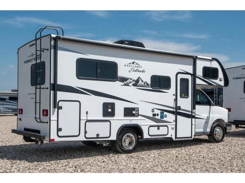 With any Entrada Class C gas motorhome from EAST TO WEST, the construction consists of a one-piece painted fiberglass front cap, a TPO roof membrane, and 2" Azdel composite sidewalls for added durability. There are rotocast exterior storage compartments with slam latch doors, along with an exterior LP Quick Connect, and a power awning with an LED light strip. You will also find rear and sideview cameras to help make maneuvering and parking your RV easier than ever. Inside, you'll feel right at home with soft close hardwood cabinet doors and drawers, a high-altitude tankless water heater, plus a 12V smart TV and USB ports to keep your electronics charged up!