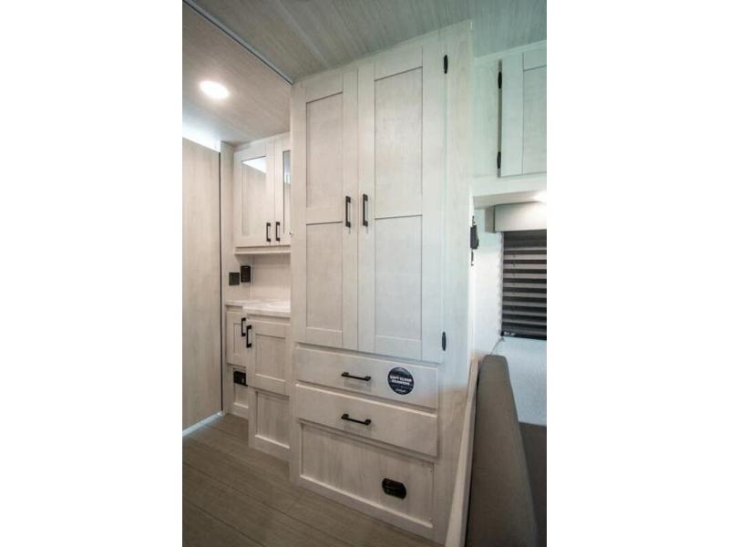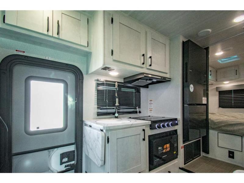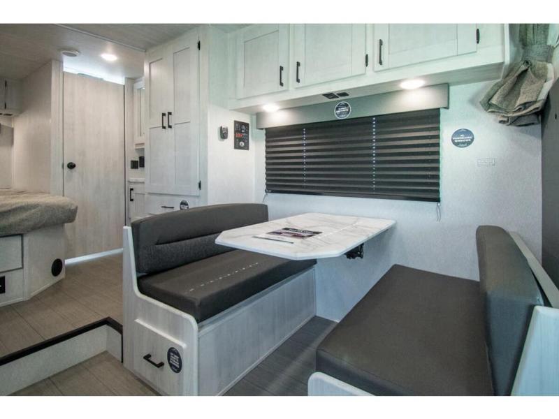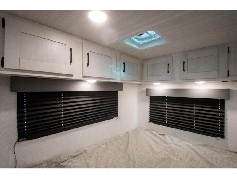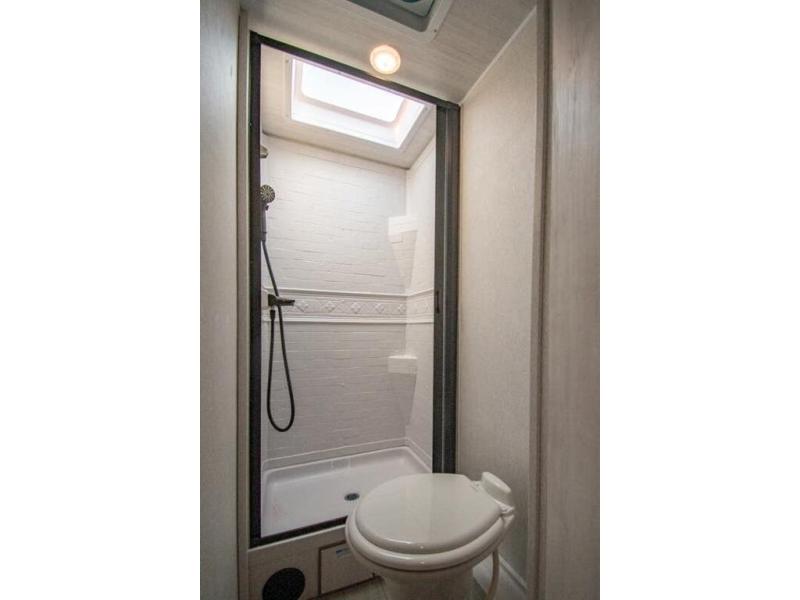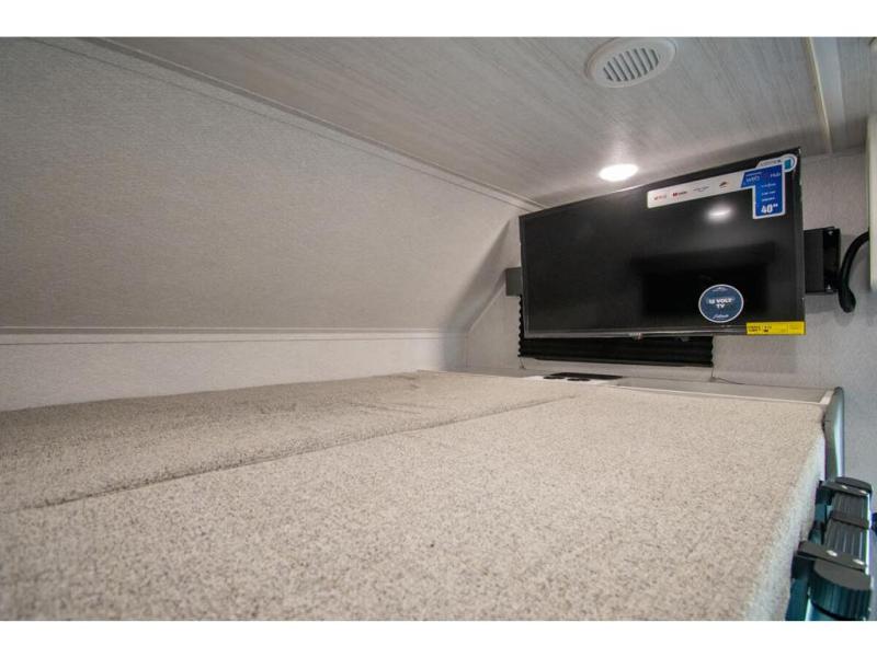You're going to love traveling and camping in this coach that can sleep five to six each night. The convection microwave and 10.7 cu. ft. 12V refrigerator will let you cook and store food, and the booth dinette provides a place to dine together. A private bath includes a shower and toilet, with the sink just outside this room so two people can freshen up at once. You will sleep soundly each night on the rear corner queen bed with overhead storage for your belongings, while the little ones take the 60" x 80" bunk over cab!