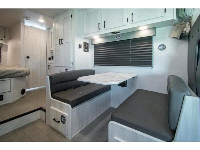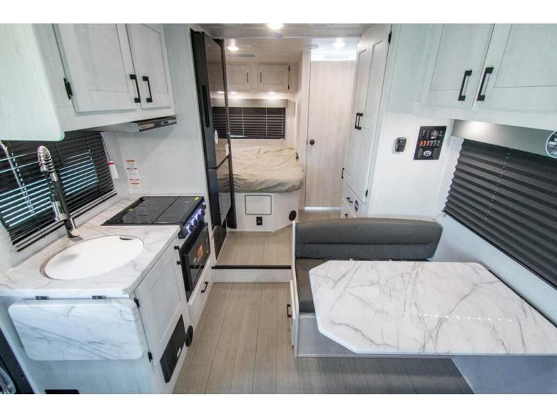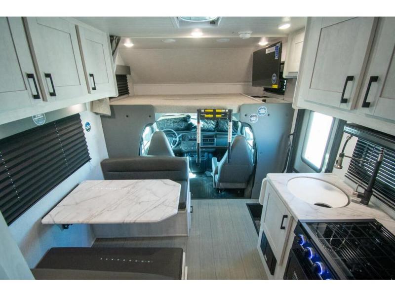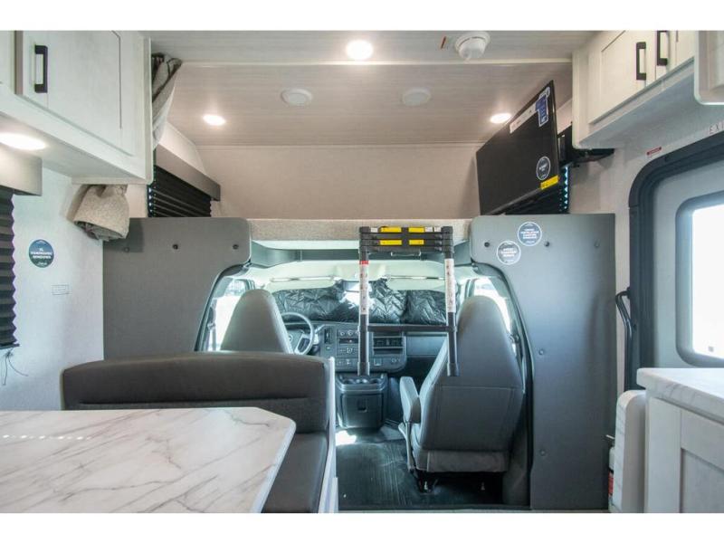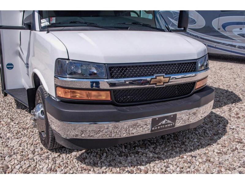 With any Entrada Class C gas motorhome from EAST TO WEST, the construction consists of a one-piece painted fiberglass front cap, a TPO roof membrane, and 2" Azdel composite sidewalls for added durability. There are rotocast exterior storage compartments with slam latch doors, along with an exterior LP Quick Connect, and a power awning with an LED light strip. You will also find rear and sideview cameras to help make maneuvering and parking your RV easier than ever. Inside, you'll feel right at home with soft close hardwood cabinet doors and drawers, a high-altitude tankless water heater, plus a 12V smart TV and USB ports to keep your electronics charged up!