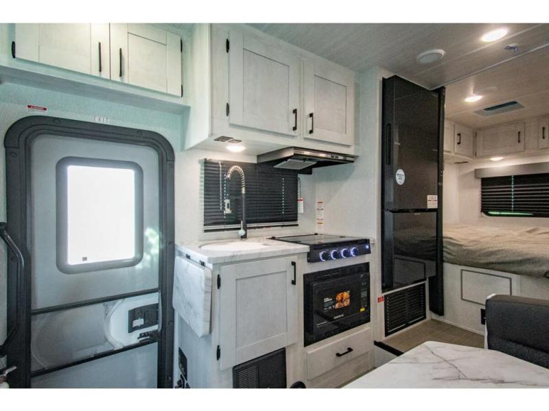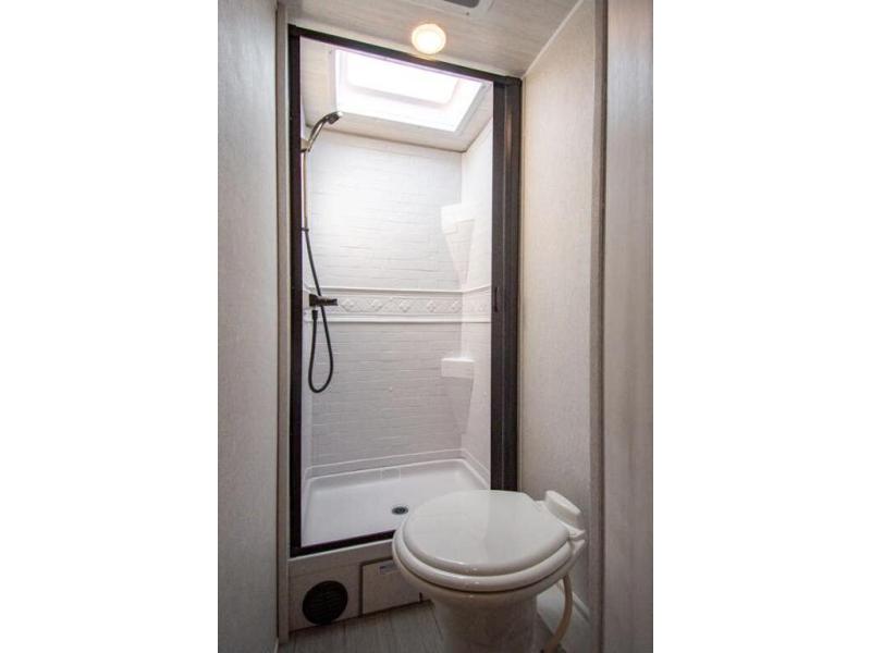 You're going to love traveling and camping in this coach that can sleep five to six each night. The convection microwave and 10.7 cu. ft. 12V refrigerator will let you cook and store food, and the booth dinette provides a place to dine together. A private bath includes a shower and toilet, with the sink just outside this room so two people can freshen up at once. You will sleep soundly each night on the rear corner queen bed with overhead storage for your belongings, while the little ones take the 60" x 80" bunk over cab!