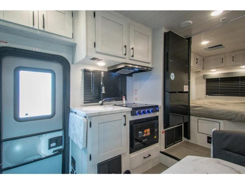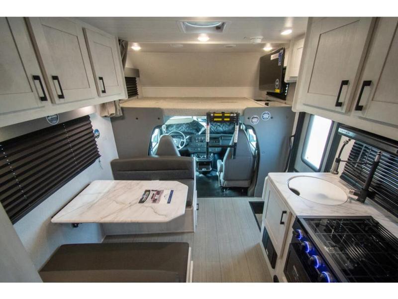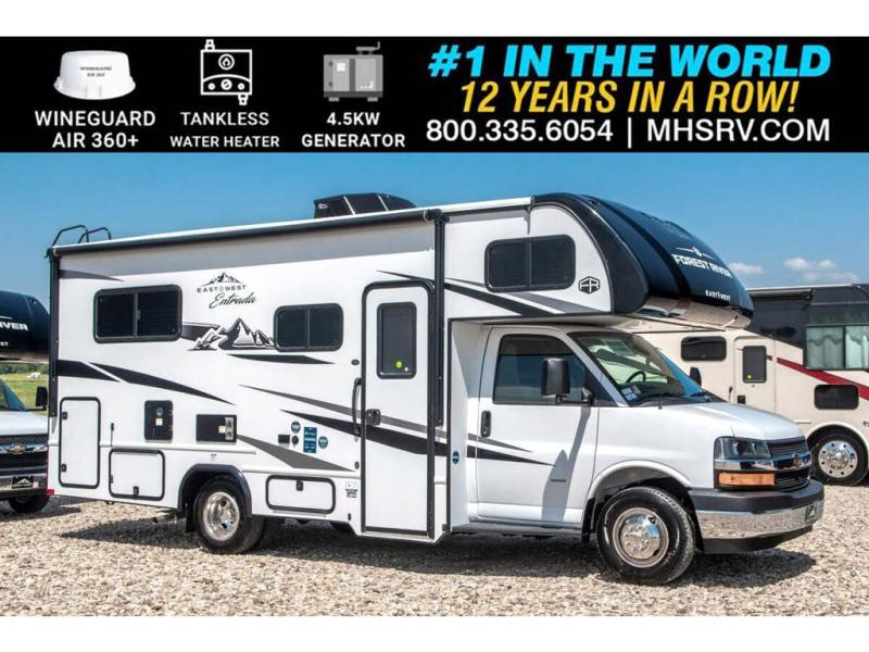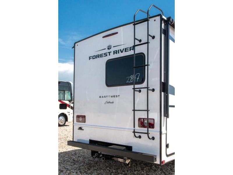With any Entrada Class C gas motorhome from EAST TO WEST, the construction consists of a one-piece painted fiberglass front cap, a TPO roof membrane, and 2" Azdel composite sidewalls for added durability. There are rotocast exterior storage compartments with slam latch doors, along with an exterior LP Quick Connect, and a power awning with an LED light strip. You will also find rear and sideview cameras to help make maneuvering and parking your RV easier than ever. Inside, you'll feel right at home with soft close hardwood cabinet doors and drawers, a high-altitude tankless water heater, plus a 12V smart TV and USB ports to keep your electronics charged up!