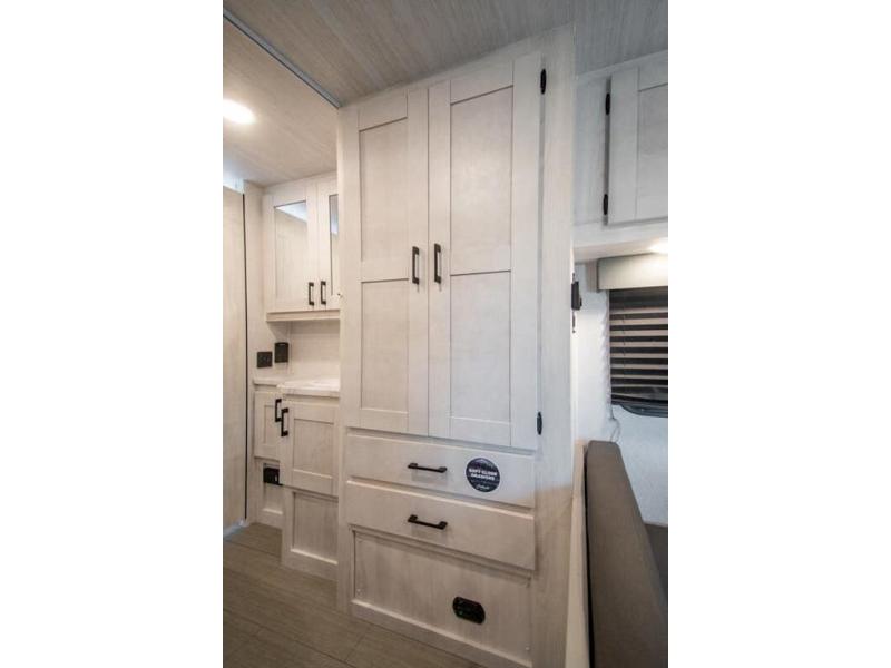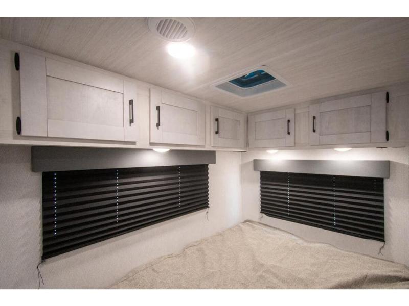 You're going to love traveling and camping in this coach that can sleep five to six each night. The convection microwave and 10.7 cu. ft. 12V refrigerator will let you cook and store food, and the booth dinette provides a place to dine together. A private bath includes a shower and toilet, with the sink just outside this room so two people can freshen up at once. You will sleep soundly each night on the rear corner queen bed with overhead storage for your belongings, while the little ones take the 60" x 80" bunk over cab!