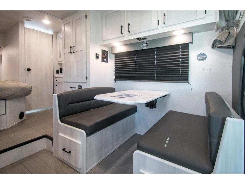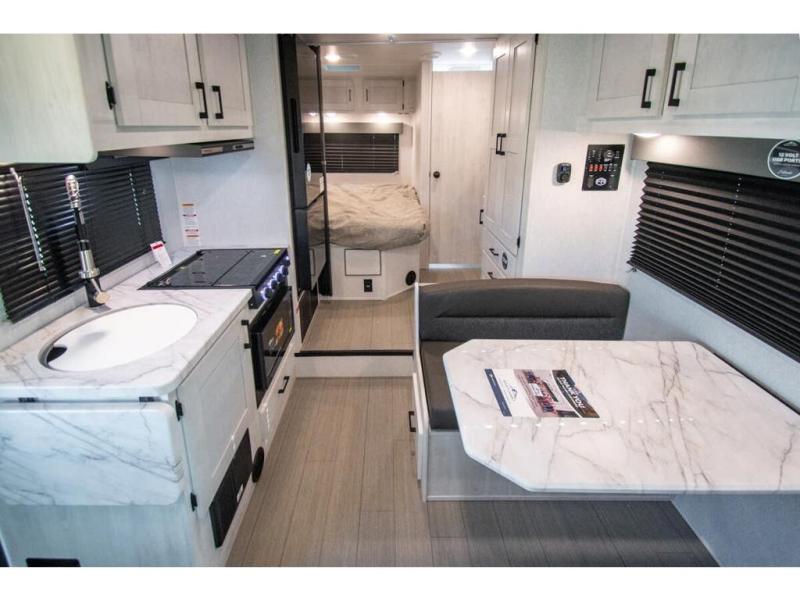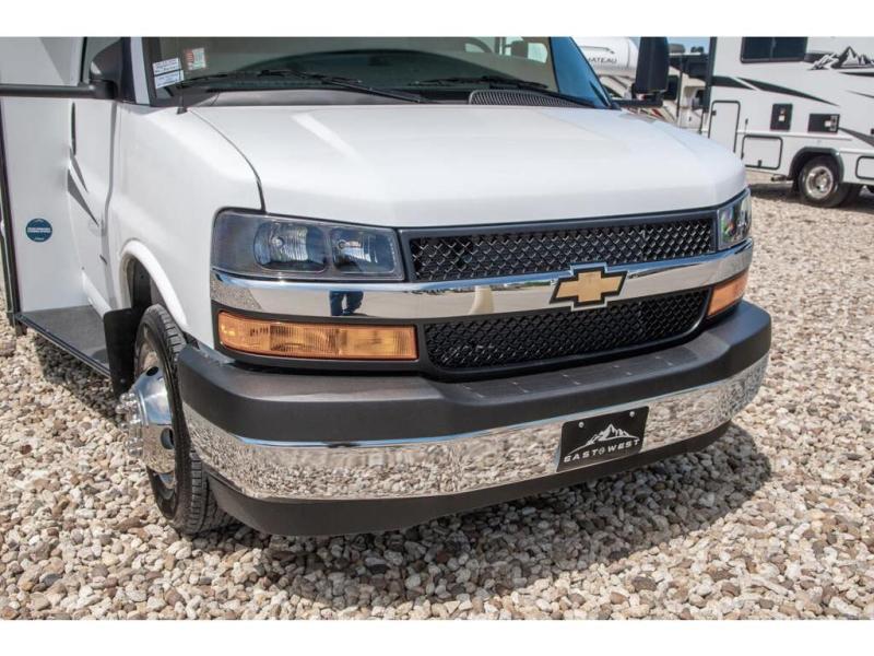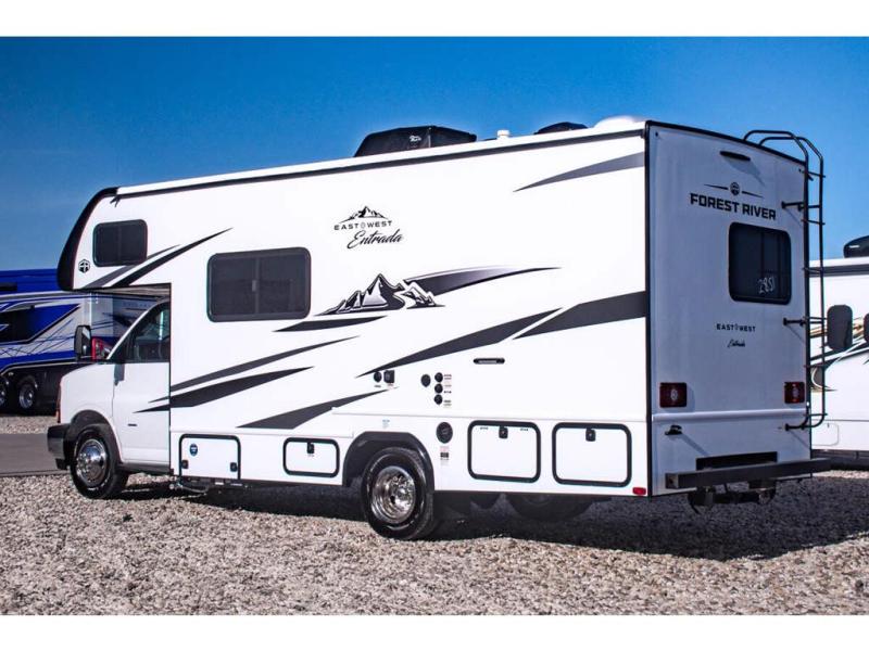 With any Entrada Class C gas motorhome from EAST TO WEST, the construction consists of a one-piece painted fiberglass front cap, a TPO roof membrane, and 2" Azdel composite sidewalls for added durability. There are rotocast exterior storage compartments with slam latch doors, along with an exterior LP Quick Connect, and a power awning with an LED light strip. You will also find rear and sideview cameras to help make maneuvering and parking your RV easier than ever. Inside, you'll feel right at home with soft close hardwood cabinet doors and drawers, a high-altitude tankless water heater, plus a 12V smart TV and USB ports to keep your electronics charged up!