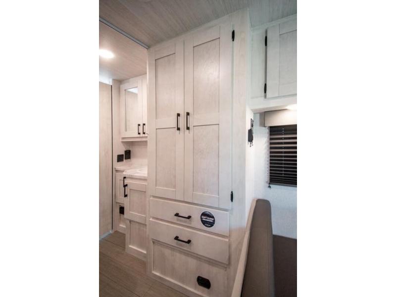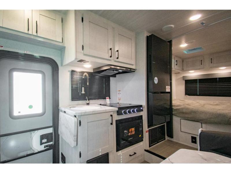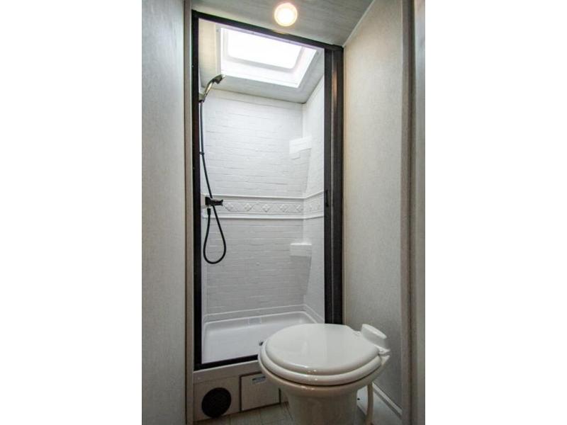 You're going to love traveling and camping in this coach that can sleep five to six each night. The convection microwave and 10.7 cu. ft. 12V refrigerator will let you cook and store food, and the booth dinette provides a place to dine together. A private bath includes a shower and toilet, with the sink just outside this room so two people can freshen up at once. You will sleep soundly each night on the rear corner queen bed with overhead storage for your belongings, while the little ones take the 60" x 80" bunk over cab!
