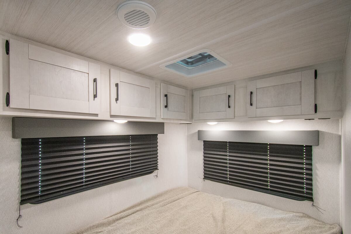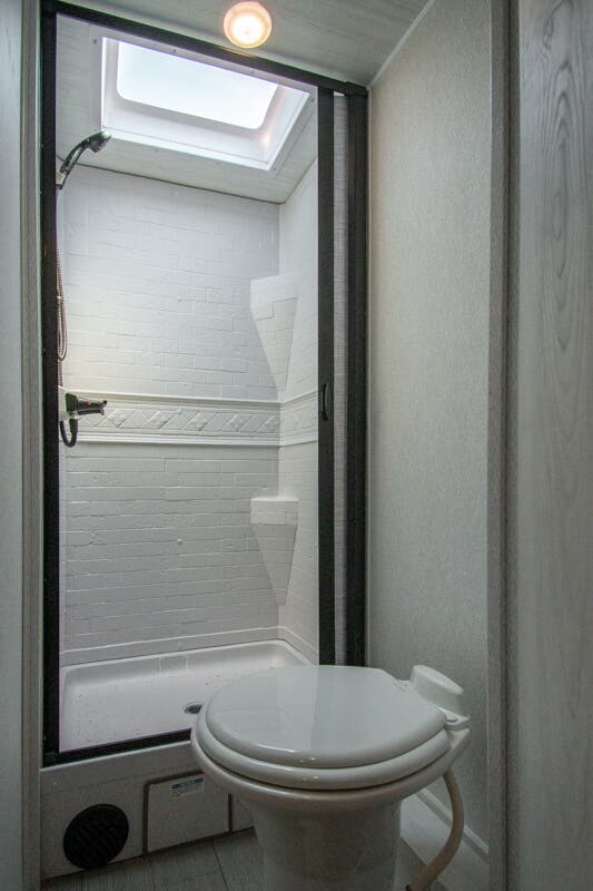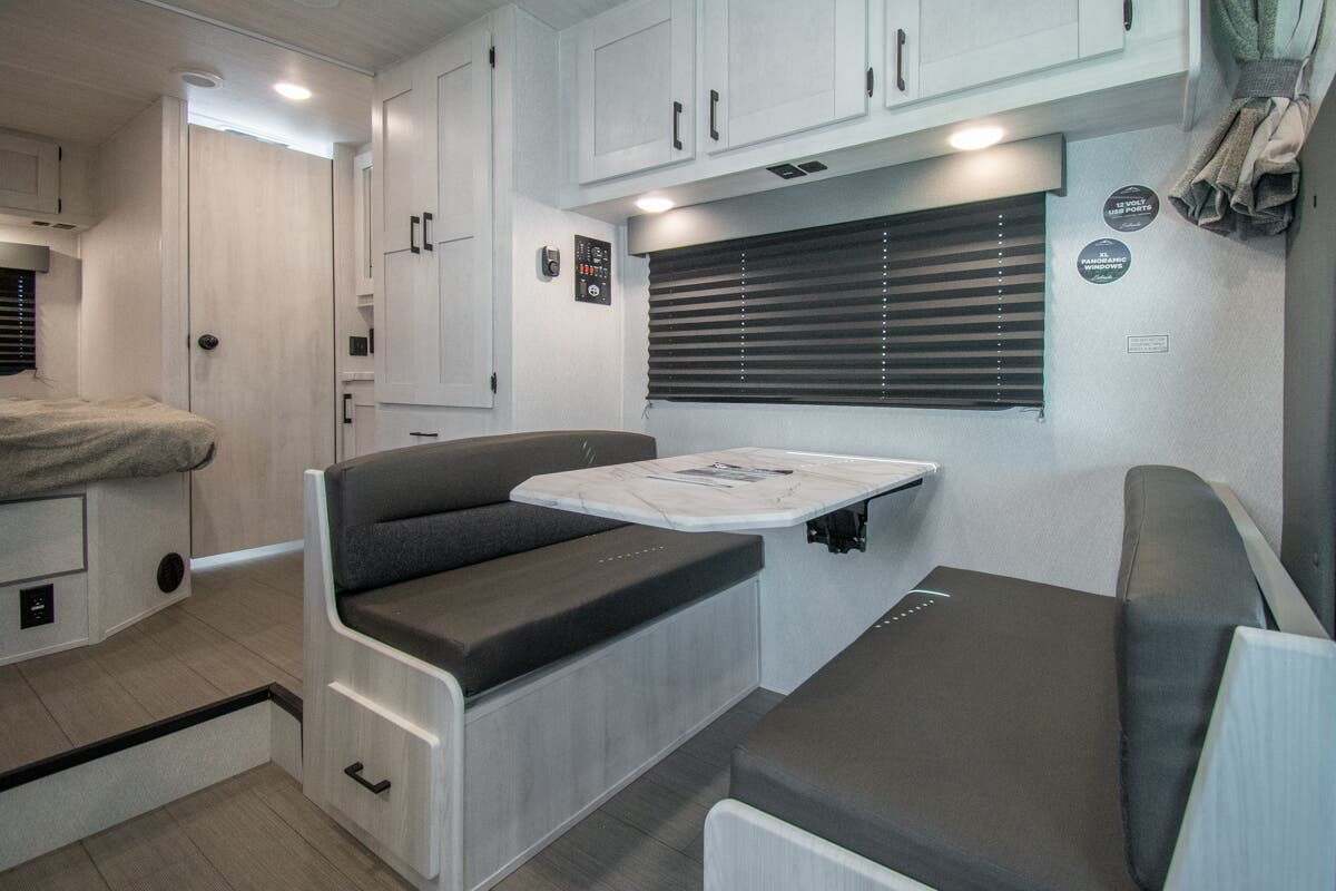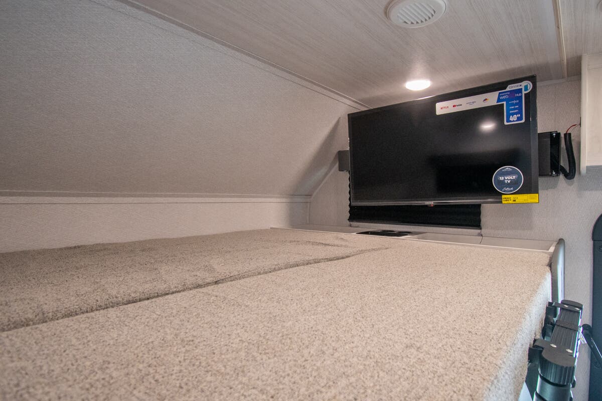 You're going to love traveling and camping in this coach that can sleep five to six each night. The convection microwave and 10.7 cu. ft. 12V refrigerator will let you cook and store food, and the booth dinette provides a place to dine together. A private bath includes a shower and toilet, with the sink just outside this room so two people can freshen up at once. You will sleep soundly each night on the rear corner queen bed with overhead storage for your belongings, while the little ones take the 60" x 80" bunk over cab!