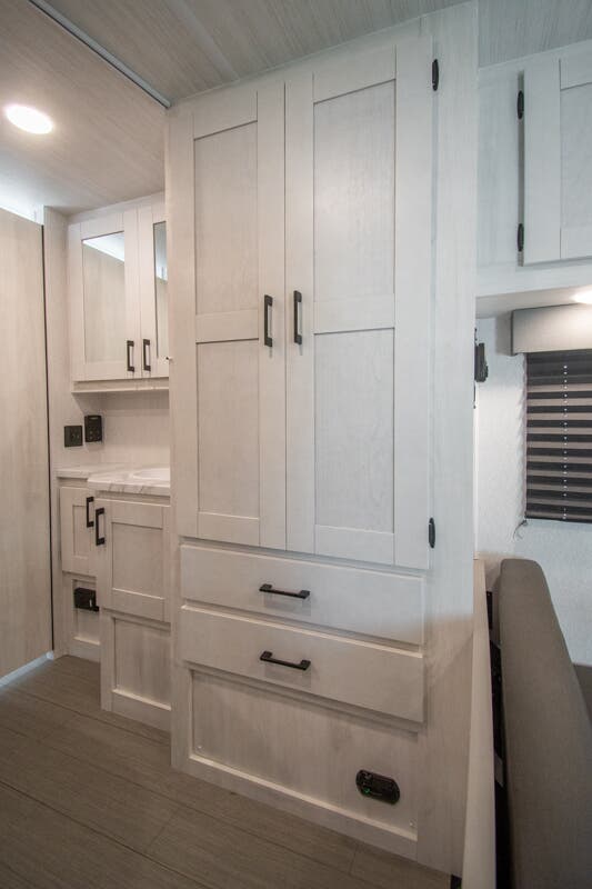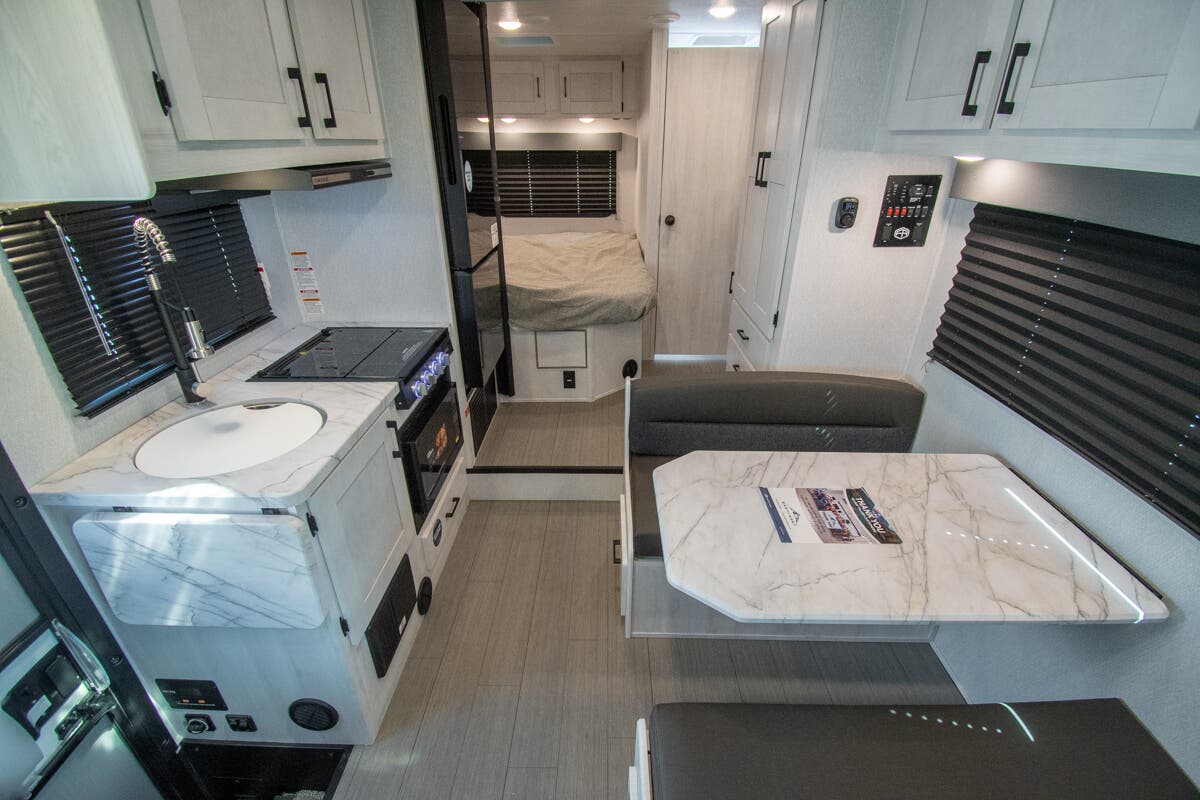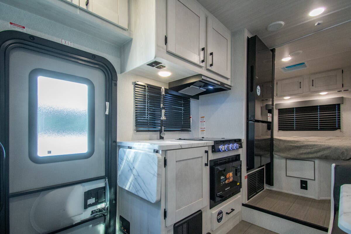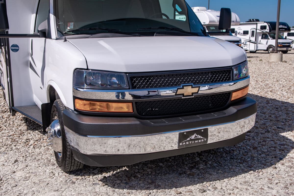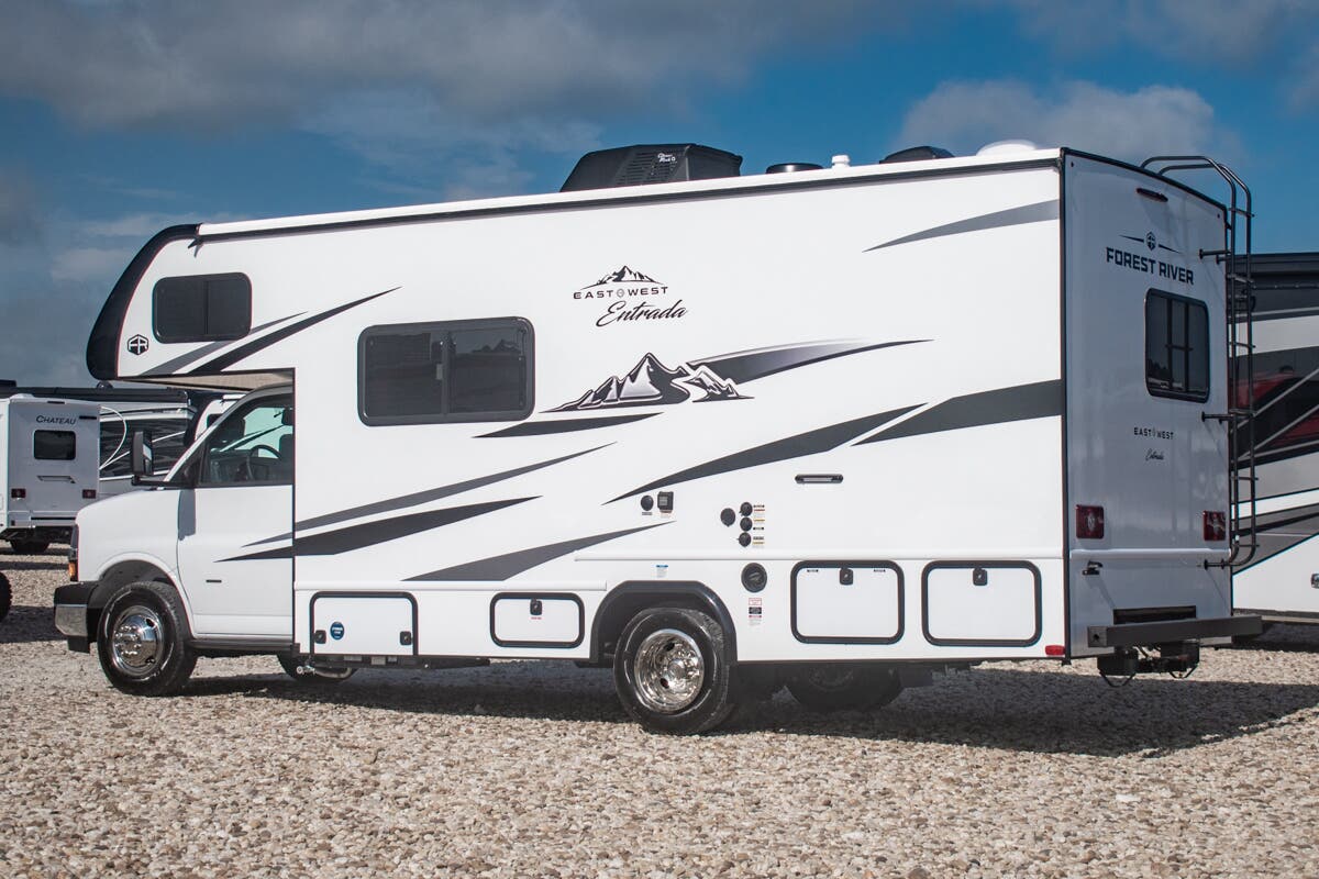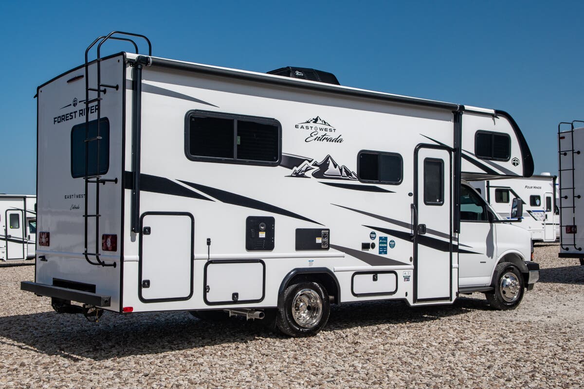 With any Entrada Class C gas motorhome from EAST TO WEST, the construction consists of a one-piece painted fiberglass front cap, a TPO roof membrane, and 2" Azdel composite sidewalls for added durability. There are rotocast exterior storage compartments with slam latch doors, along with an exterior LP Quick Connect, and a power awning with an LED light strip. You will also find rear and sideview cameras to help make maneuvering and parking your RV easier than ever. Inside, you'll feel right at home with soft close hardwood cabinet doors and drawers, a high-altitude tankless water heater, plus a 12V smart TV and USB ports to keep your electronics charged up!