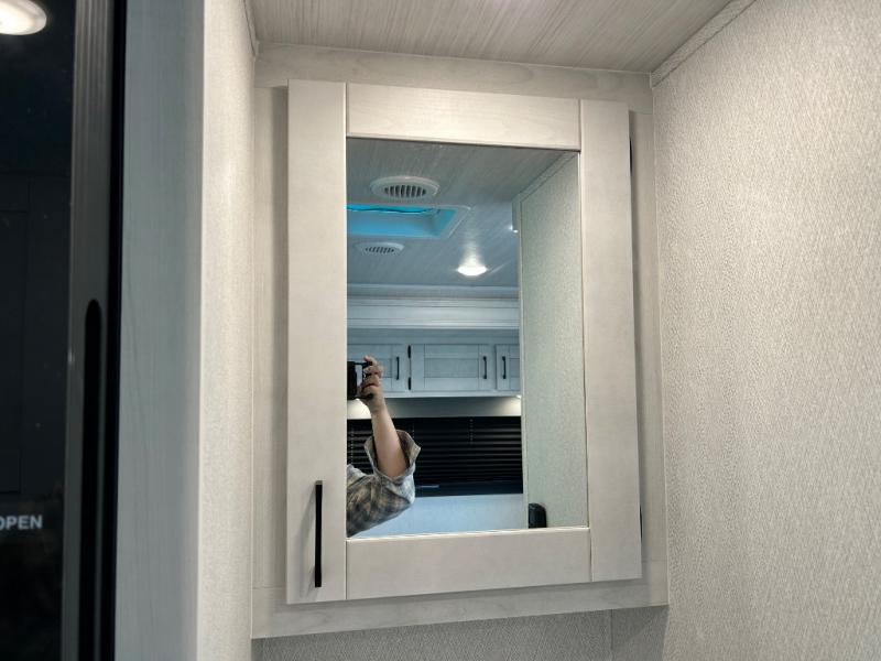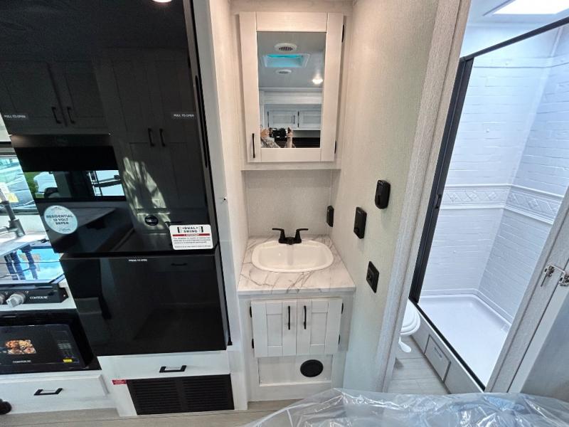 The journey will be oh-so enjoyable when you use this Entrada Class C gas motorhome to explore! You will be able to create meals each day that you are on the road because the kitchen has everything you will need, like a convection microwave, a round sink, a cooktop, a flip-up countertop, and a 10.7-cubic foot refrigerator. There is even a pantry/wardrobe for you to use to store spices, chips, or canned goods. Across from the queen bed slide, you'll find a private bath so you can get cleaned up in the morning, and the vanity with a medicine cabinet is located just outside the bathroom so that someone can brush their teeth while another is showering.