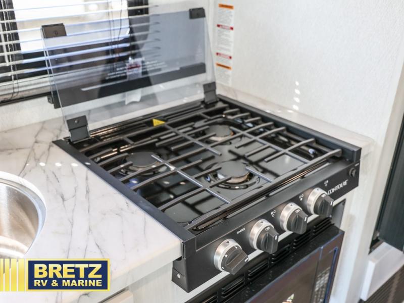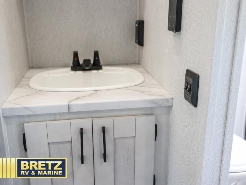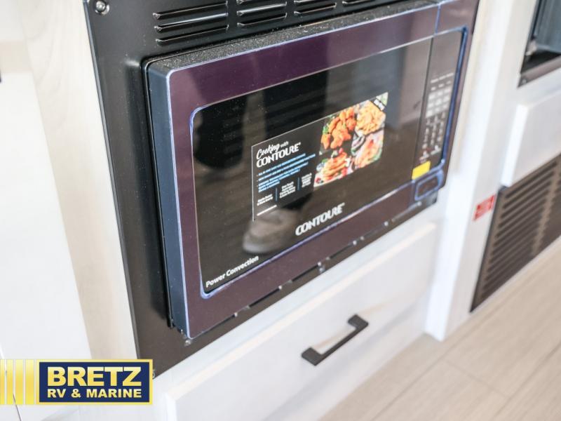 You're going to love traveling and camping in this coach that can sleep five to six each night. The convection microwave and 10.7 cu. ft. 12V refrigerator will let you cook and store food, and the booth dinette provides a place to dine together. A private bath includes a shower and toilet, with the sink just outside this room so two people can freshen up at once. You will sleep soundly each night on the rear corner queen bed slide out, while the little ones take the 60" x 80" bunk over cab!