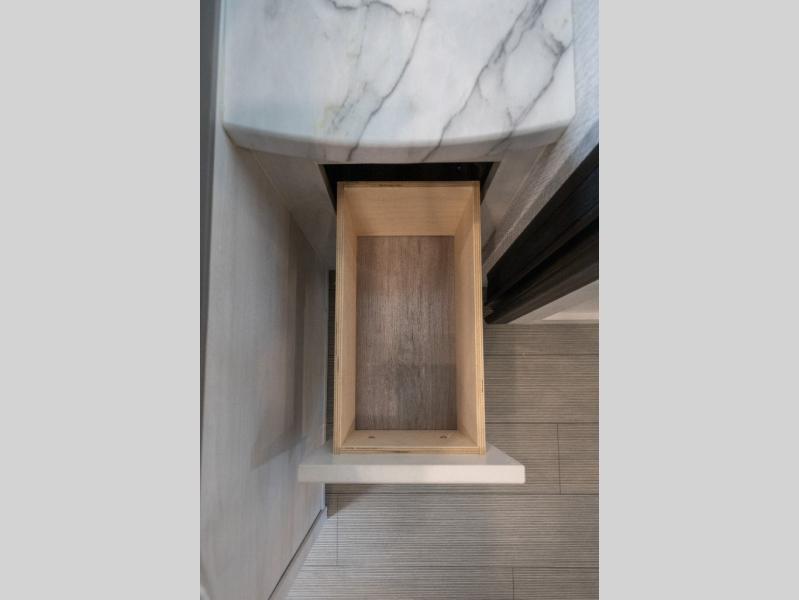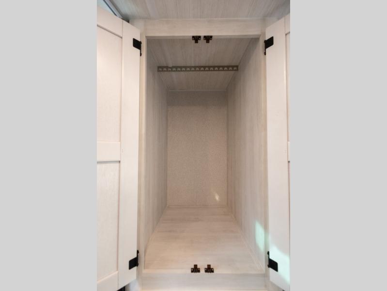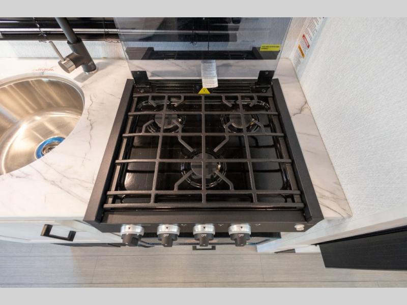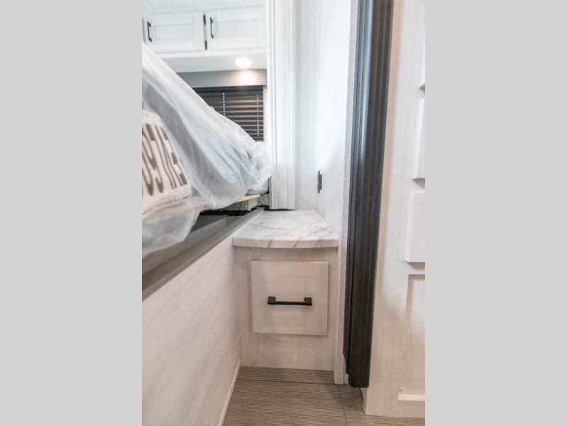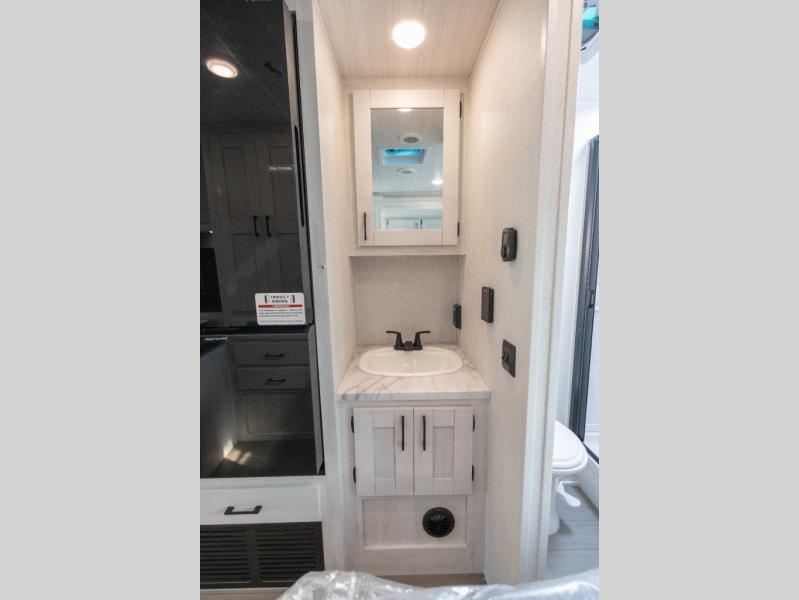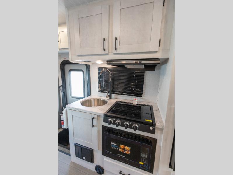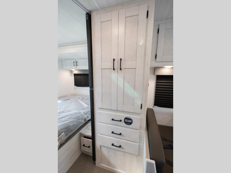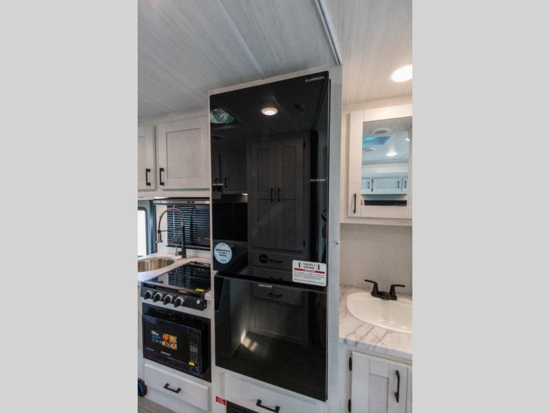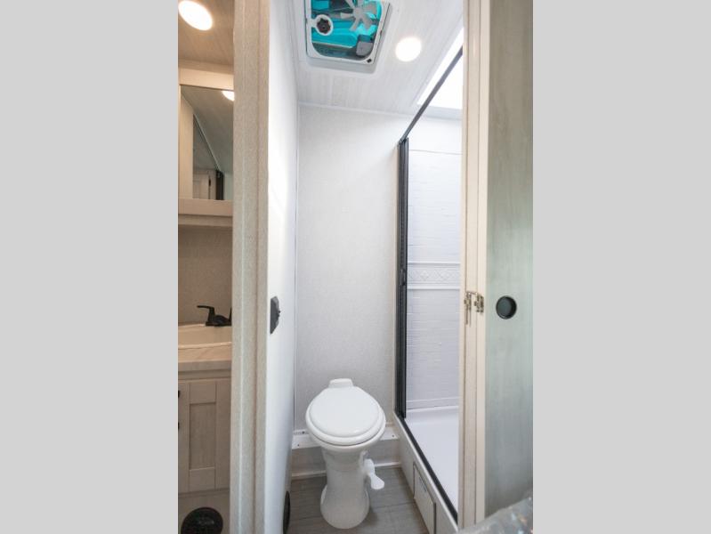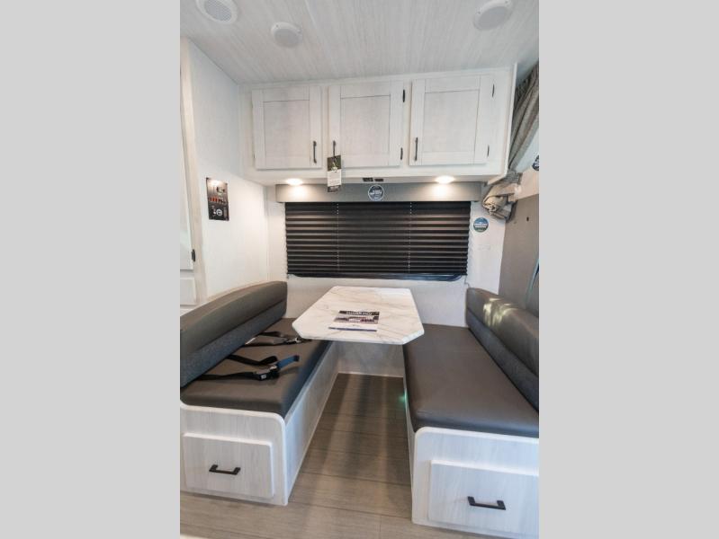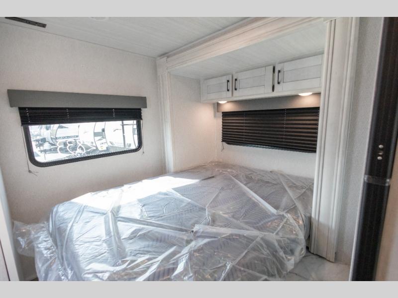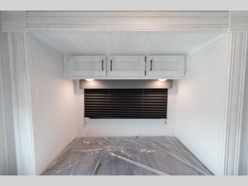 You're going to love traveling and camping in this coach that can sleep five to six each night. The convection microwave and 10.7 cu. ft. 12V refrigerator will let you cook and store food, and the booth dinette provides a place to dine together. A private bath includes a shower and toilet, with the sink just outside this room so two people can freshen up at once. You will sleep soundly each night on the rear corner queen bed slide out, while the little ones take the 60" x 80" bunk over cab!