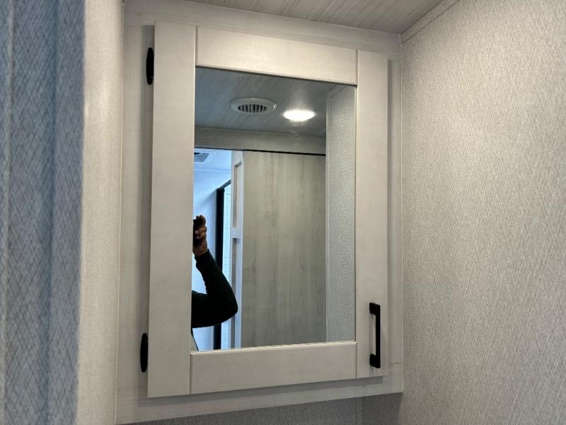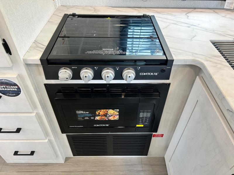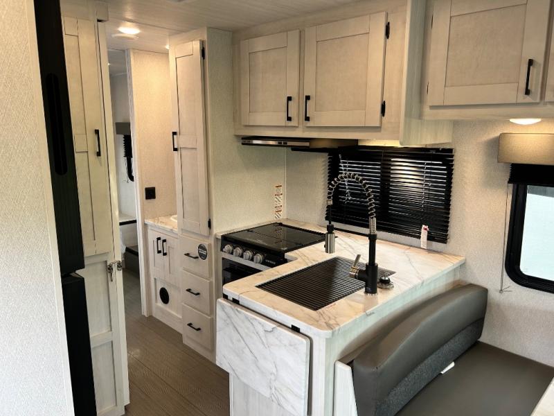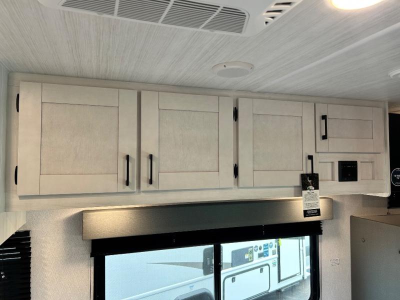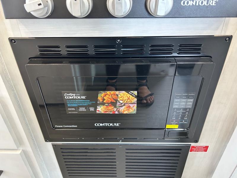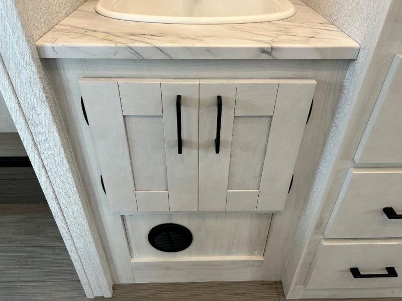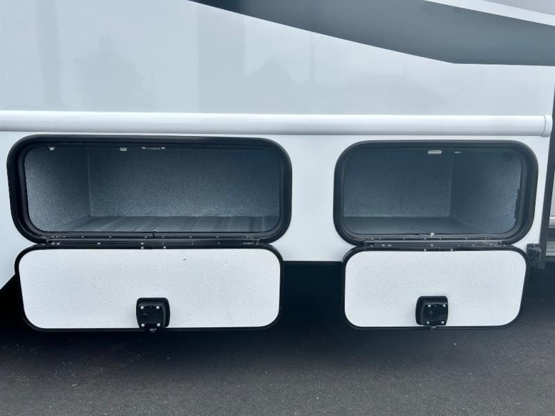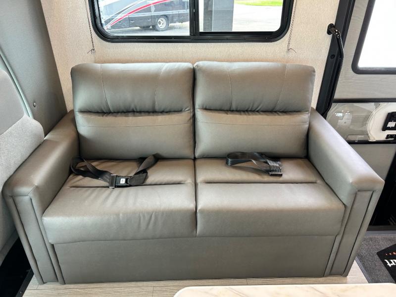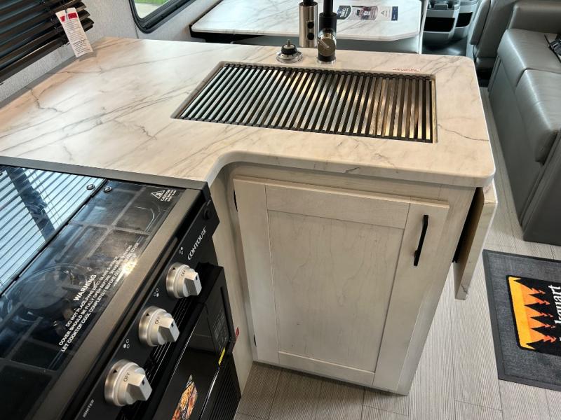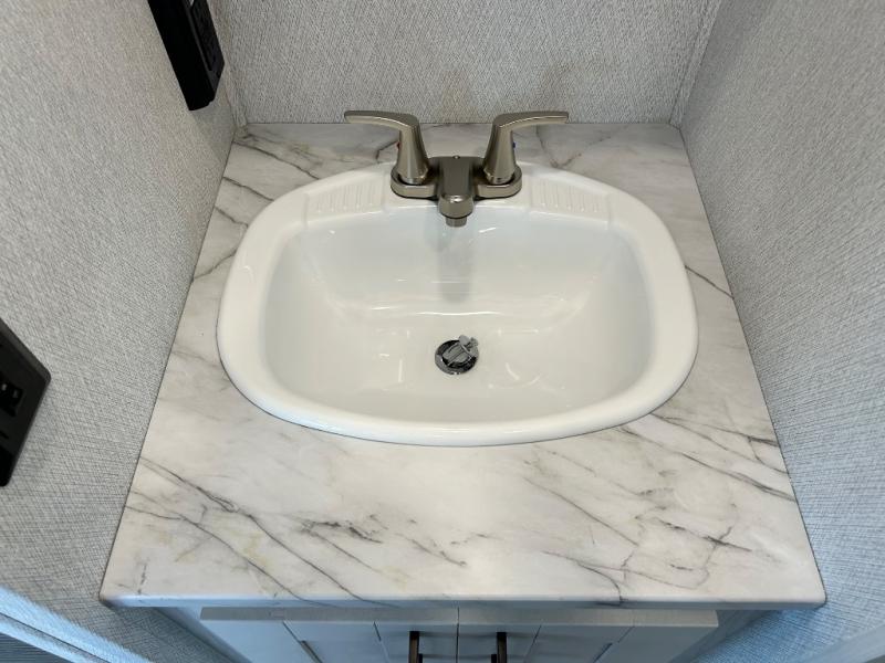 When traveling you want comfort no matter if you are driving, riding, or relaxing once at your campsite. Well, you will have it in this coach! There is a 62" sofa and 42" x 68" booth dinette that can be used for lounging together after an afternoon of walking around the campground, plus the bunk over the cab and the queen-size bed can be utilized if you are too tired to stay up for another minute. Once you are fully rested, head to the kitchen to prepare a delicious breakfast feast with the convection microwave and cooktop. Use the double sink to clean up, and the 10.7-cubic foot refrigerator to keep your perishables fresh. You can even add some extra prep space to this area by pulling out the flip-up countertop. There is also storage all throughout this motorhome with bedside closets, the bathroom shelves, a kitchen pantry, cab storage, and within overhead cabinets.