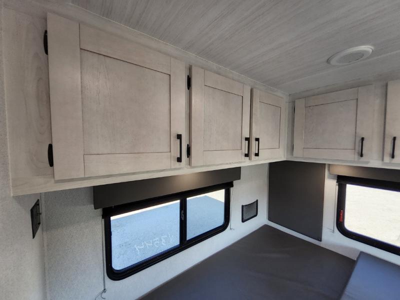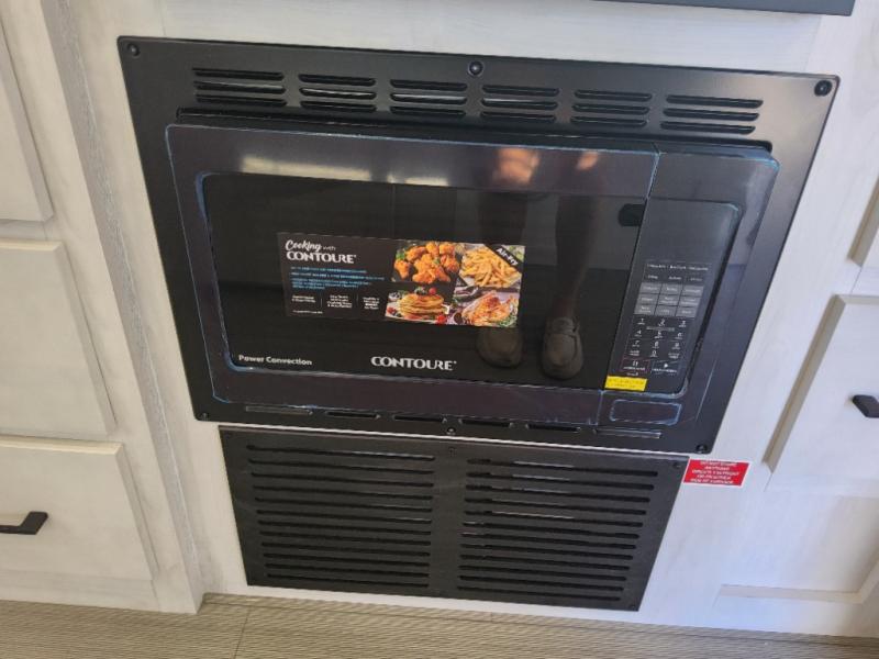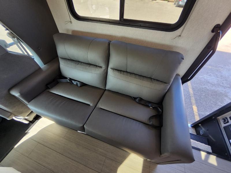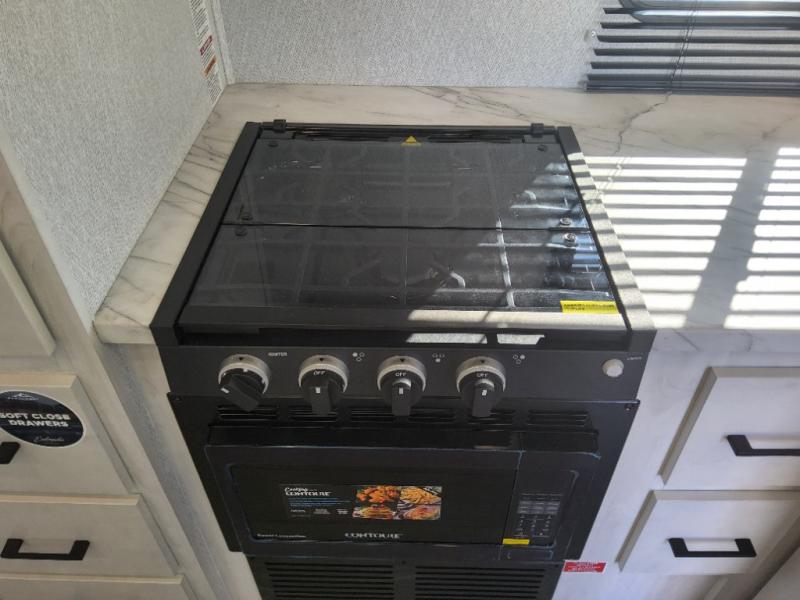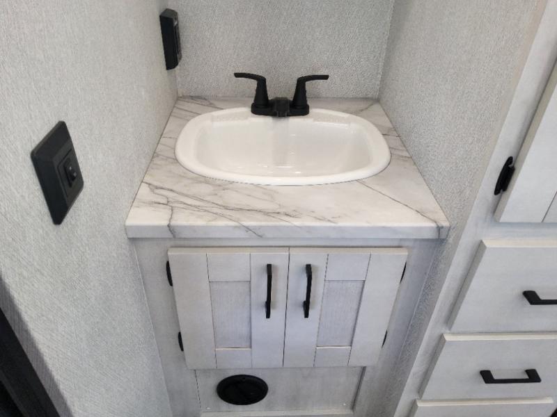 This coach is perfect for traveling with a friend or honey since there are two twin beds that can convert to a king-size bed if you choose! There is a 62" sofa and 42" x 68" booth dinette in the main living area that can double as seating and sleeping space, plus there is a bunk over cab for the little ones. Once you are fully rested, head to the kitchen to prepare a delicious breakfast feast with the convection microwave and cooktop. Use the double sink to clean up, and the 10.7-cubic foot refrigerator to keep your perishables fresh. You can even add some extra prep space to this area by using the countertop extension.