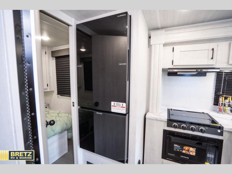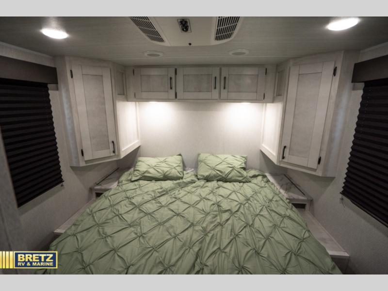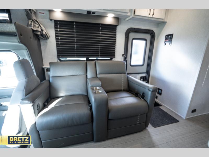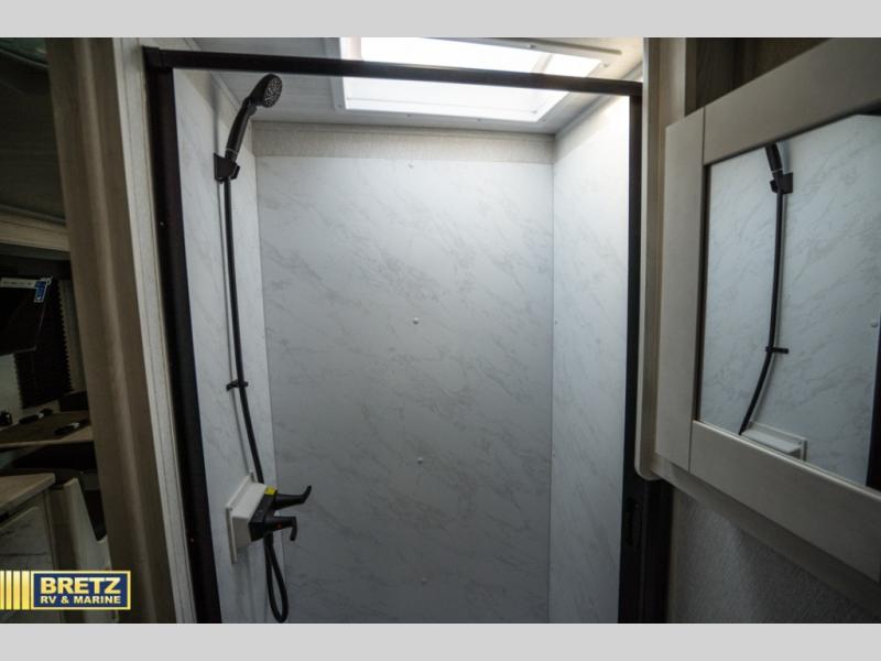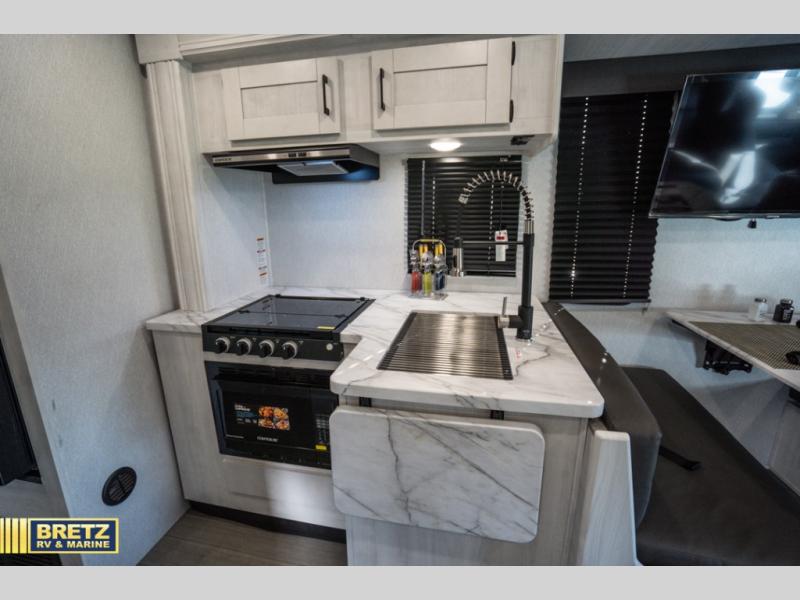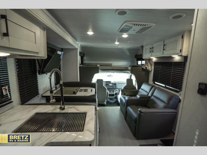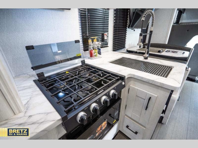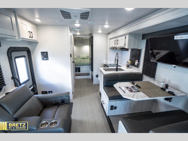 Comfort comes easy in this coach with theater seats and a slide out for more space! You'll find the booth dinette within the slide, along with the cooktop and convection microwave with air fryer technology. A double bowl sink will make clean up easier than ever, and there is a 12V dual swing refrigerator to keep your cold items fresh. The full bath with a 24" x 36" shower will let you clean up each day, and the rear private bedroom with a king bed is sure to provide a great night's rest! And any guests you may have can sleep on the 60" x 80" bunk-over cab or on the dinette once converted to sleeping space!