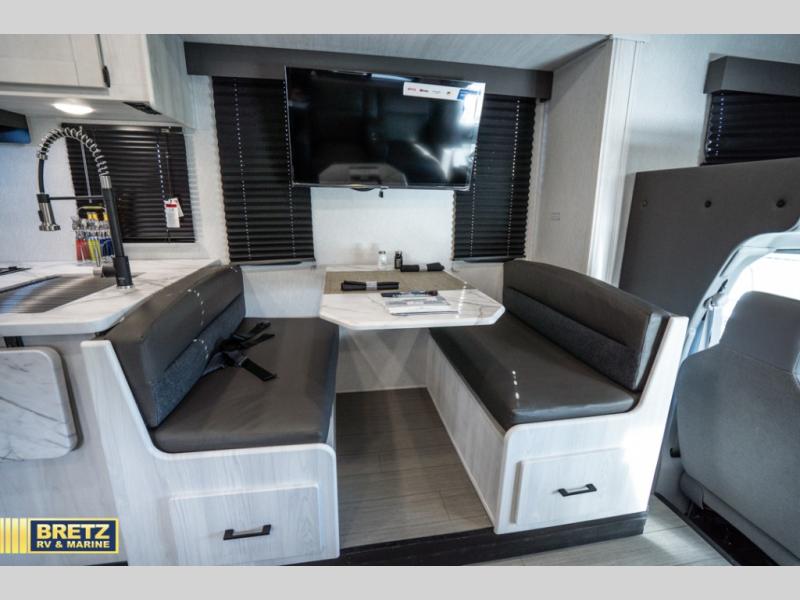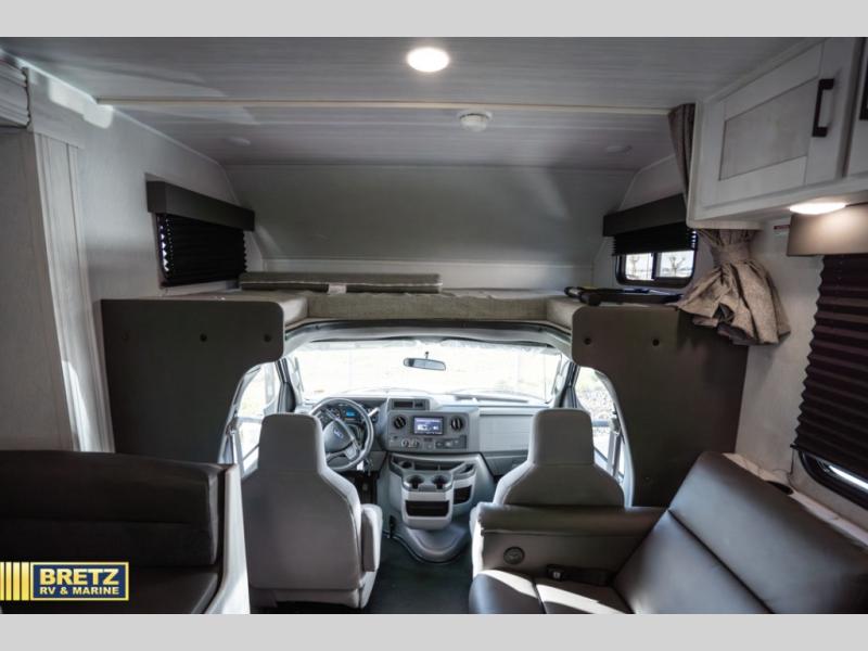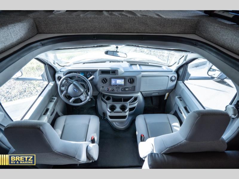 With any Entrada Class C gas motorhome from EAST TO WEST, the construction consists of a one-piece painted fiberglass front cap, a TPO roof membrane, and 2" Azdel composite sidewalls for added durability. There are rotocast exterior storage compartments with slam latch doors, along with an exterior LP Quick Connect, and a power awning with an LED light strip. You will also find rear and sideview cameras to help make maneuvering and parking your RV easier than ever. Inside, you'll feel right at home with soft close hardwood cabinet doors and drawers, a high-altitude tankless water heater, plus a 12V smart TV and USB ports to keep your electronics charged up!