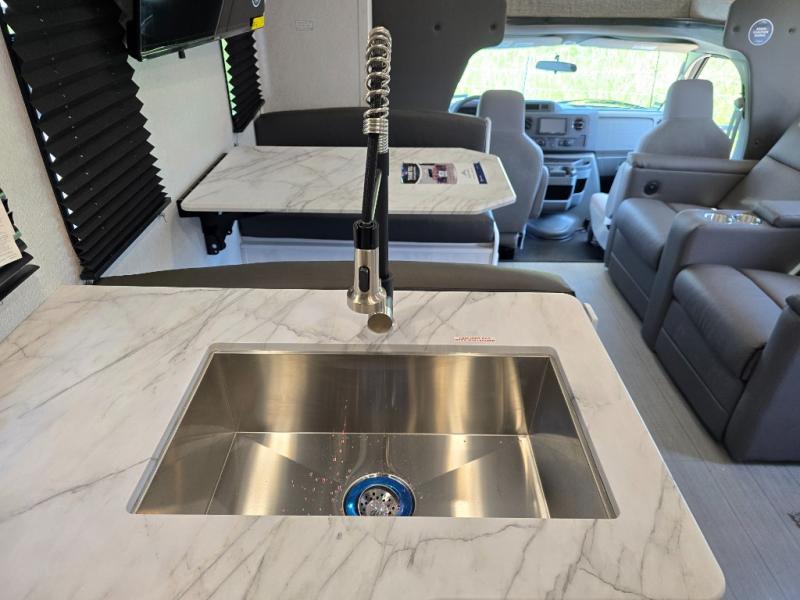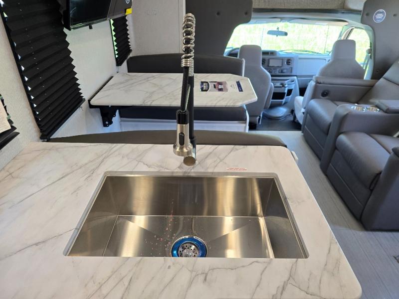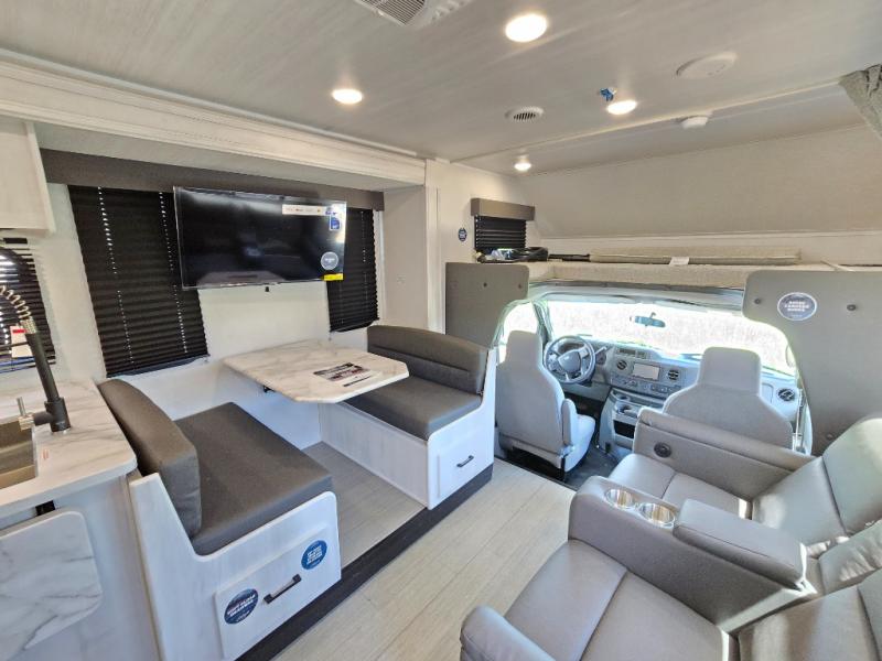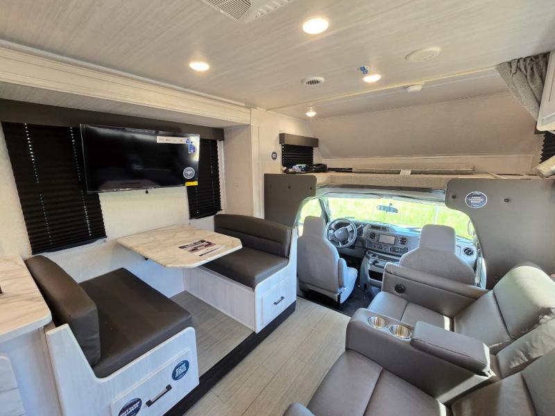 With any Entrada Class C gas motorhome from EAST TO WEST, the construction consists of a one-piece painted fiberglass front cap, a TPO roof membrane, and 2" Azdel composite sidewalls for added durability. There are rotocast exterior storage compartments with slam latch doors, along with an exterior LP Quick Connect, and a power awning with an LED light strip. You will also find rear and sideview cameras to help make maneuvering and parking your RV easier than ever. Inside, you'll feel right at home with soft close hardwood cabinet doors and drawers, a high-altitude tankless water heater, plus a 12V smart TV and USB ports to keep your electronics charged up!