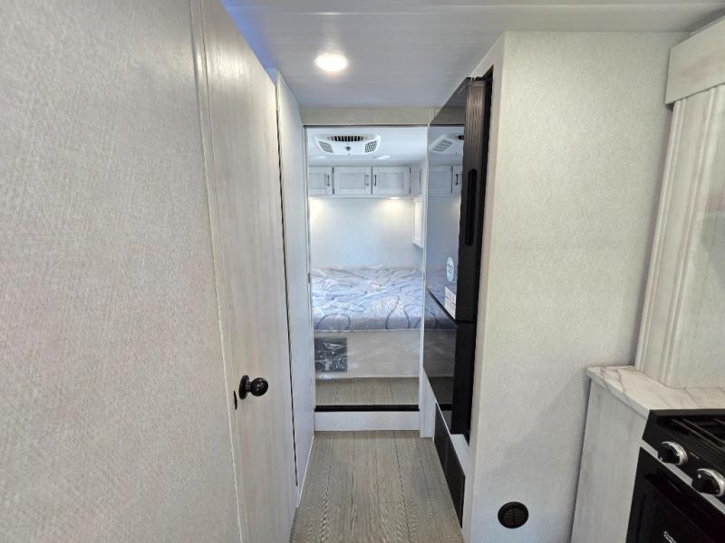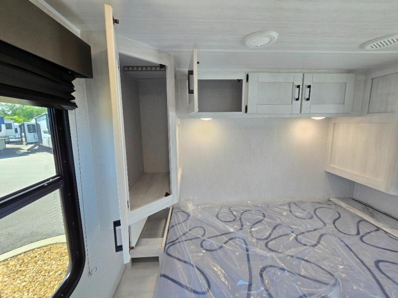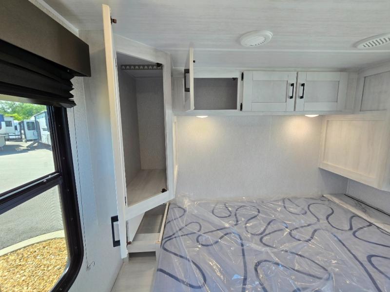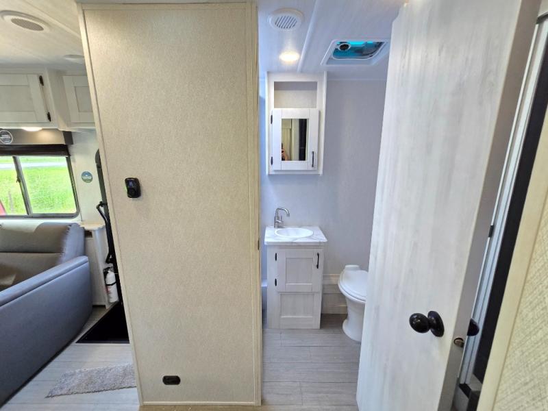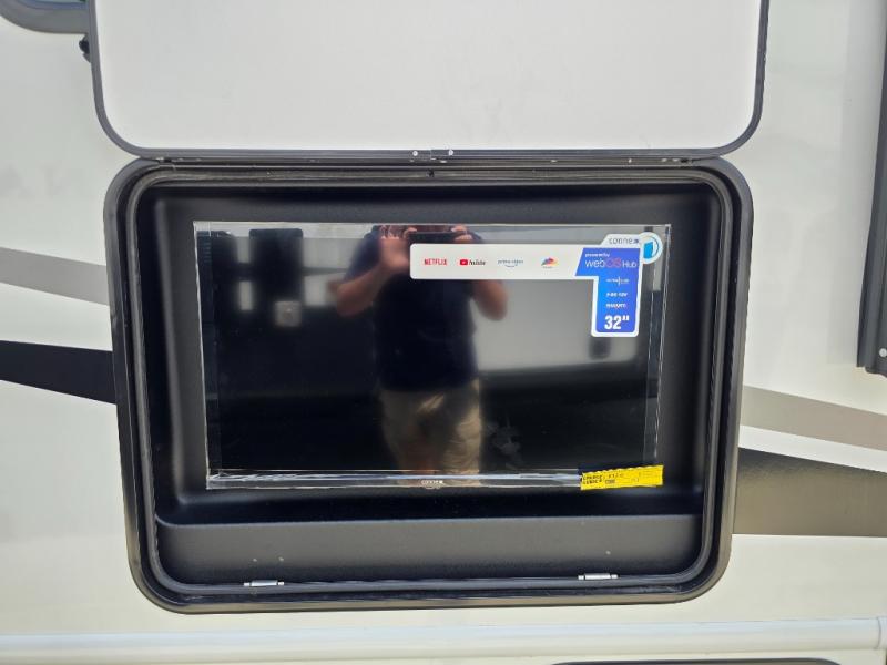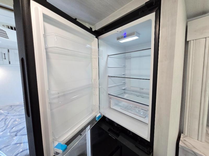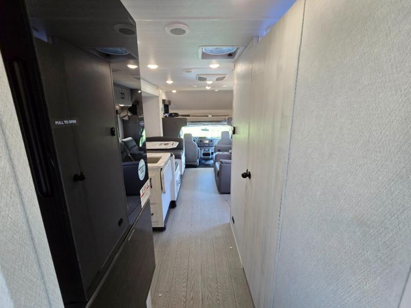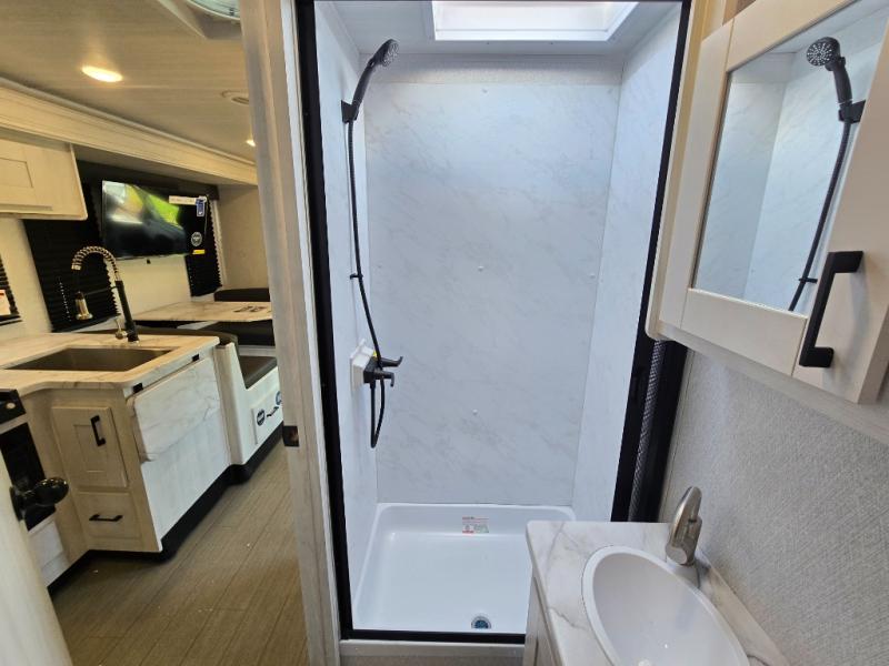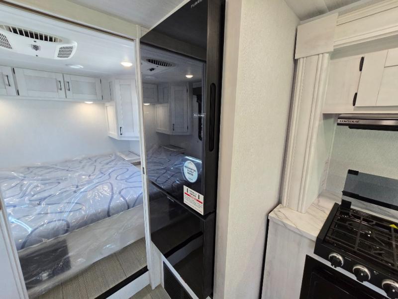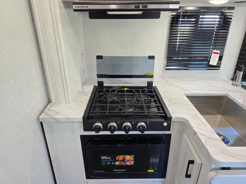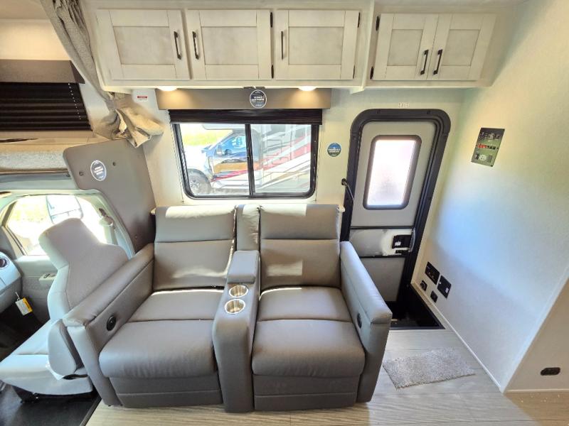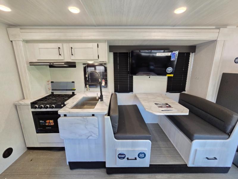 Comfort comes easy in this coach with theater seats and a slide out for more space! You'll find the booth dinette within the slide, along with the cooktop and convection microwave with air fryer technology. A double bowl sink will make clean up easier than ever, and there is a 12V dual swing refrigerator to keep your cold items fresh. The full bath with a 24" x 36" shower will let you clean up each day, and the rear private bedroom with a king bed is sure to provide a great night's rest! And any guests you may have can sleep on the 60" x 80" bunk-over cab or on the dinette once converted to sleeping space!