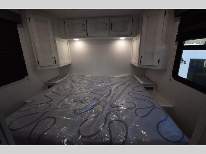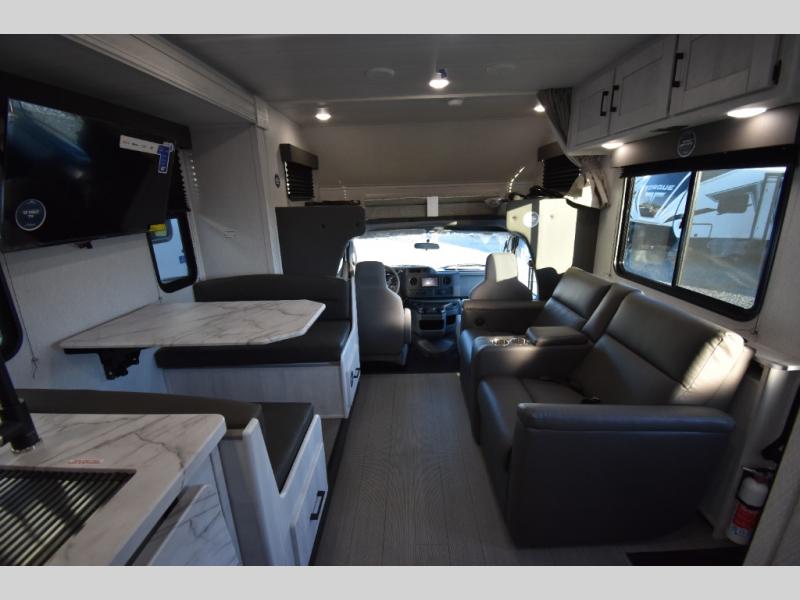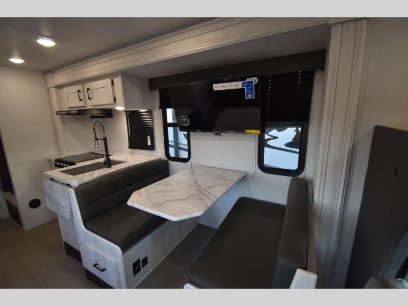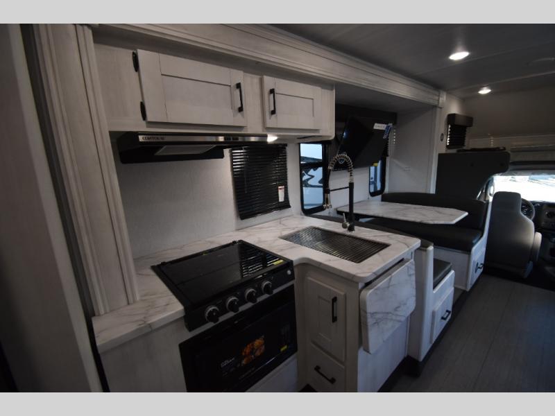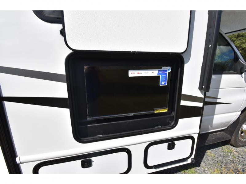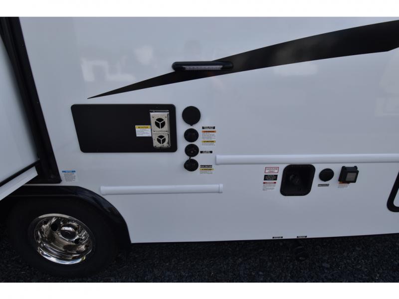 With any Entrada Class C gas motorhome from EAST TO WEST, the construction consists of a one-piece painted fiberglass front cap, a TPO roof membrane, and 2" Azdel composite sidewalls for added durability. There are rotocast exterior storage compartments with slam latch doors, along with an exterior LP Quick Connect, and a power awning with an LED light strip. You will also find rear and sideview cameras to help make maneuvering and parking your RV easier than ever. Inside, you'll feel right at home with soft close hardwood cabinet doors and drawers, a high-altitude tankless water heater, plus a 12V smart TV and USB ports to keep your electronics charged up!