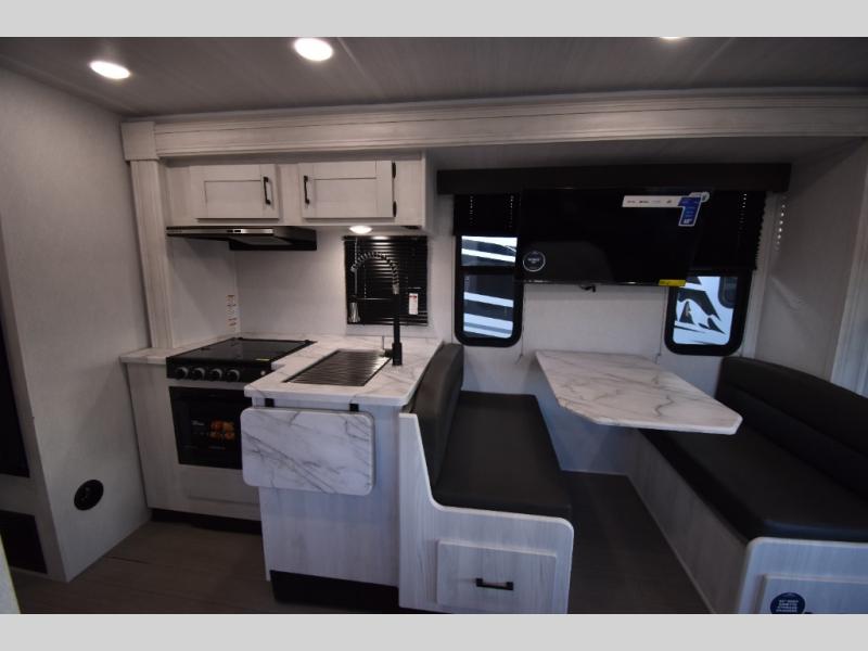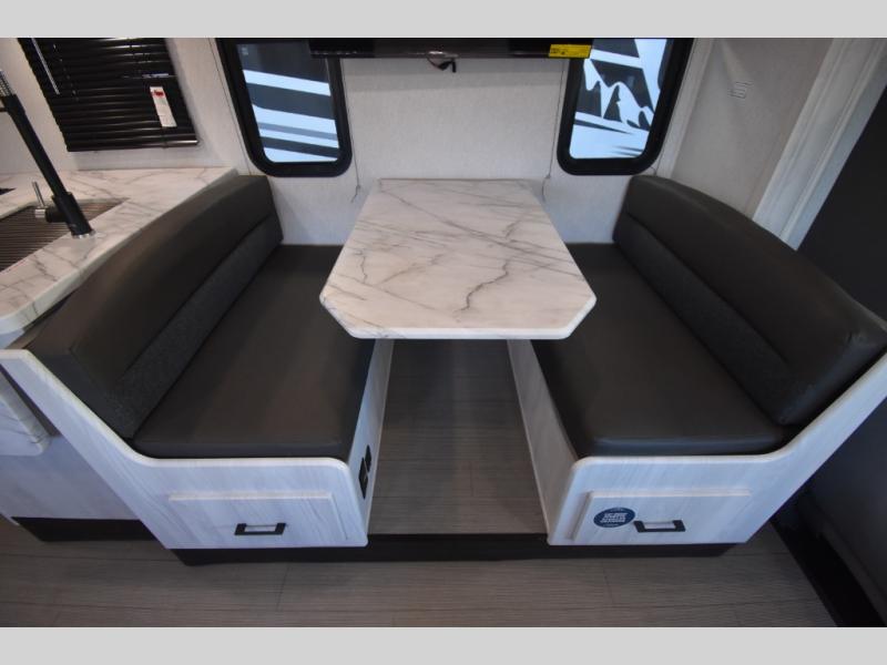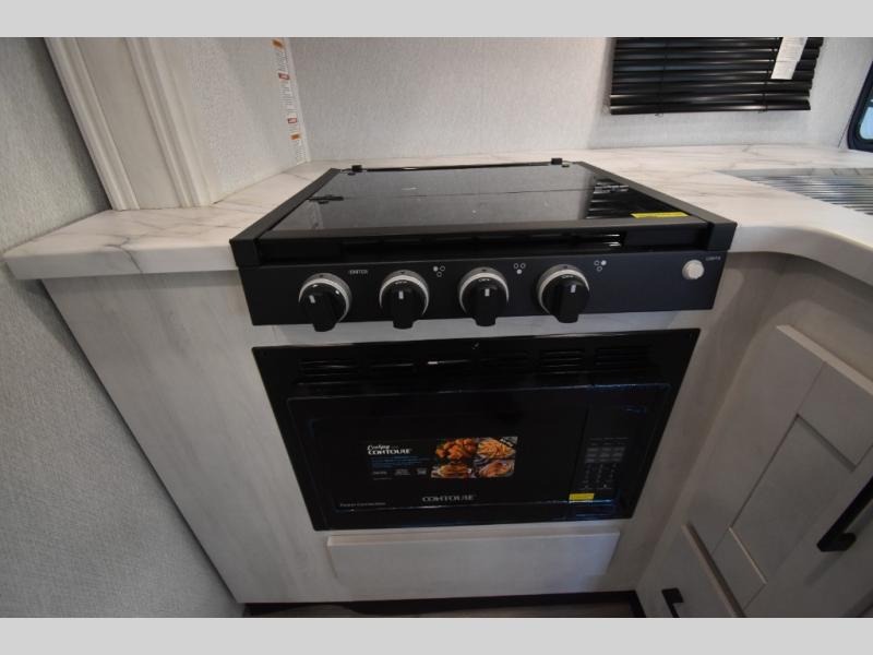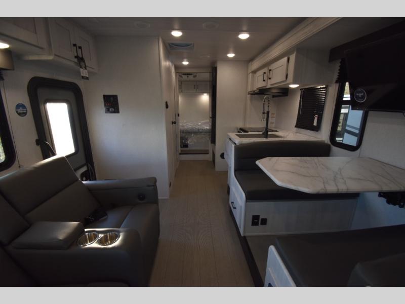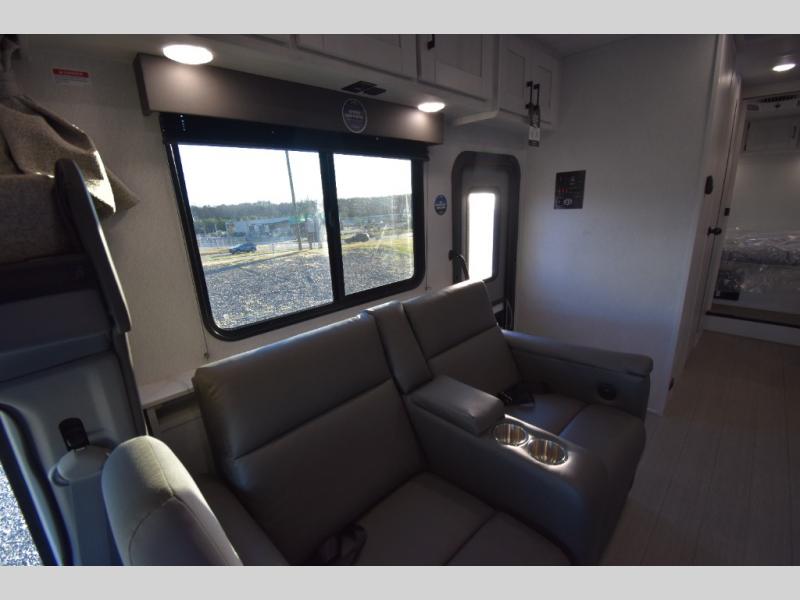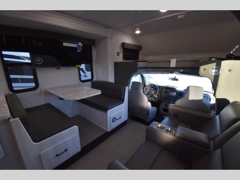 Comfort comes easy in this coach with theater seats and a slide out for more space! You'll find the booth dinette within the slide, along with the cooktop and convection microwave with air fryer technology. A double bowl sink will make clean up easier than ever, and there is a 12V dual swing refrigerator to keep your cold items fresh. The full bath with a 24" x 36" shower will let you clean up each day, and the rear private bedroom with a king bed is sure to provide a great night's rest! And any guests you may have can sleep on the 60" x 80" bunk-over cab or on the dinette once converted to sleeping space!