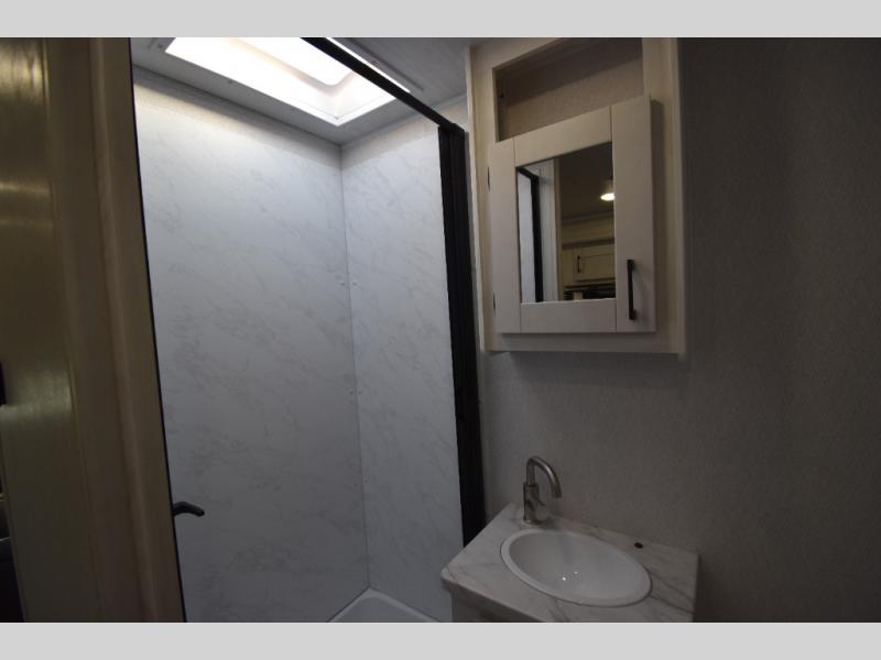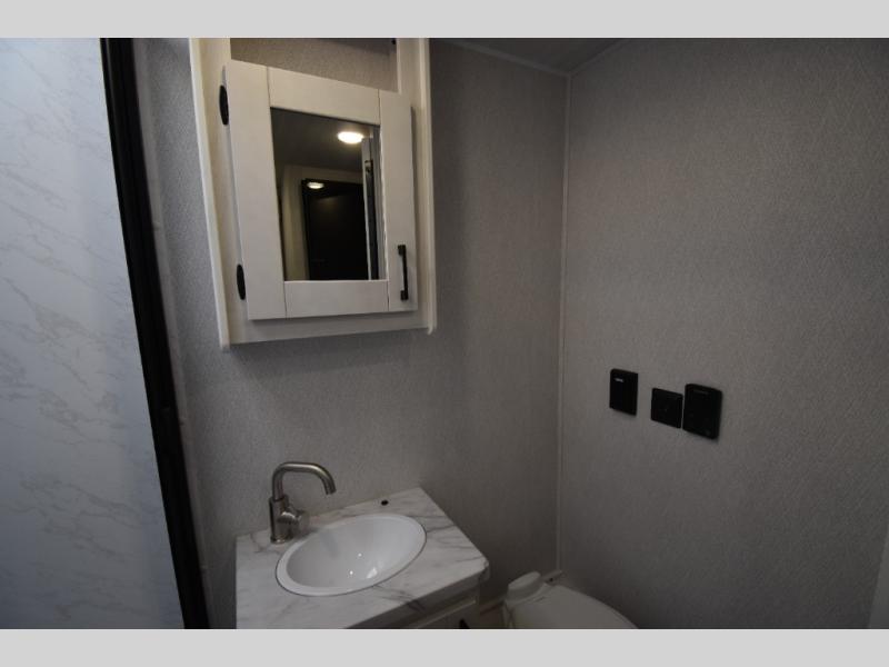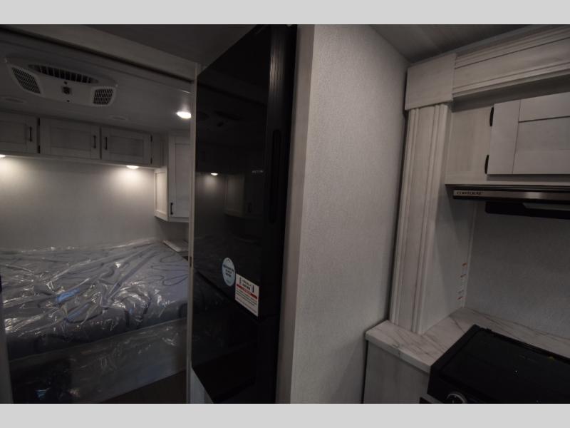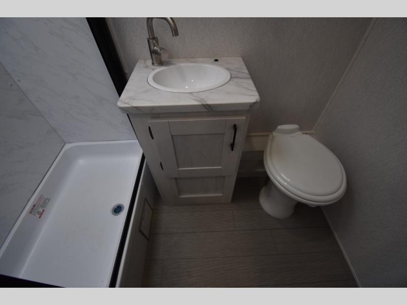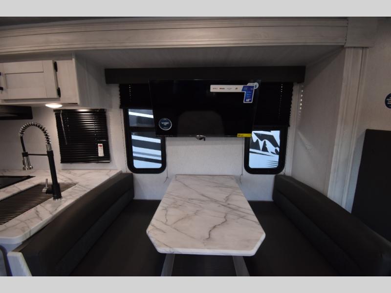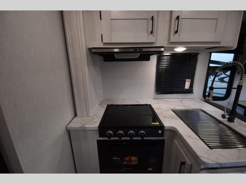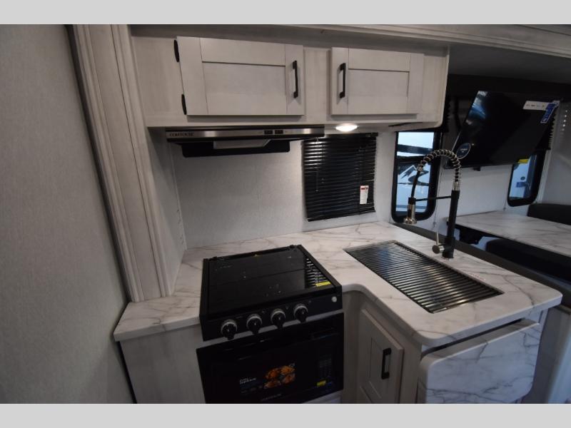 Comfort comes easy in this coach with theater seats and a slide out for more space! You'll find the booth dinette within the slide, along with the cooktop and convection microwave with air fryer technology. A double bowl sink will make clean up easier than ever, and there is a 12V dual swing refrigerator to keep your cold items fresh. The full bath with a 24" x 36" shower will let you clean up each day, and the rear private bedroom with a king bed is sure to provide a great night's rest! And any guests you may have can sleep on the 60" x 80" bunk-over cab or on the dinette once converted to sleeping space!