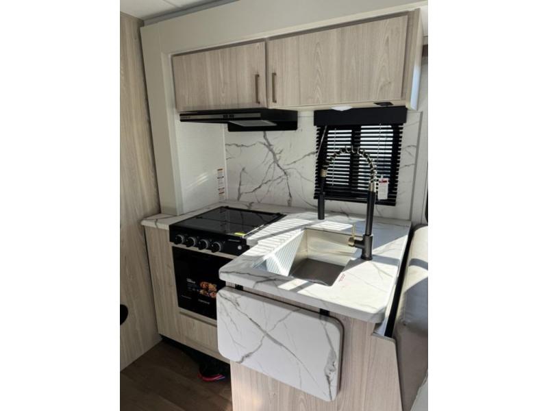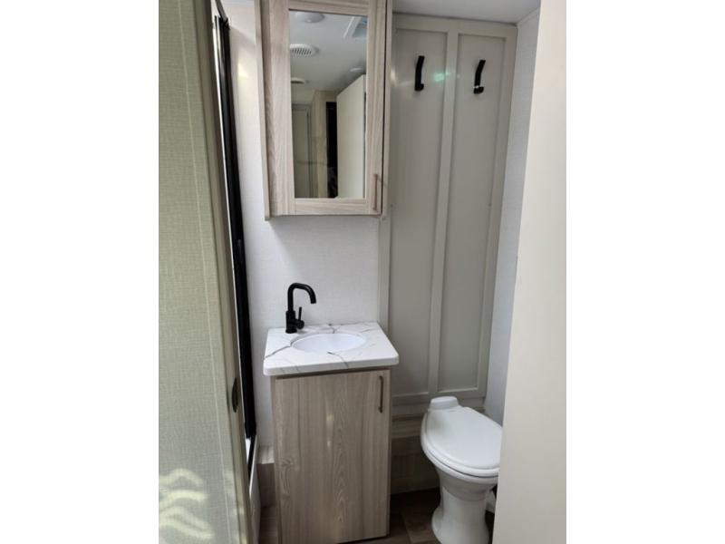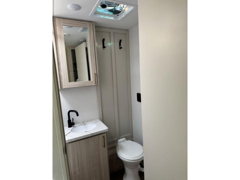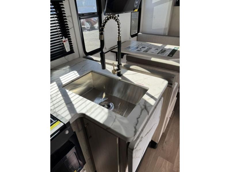 Comfort comes easy in this coach with theater seats and a slide out for more space! You'll find the booth dinette within the slide, along with the cooktop and convection microwave with air fryer technology. A double bowl sink will make clean up easier than ever, and there is a 12V dual swing refrigerator to keep your cold items fresh. The full bath with a 24" x 36" shower will let you clean up each day, and the rear private bedroom with a king bed is sure to provide a great night's rest! And any guests you may have can sleep on the 60" x 80" bunk-over cab or on the dinette once converted to sleeping space!