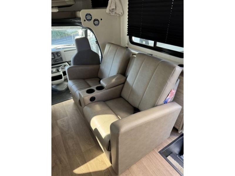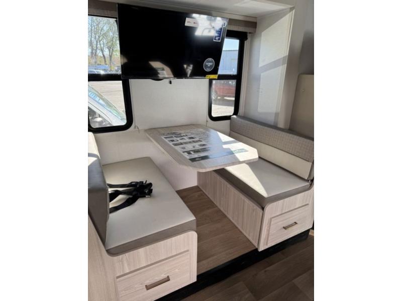 With any Entrada Class C gas motorhome from EAST TO WEST, the construction consists of a one-piece painted fiberglass front cap, a TPO roof membrane, and 2" Azdel composite sidewalls for added durability. There are rotocast exterior storage compartments with slam latch doors, along with an exterior LP Quick Connect, and a power awning with an LED light strip. You will also find rear and sideview cameras to help make maneuvering and parking your RV easier than ever. Inside, you'll feel right at home with soft close hardwood cabinet doors and drawers, a high-altitude tankless water heater, plus a 12V smart TV and USB ports to keep your electronics charged up!