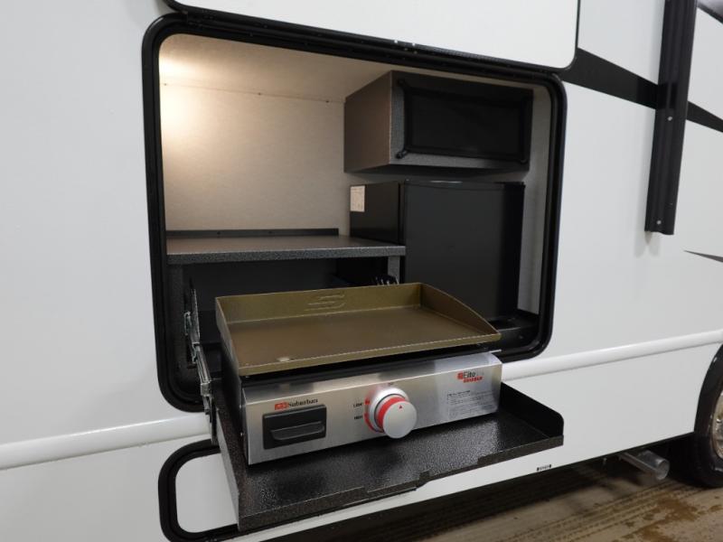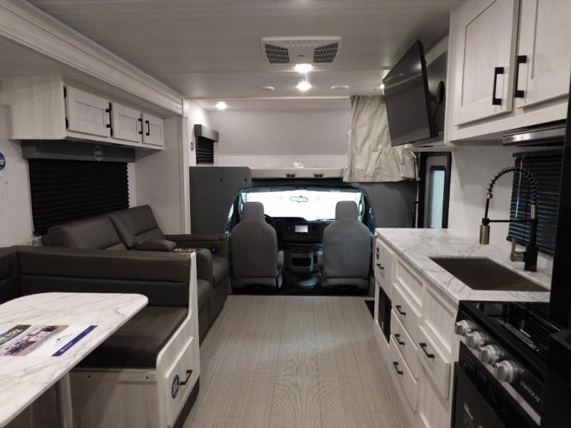 With any Entrada Class C gas motorhome from EAST TO WEST, the construction consists of an automotive painted fiberglass front cap, a Dicor DiFlex ll TPO roof membrane, and Azdel composite sidewalls for added durability. Some of the Entrada value package features include 12V tank heaters to camp during the cooler months, the Winegard Air 360+, plus backup and sideview cameras with a monitor for safety on and off the road. The interior offers a 7-foot interior height for a spacious feel, and 12V USB charge ports will keep your electronics powered up. Choose an Entrada for its tasteful design, attention to detail, bright interior and affordable price-point!
