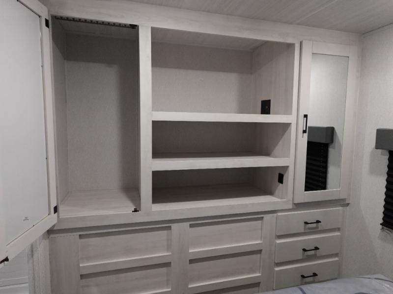 You can enjoy great adventures with your family and friends traveling in this Entrada Class C gas motorhome! This coach offers you spacious living thanks to two slides. In the main living area, the U-shaped dinette and theater seating slides out to provide you with comfortable places to sit down and rest after you have been out exploring. You'll notice that the bedroom also feels open because of its queen bed slide, and the two wardrobes and linen closet across from the bed will surely provide plenty of storage space for your belongings with TV prep in between. The kitchen has a long countertop so you can prepare meals easily with a cooktop including three burners, a convection microwave beneath, a large sink and a 10.7 cu. ft. 12V refrigerator for your perishables. The bathroom is separated with a shower along one side and a private toilet and sink opposite for added convenience allowing two occupants to be using at once.