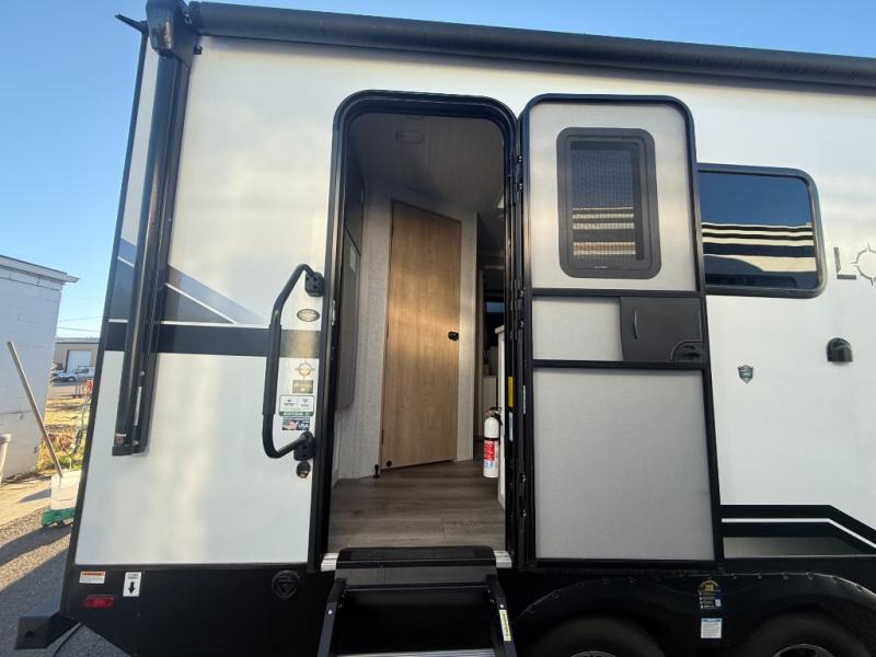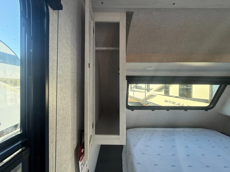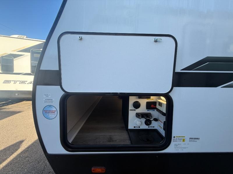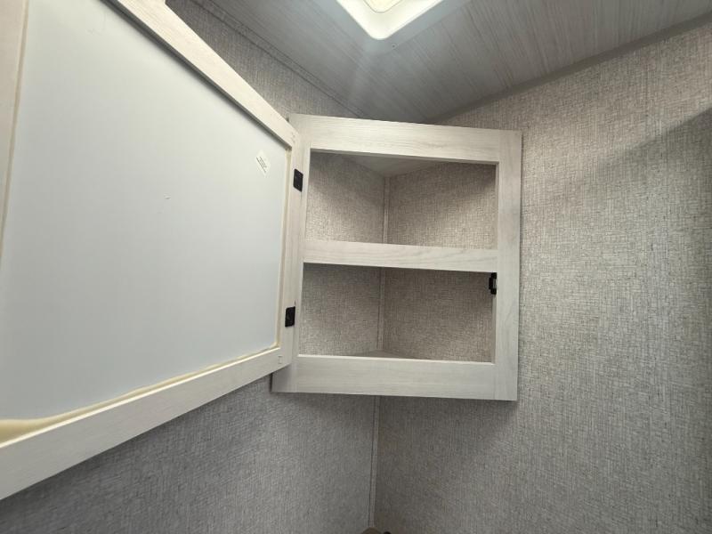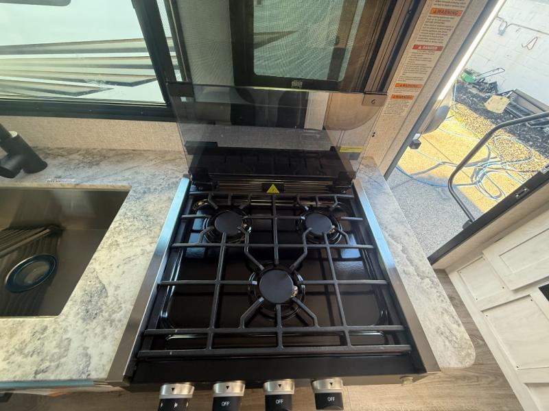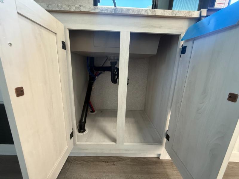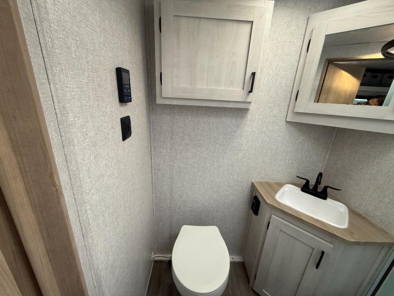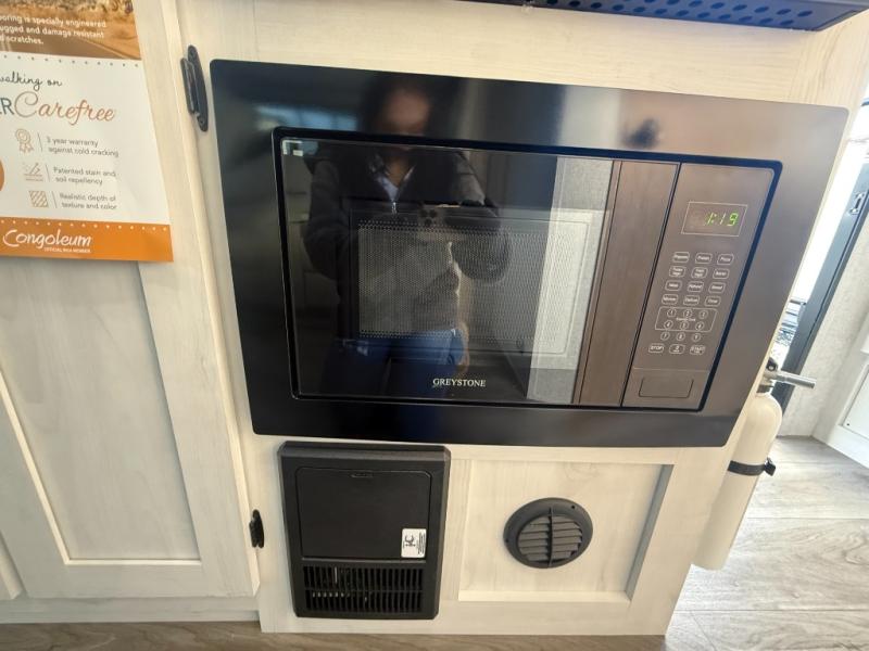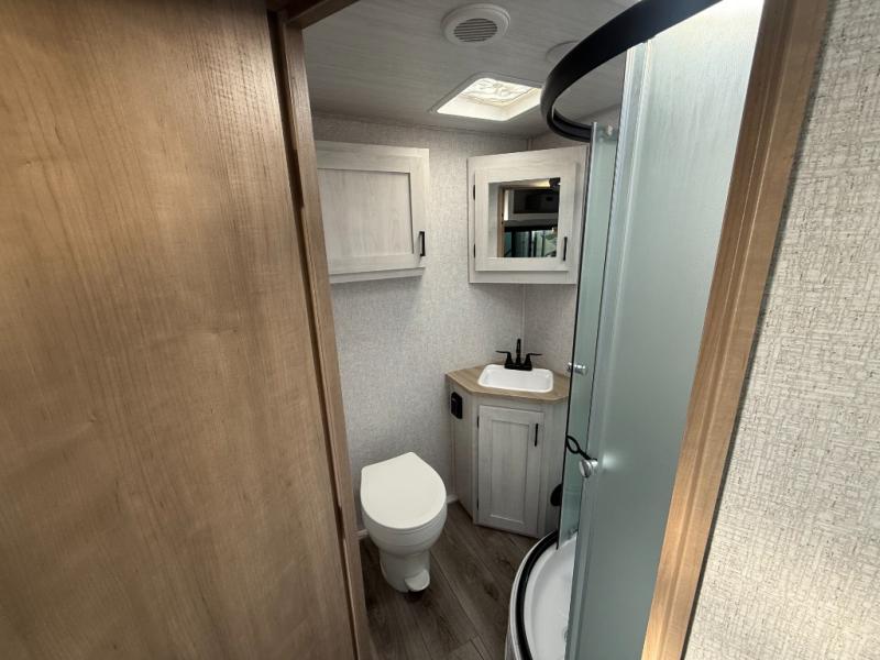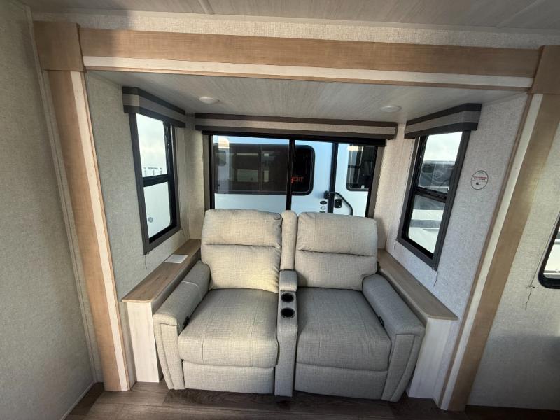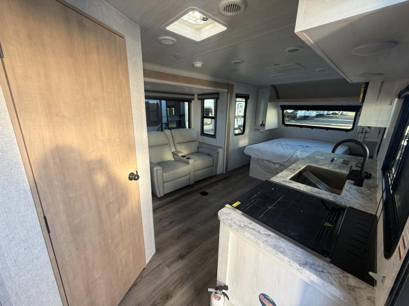 Pack your bags and head out on a fun vacation with your loved one in this travel trailer! You will get a good night's rest each night on the front queen bed with wardrobes on either side for your clothes. Freshen up each morning in the full corner bathroom with the radius shower with a skylight above to add natural lighting. The kitchen has everything you need to prepare a delicious home cooked meal including a countertop extension and air fryer microwave. Enjoy your meals at the tri-fold sofa slide with a dinette table in front of it or switch out the sofa for the optional theater seating!