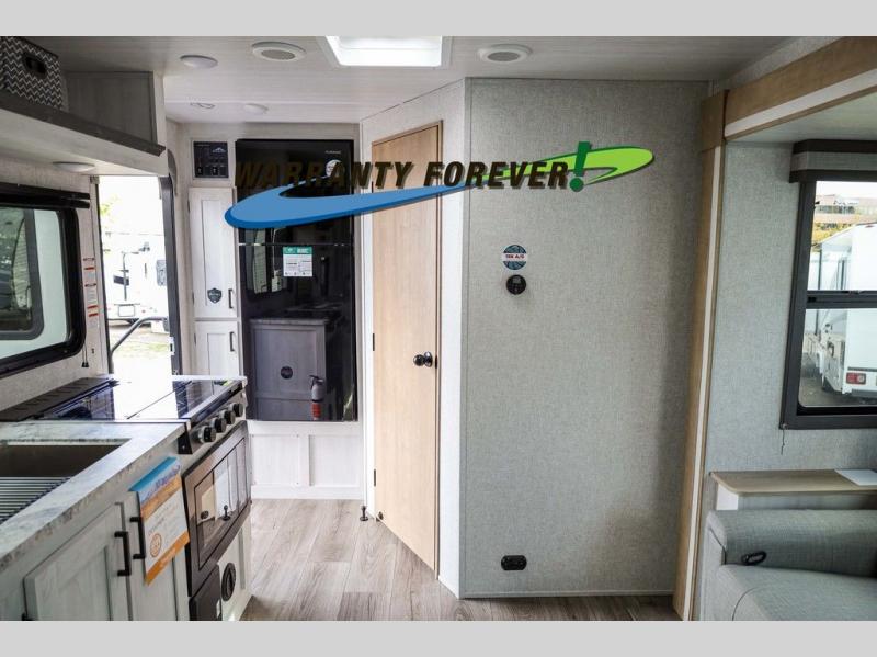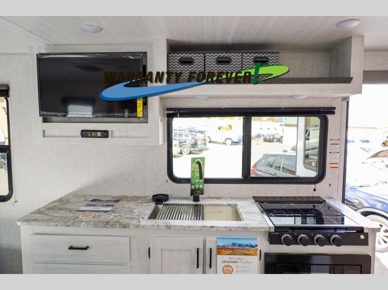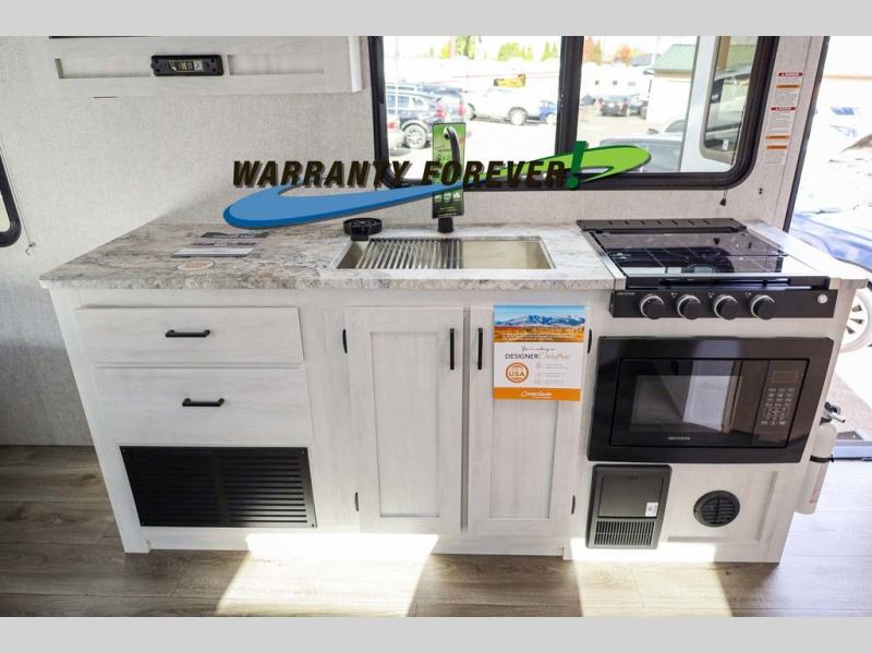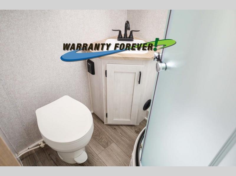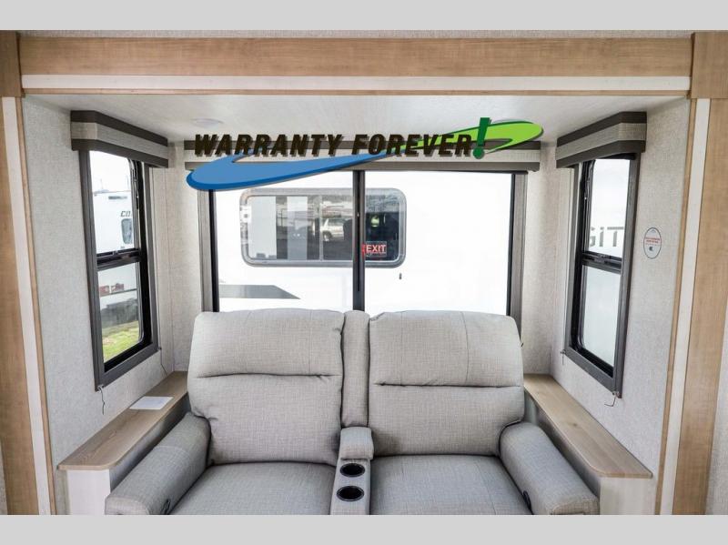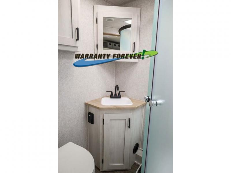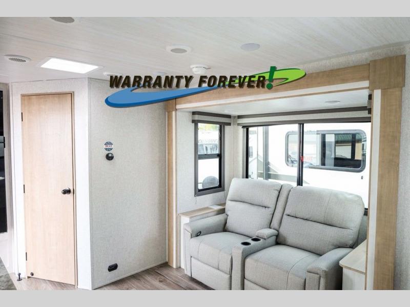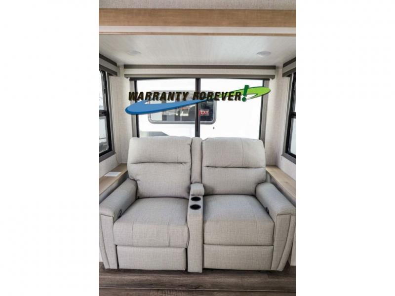 Pack your bags and head out on a fun vacation with your loved one in this travel trailer! You will get a good night's rest each night on the front queen bed with wardrobes on either side for your clothes. Freshen up each morning in the full corner bathroom with the radius shower with a skylight above to add natural lighting. The kitchen has everything you need to prepare a delicious home cooked meal including a countertop extension and air fryer microwave. Enjoy your meals at the tri-fold sofa slide with a dinette table in front of it or switch out the sofa for the optional theater seating!