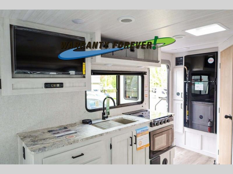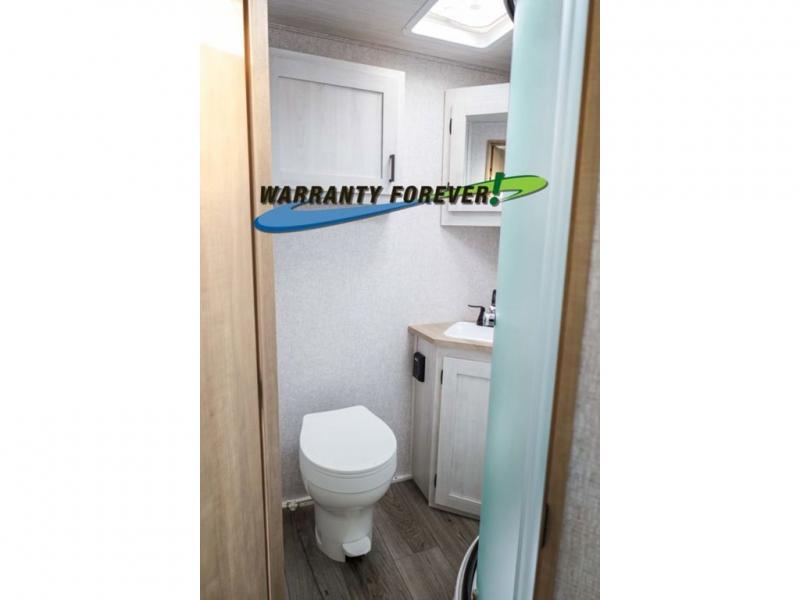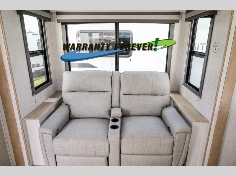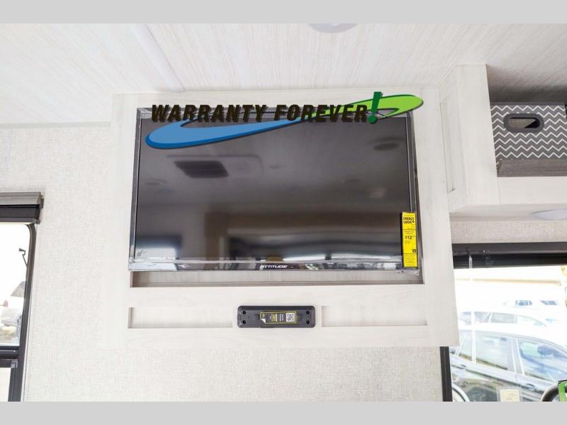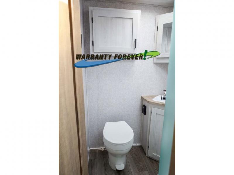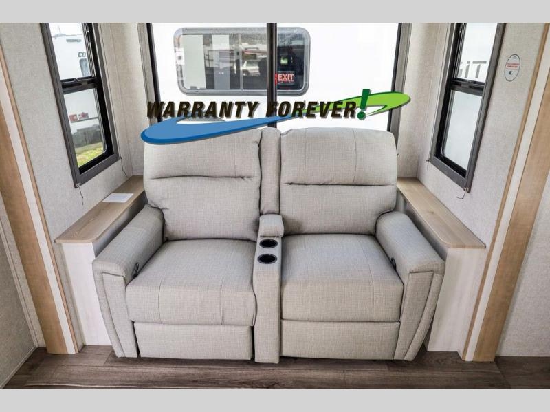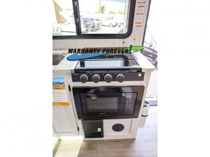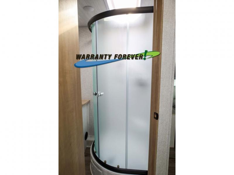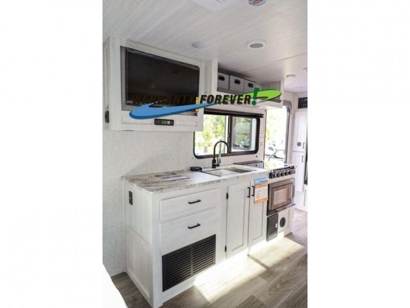 Pack your bags and head out on a fun vacation with your loved one in this travel trailer! You will get a good night's rest each night on the front queen bed with wardrobes on either side for your clothes. Freshen up each morning in the full corner bathroom with the radius shower with a skylight above to add natural lighting. The kitchen has everything you need to prepare a delicious home cooked meal including a countertop extension and air fryer microwave. Enjoy your meals at the tri-fold sofa slide with a dinette table in front of it or switch out the sofa for the optional theater seating!