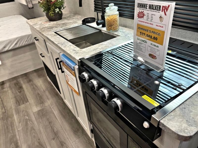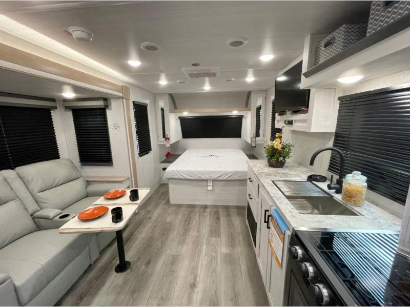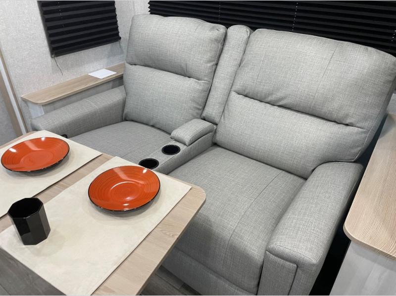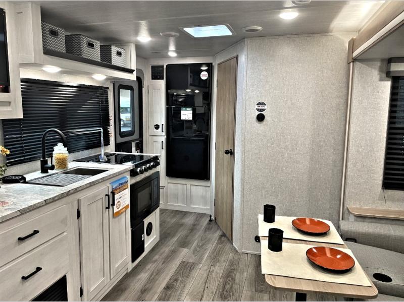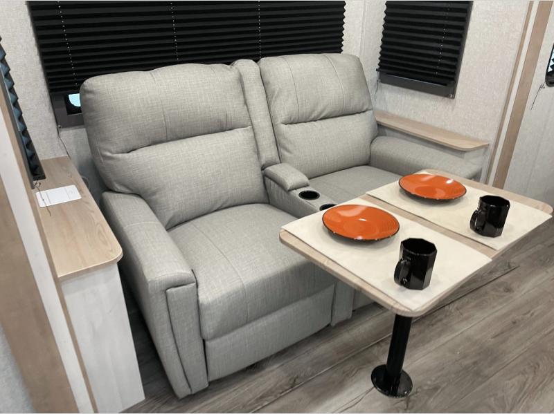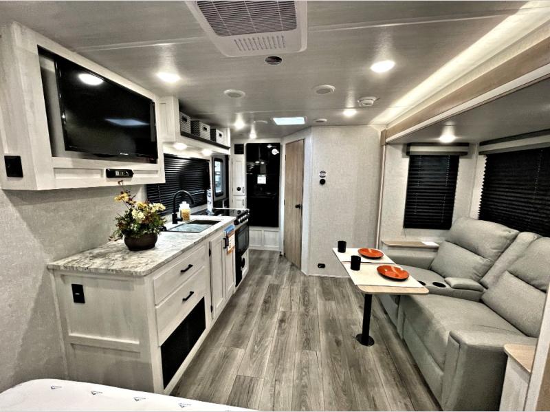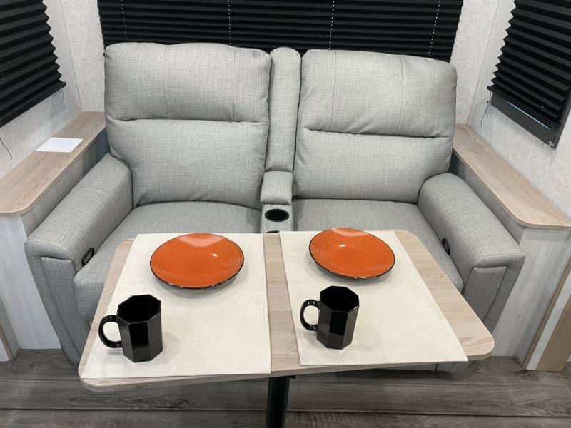 Pack your bags and head out on a fun vacation with your loved one in this travel trailer! You will get a good night's rest each night on the front queen bed with wardrobes on either side for your clothes. Freshen up each morning in the full corner bathroom with the radius shower with a skylight above to add natural lighting. The kitchen has everything you need to prepare a delicious home cooked meal including a countertop extension and air fryer microwave. Enjoy your meals at the tri-fold sofa slide with a dinette table in front of it or switch out the sofa for the optional theater seating!