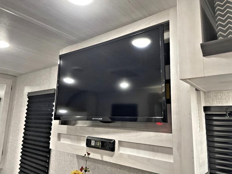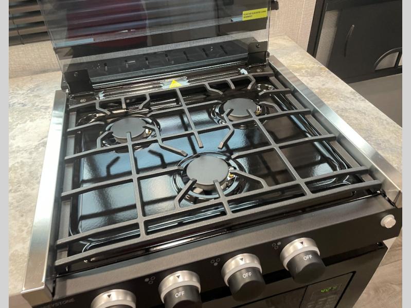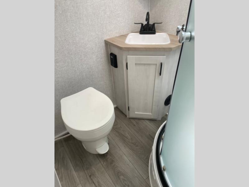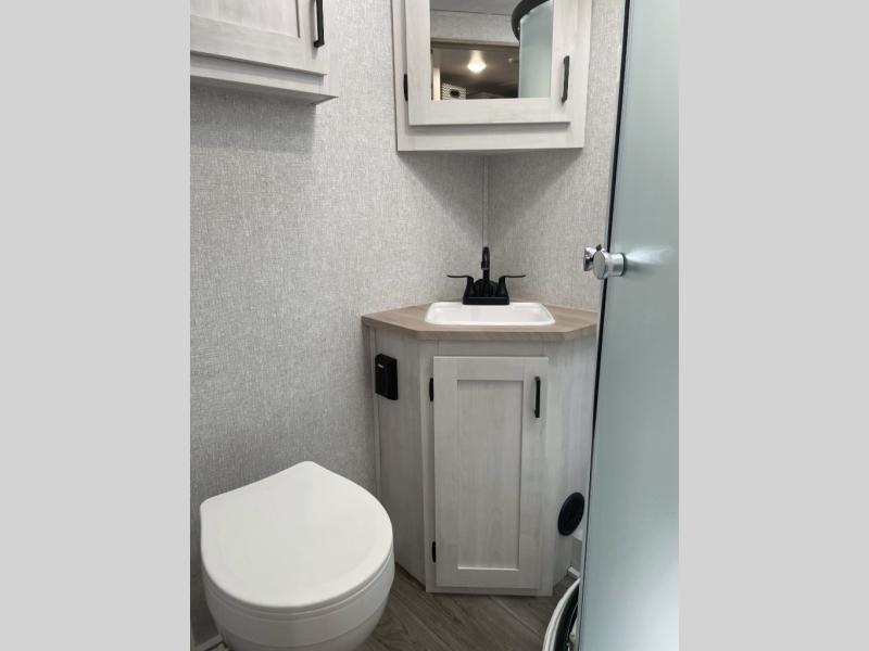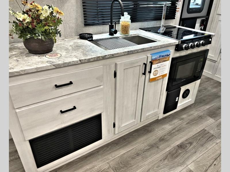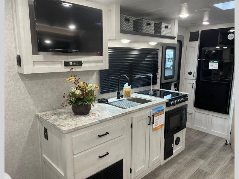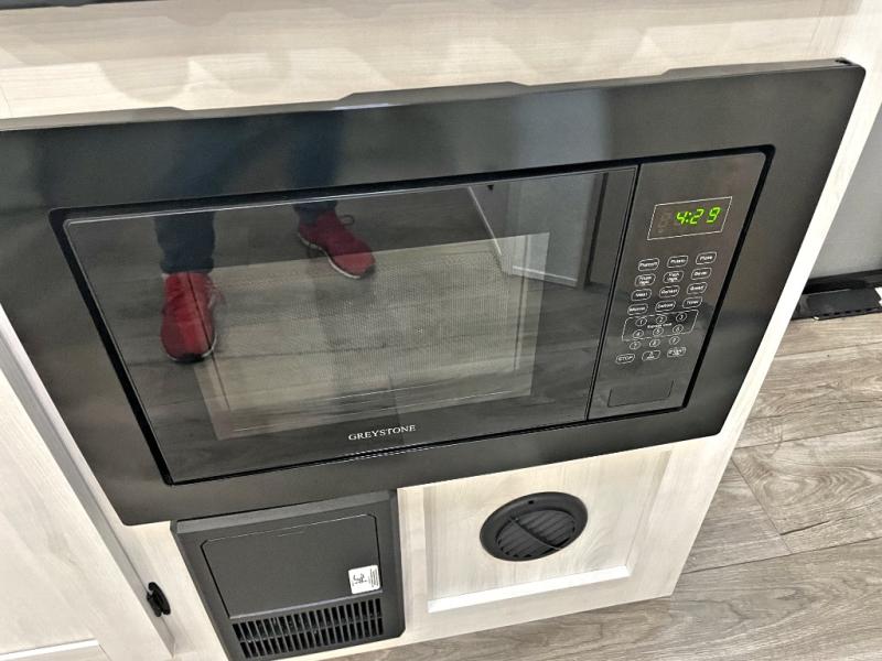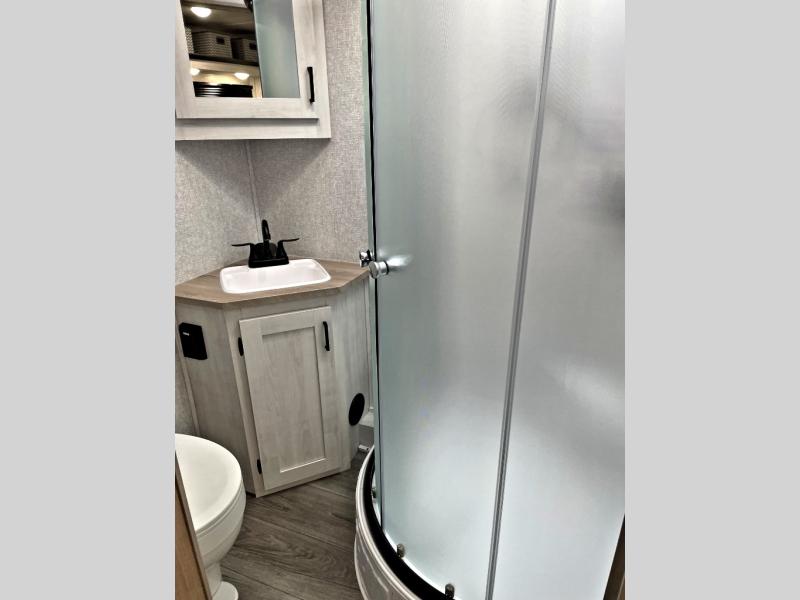 Pack your bags and head out on a fun vacation with your loved one in this travel trailer! You will get a good night's rest each night on the front queen bed with wardrobes on either side for your clothes. Freshen up each morning in the full corner bathroom with the radius shower with a skylight above to add natural lighting. The kitchen has everything you need to prepare a delicious home cooked meal including a countertop extension and air fryer microwave. Enjoy your meals at the tri-fold sofa slide with a dinette table in front of it or switch out the sofa for the optional theater seating!