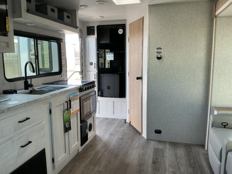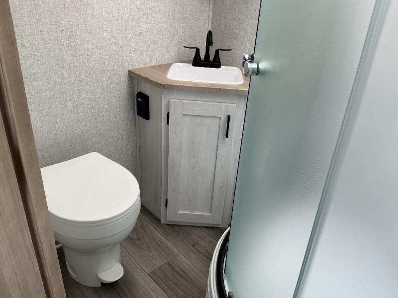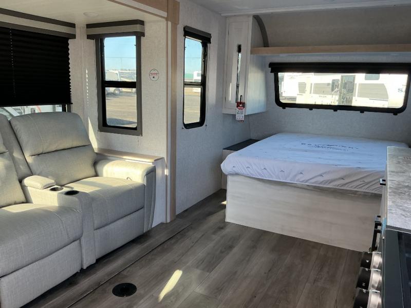 Pack your bags and head out on a fun vacation with your loved one in this travel trailer! You will get a good night's rest each night on the front queen bed with wardrobes on either side for your clothes. Freshen up each morning in the full corner bathroom with the radius shower with a skylight above to add natural lighting. The kitchen has everything you need to prepare a delicious home cooked meal including a countertop extension and a two-burner range. Enjoy your meals at the tri-fold sofa slide with a dinette table in front of it or switch out the sofa for the optional theater seating!