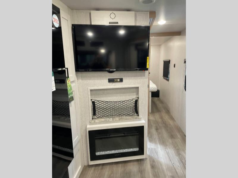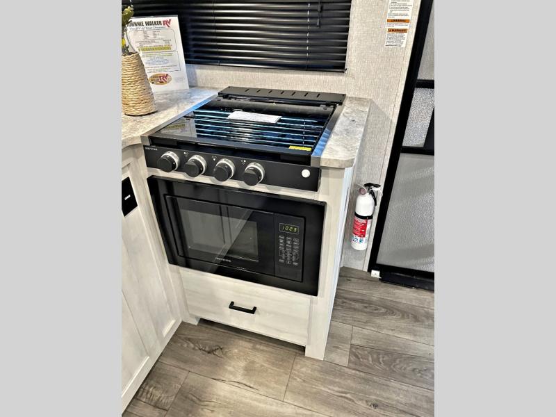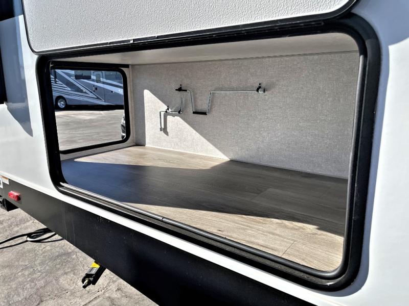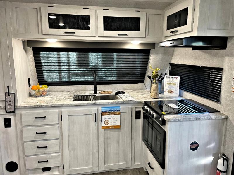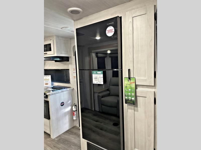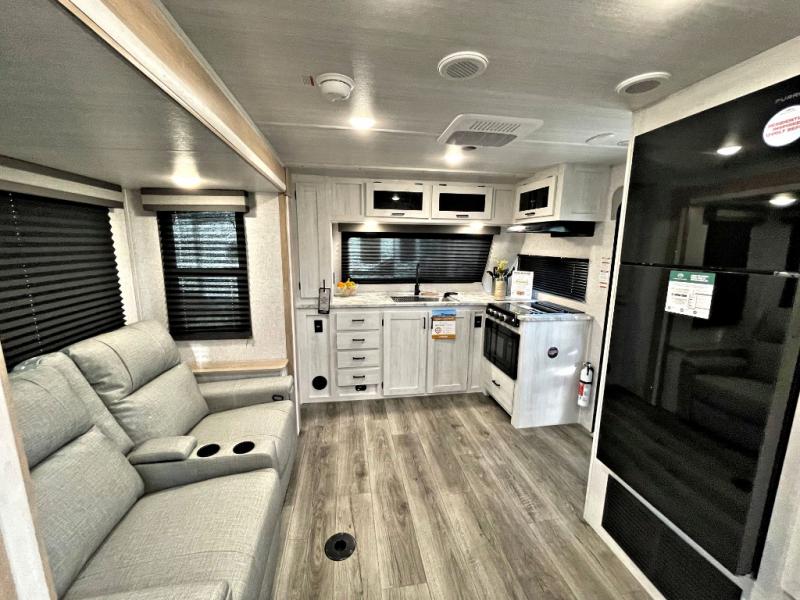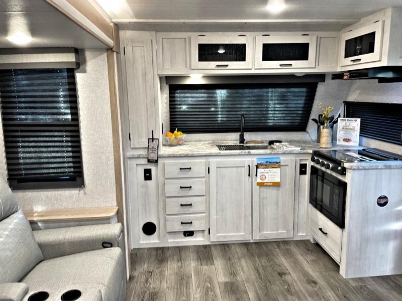 If you've been looking for a couple's trailer to take to the campground, this is the one! You will love the generous counter space in the front kitchen to prepare meals each day, and the tri-fold sofa with a removable dinette table provides a place to dine at. This furniture will also double as sleeping space for any guests you have, or you can choose the optional theater seat. A full bath with a radius shower, a sink, toilet, and linen closet will let you freshen up without having to use the camp's facilities. Head to the rear private bedroom for a great night's rest on the queen bed with dual wardrobes and overhead cabinets for your things. The exterior amenities are just as numerous as the interior with a universal docking station, cargo storage, and 1.6 cu. ft. outdoor refrigerator plus more!