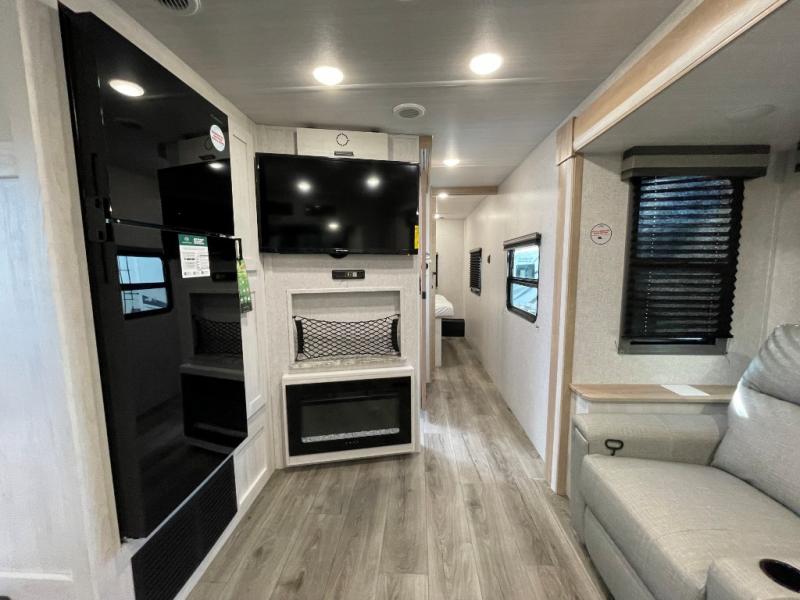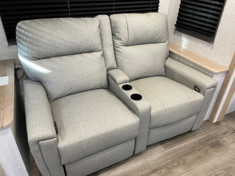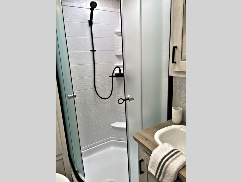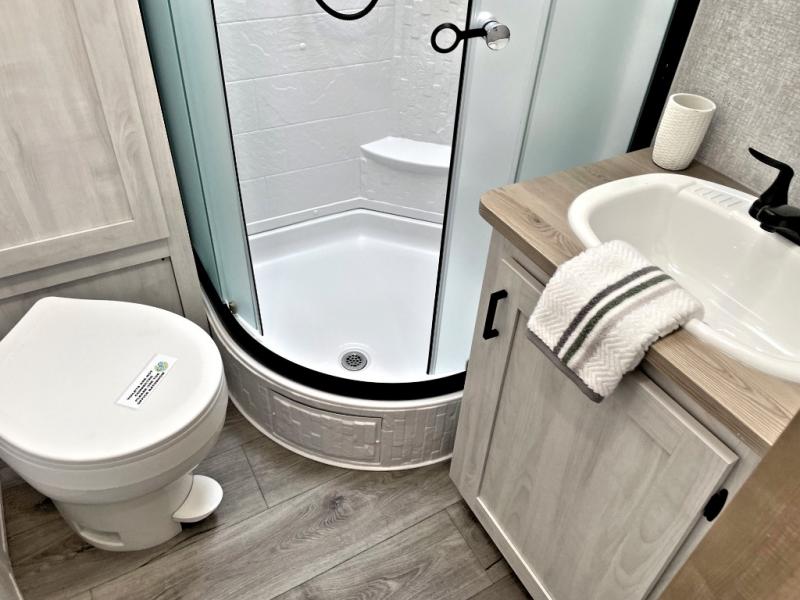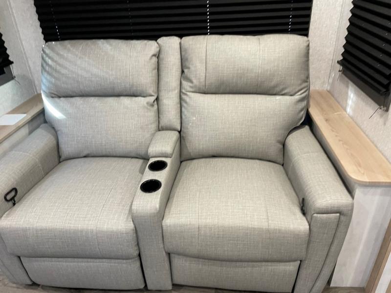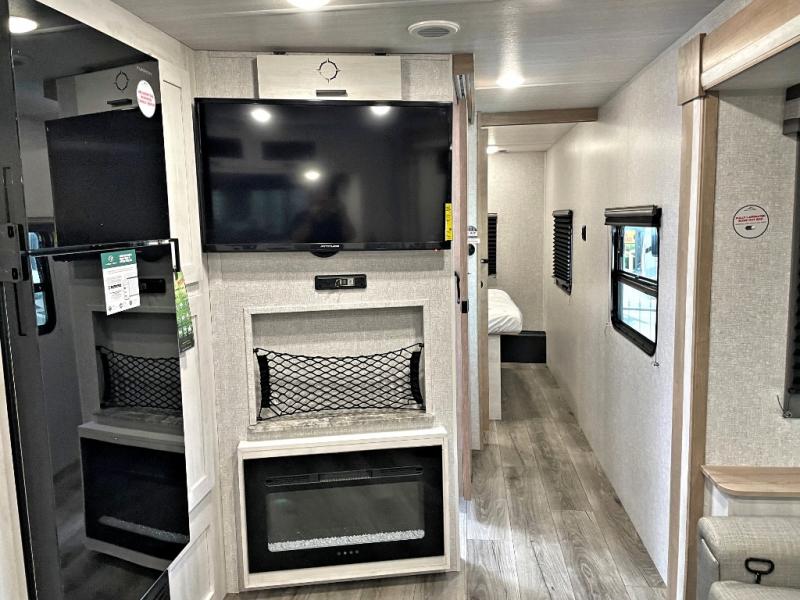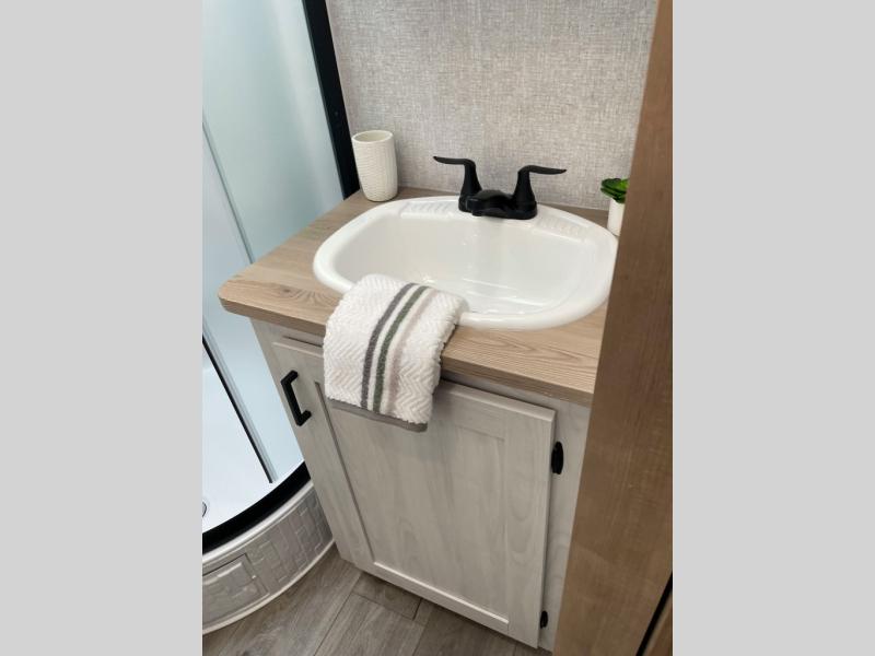 If you've been looking for a couple's trailer to take to the campground, this is the one! You will love the generous counter space in the front kitchen to prepare meals each day, and the tri-fold sofa with a removable dinette table provides a place to dine at. This furniture will also double as sleeping space for any guests you have, or you can choose the optional theater seat. A full bath with a radius shower, a sink, toilet, and linen closet will let you freshen up without having to use the camp's facilities. Head to the rear private bedroom for a great night's rest on the queen bed with dual wardrobes and overhead cabinets for your things. The exterior amenities are just as numerous as the interior with a universal docking station, cargo storage, and 1.6 cu. ft. outdoor refrigerator plus more!