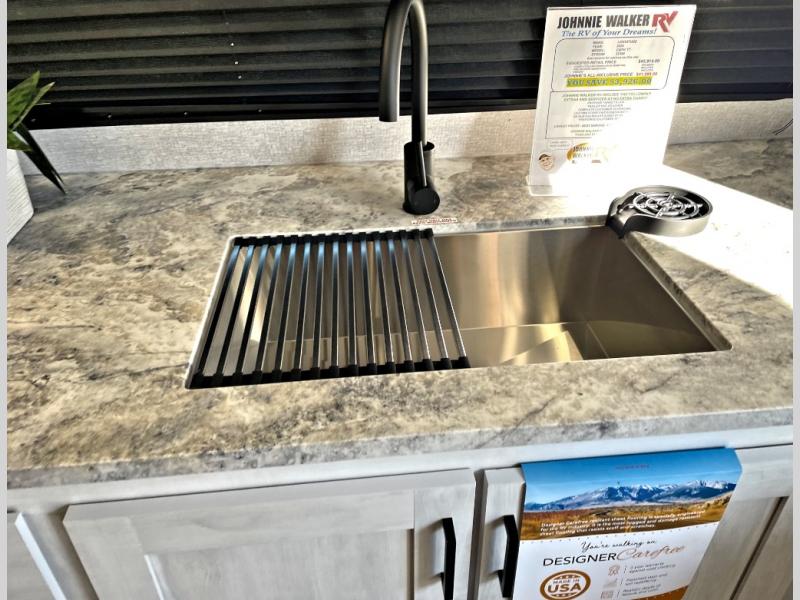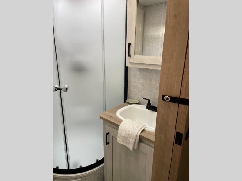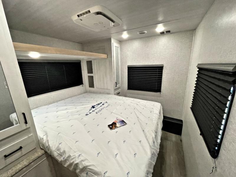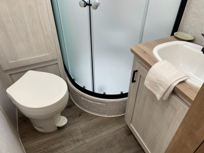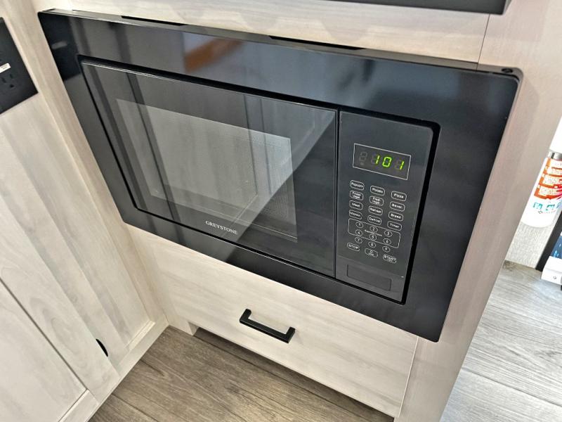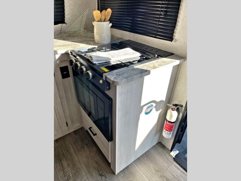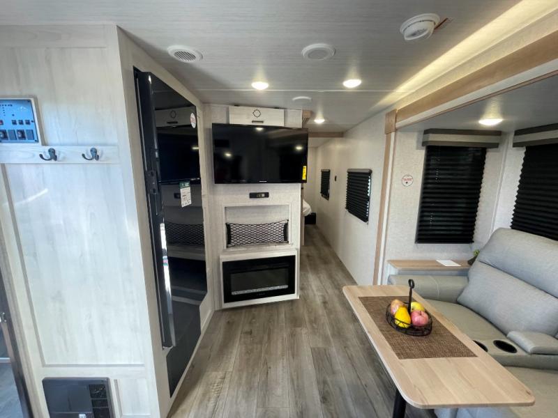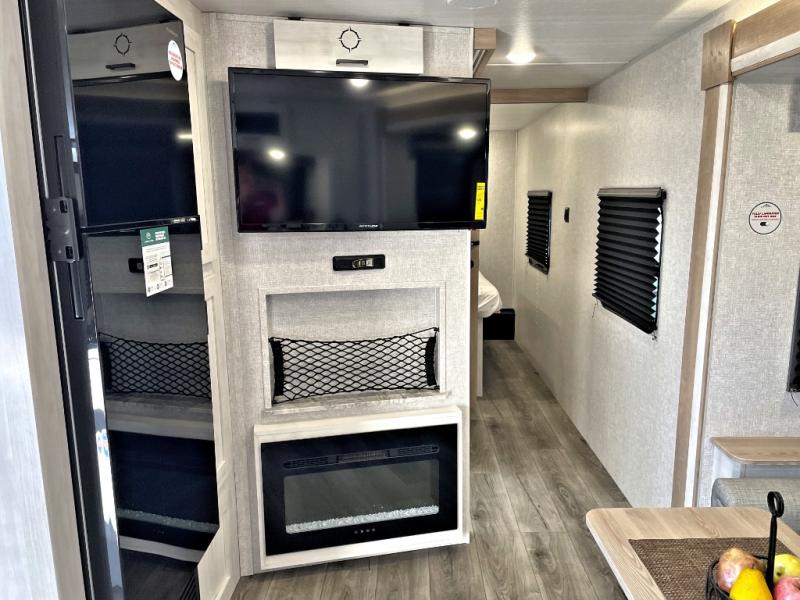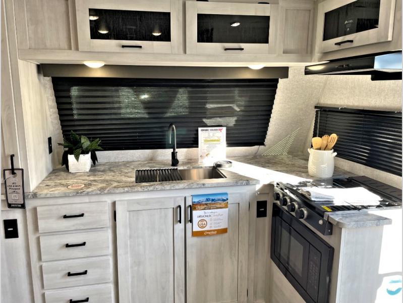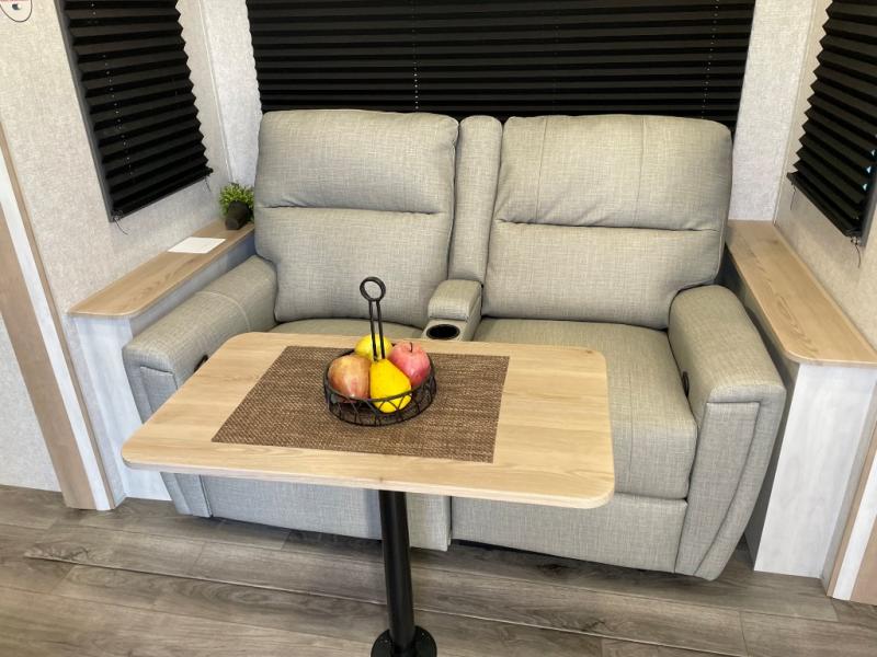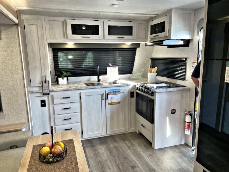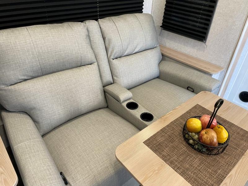 If you've been looking for a couple's trailer to take to the campground, this is the one! You will love the generous counter space in the front kitchen to prepare meals each day, and the tri-fold sofa with a removable dinette table provides a place to dine at. This furniture will also double as sleeping space for any guests you have, or you can choose the optional theater seat. A full bath with a radius shower, a sink, toilet, and linen closet will let you freshen up without having to use the camp's facilities. Head to the rear private bedroom for a great night's rest on the queen bed with dual wardrobes and overhead cabinets for your things. The exterior amenities are just as numerous as the interior with a universal docking station, cargo storage, and 1.6 cu. ft. outdoor refrigerator plus more!