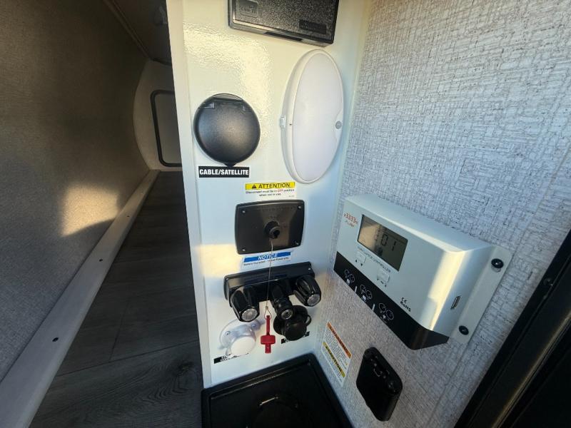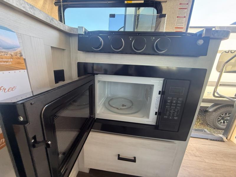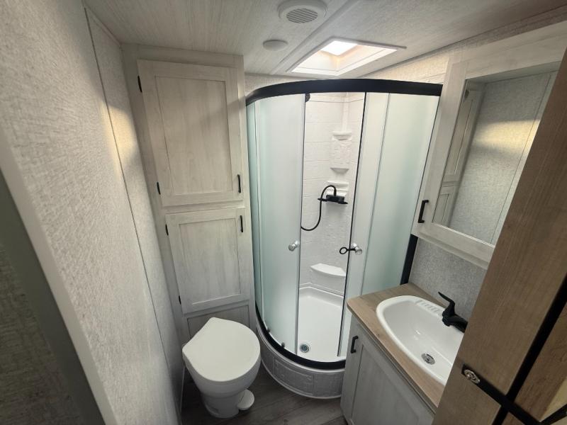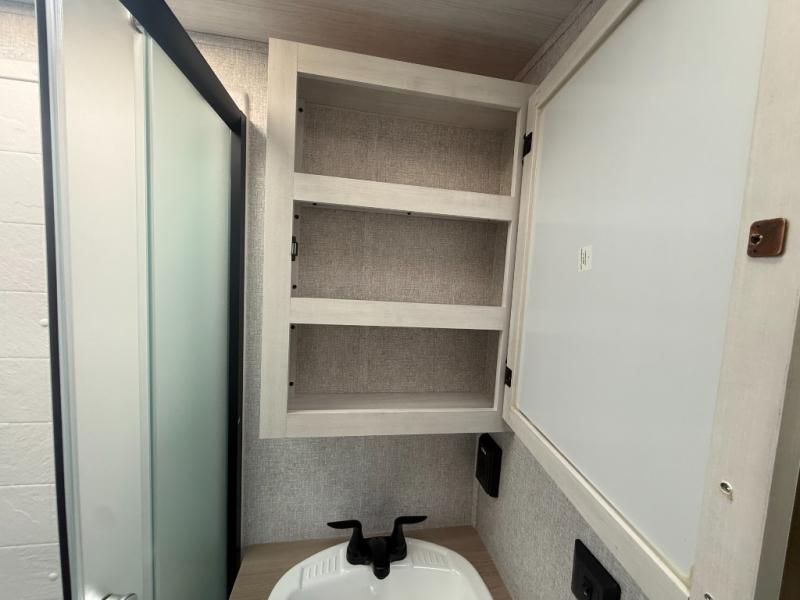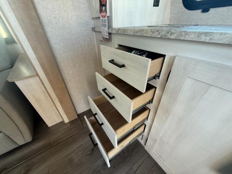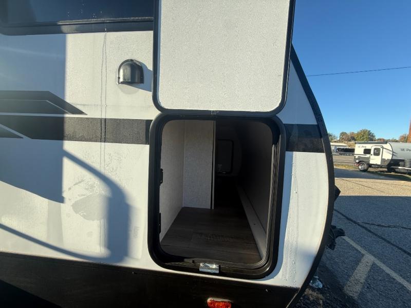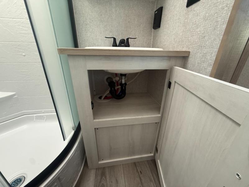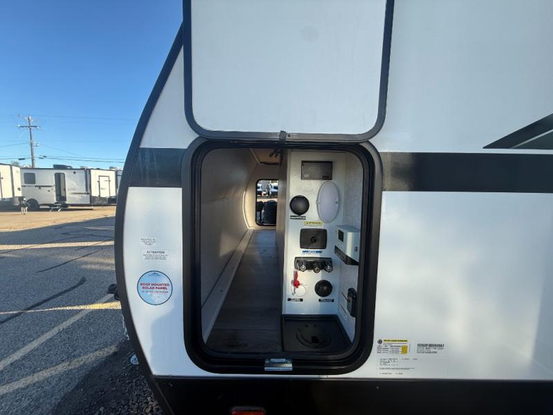 If you've been looking for a couple's trailer to take to the campground, this is the one! You will love the generous counter space in the front kitchen to prepare meals each day, and the tri-fold sofa with a removable dinette table provides a place to dine at. This furniture will also double as sleeping space for any guests you have, or you can choose the optional theater seat. A full bath with a radius shower, a sink, toilet, and linen closet will let you freshen up without having to use the camp's facilities. Head to the rear private bedroom for a great night's rest on the queen bed with dual wardrobes and overhead cabinets for your things. The exterior amenities are just as numerous as the interior with a universal docking station, cargo storage, and 1.6 cu. ft. outdoor refrigerator plus more!