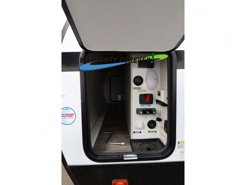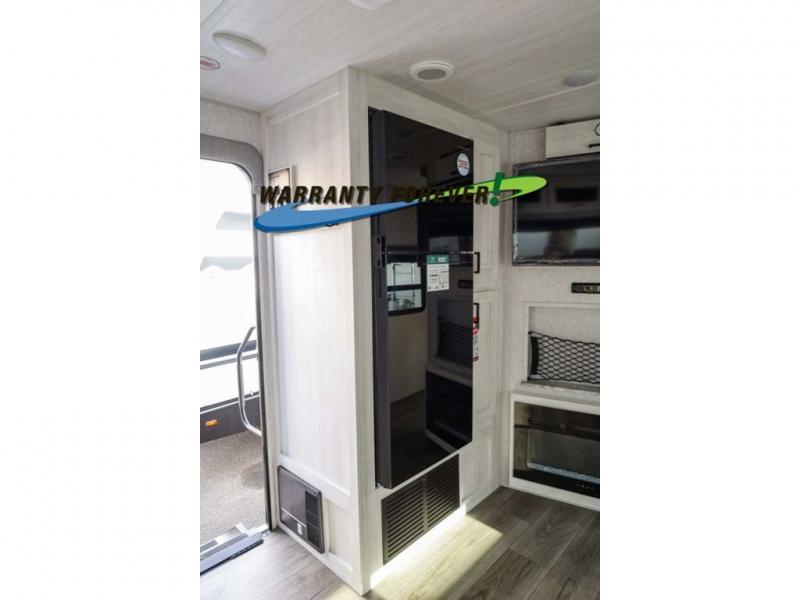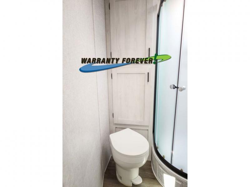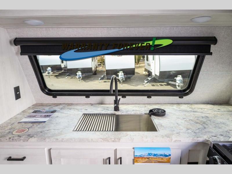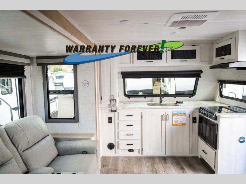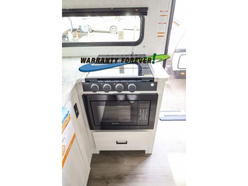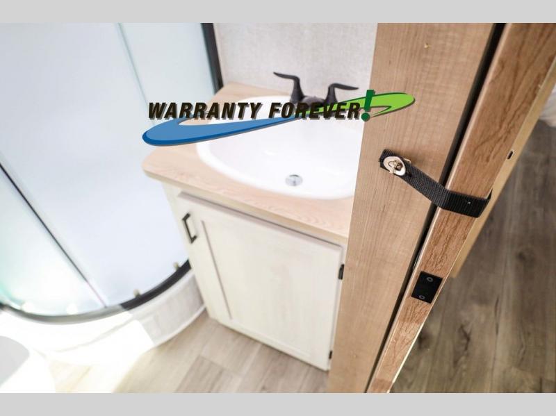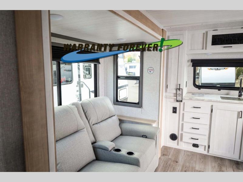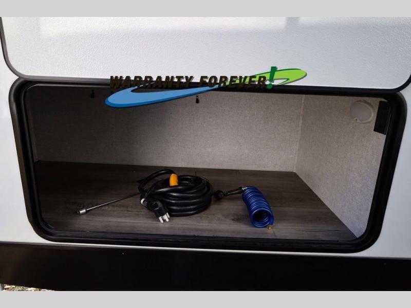 If you've been looking for a couple's trailer to take to the campground, this is the one! You will love the generous counter space in the front kitchen to prepare meals each day, and the tri-fold sofa with a removable dinette table provides a place to dine at. This furniture will also double as sleeping space for any guests you have, or you can choose the optional theater seat. A full bath with a radius shower, a sink, toilet, and linen closet will let you freshen up without having to use the camp's facilities. Head to the rear private bedroom for a great night's rest on the queen bed with dual wardrobes and overhead cabinets for your things. The exterior amenities are just as numerous as the interior with a universal docking station, cargo storage, and 1.6 cu. ft. outdoor refrigerator plus more!