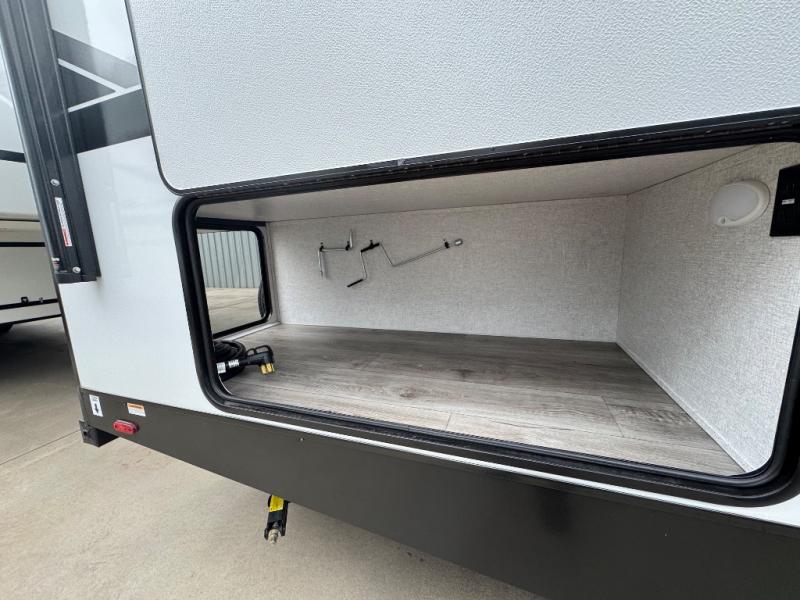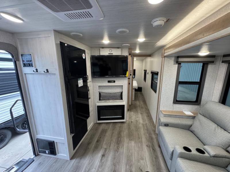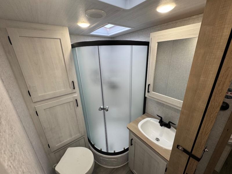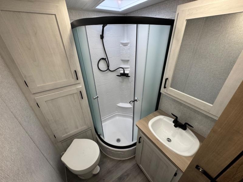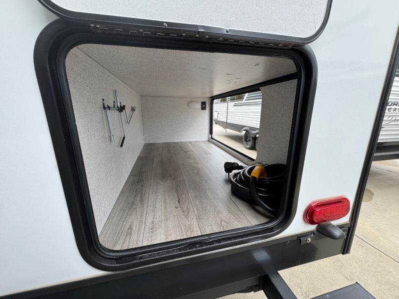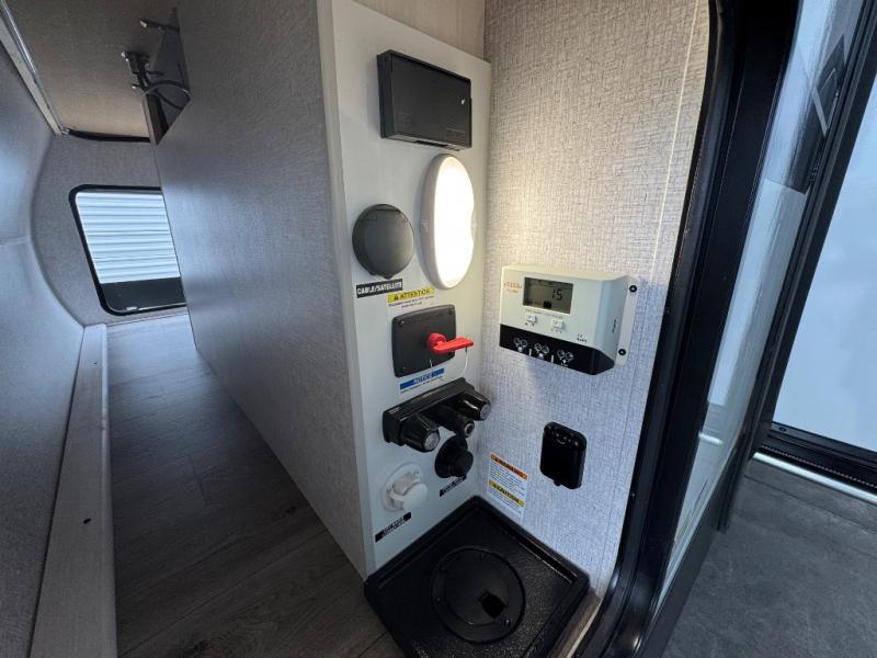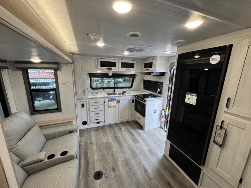 If you've been looking for a couple's trailer to take to the campground, this is the one! You will love the generous counter space in the front kitchen to prepare meals each day, and the tri-fold sofa with a removable dinette table provides a place to dine at. This furniture will also double as sleeping space for any guests you have, or you can choose the optional theater seat. A full bath with a radius shower, a sink, toilet, and linen closet will let you freshen up without having to use the camp's facilities. Head to the rear private bedroom for a great night's rest on the queen bed with dual wardrobes and overhead cabinets for your things. The exterior amenities are just as numerous as the interior with a universal docking station, cargo storage, and 1.6 cu. ft. outdoor refrigerator plus more!