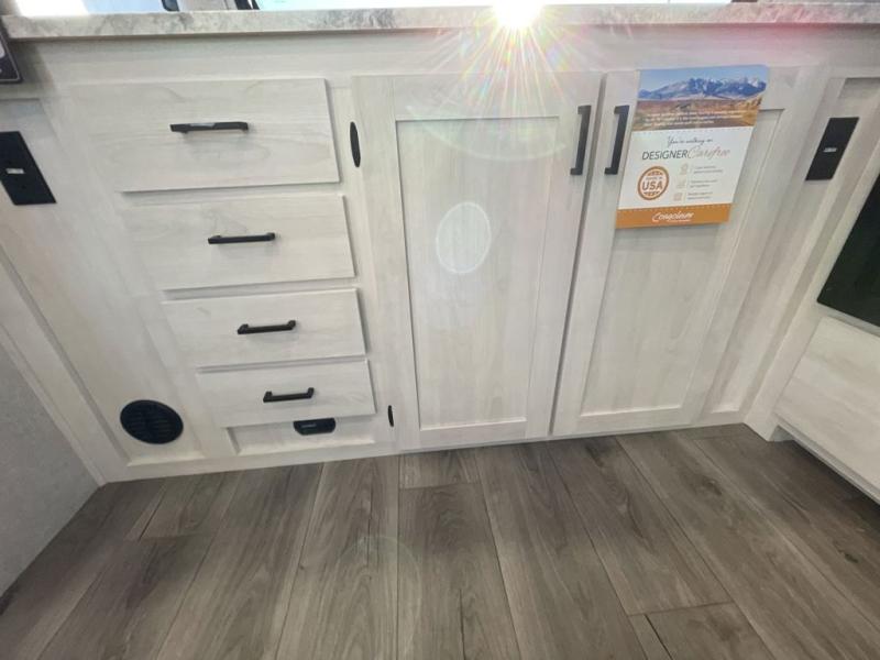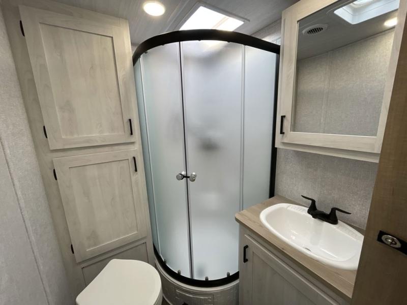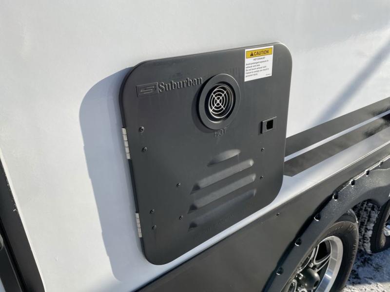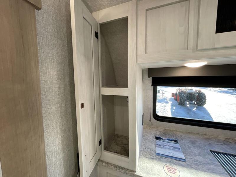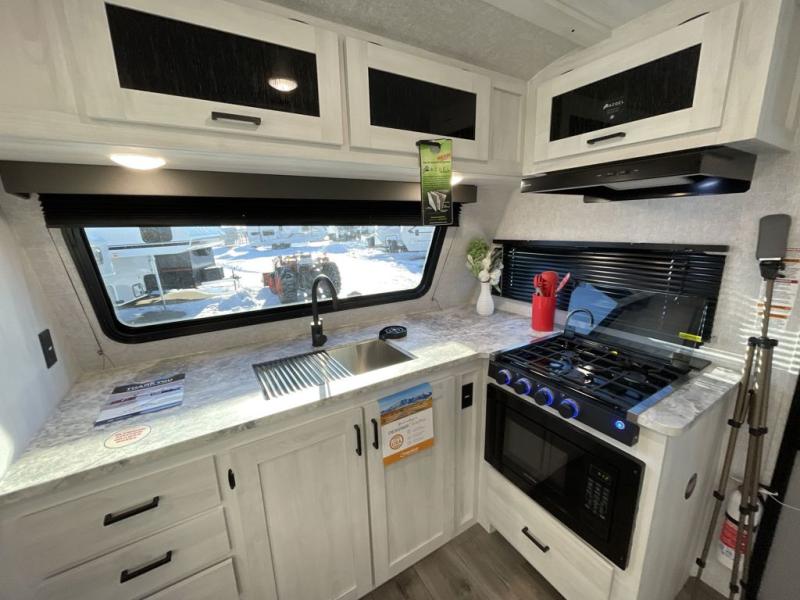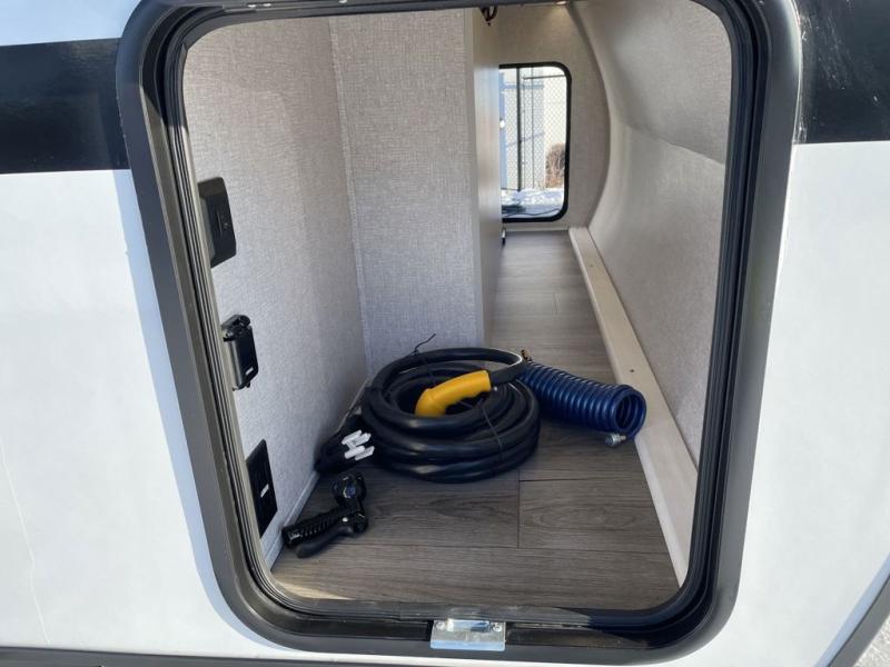 If you've been looking for a couple's trailer to take to the campground, this is the one! You will love the generous counter space in the front kitchen to prepare meals each day, and the tri-fold sofa with a removable dinette table provides a place to dine at. This furniture will also double as sleeping space for any guests you have, or you can choose the optional theater seat. A full bath with a radius shower, a sink, toilet, and linen closet will let you freshen up without having to use the camp's facilities. Head to the rear private bedroom for a great night's rest on the queen bed with dual wardrobes and overhead cabinets for your things. The exterior amenities are just as numerous as the interior with a universal docking station, cargo storage, and 1.6 cu. ft. outdoor refrigerator plus more!